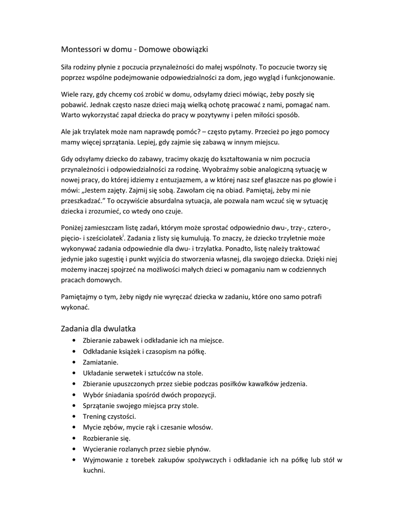 Montessori w domu - Domowe obowiązki Siła rodziny płynie z poczucia przynależności do małej wspólnoty. To poczucie tworzy się poprzez wspólne podejmowanie odpowiedzialności za dom, jego wygląd i funkcjonowanie. Wiele razy, gdy chcemy coś zrobić w domu, odsyłamy dzieci mówiąc, żeby poszły się pobawić. Jednak często nasze dzieci mają wielką ochotę pracować z nami, pomagać nam. Warto wykorzystać zapał dziecka do pracy w pozytywny i pełen miłości sposób. Ale jak trzylatek może nam naprawdę pomóc? – często pytamy. Przecież po jego pomocy mamy więcej sprzątania. Lepiej, gdy zajmie się zabawą w innym miejscu. Gdy odsyłamy dziecko do zabawy, tracimy okazję do kształtowania w nim poczucia przynależności i odpowiedzialności za rodzinę. Wyobraźmy sobie analogiczną sytuację w nowej pracy, do której idziemy z entuzjazmem, a w której nasz szef głaszcze nas po głowie i mówi: „Jestem zajęty. Zajmij się sobą. Zawołam cię na obiad. Pamiętaj, żeby mi nie przeszkadzać.” To oczywiście absurdalna sytuacja, ale pozwala nam wczuć się w sytuację dziecka i zrozumieć, co wtedy ono czuje. Poniżej zamieszczam listę zadań, którym może sprostać odpowiednio dwu-, trzy-, cztero-, pięcio- i sześciolateki. Zadania z listy się kumulują. To znaczy, że dziecko trzyletnie może wykonywać zadania odpowiednie dla dwu- i trzylatka. Ponadto, listę należy traktować jedynie jako sugestię i punkt wyjścia do stworzenia własnej, dla swojego dziecka. Dzięki niej możemy inaczej spojrzeć na możliwości małych dzieci w pomaganiu nam w codziennych pracach domowych. Pamiętajmy o tym, żeby nigdy nie wyręczać dziecka w zadaniu, które ono samo potrafi wykonać. Zadania dla dwulatka • • • • • • • • • • • • Zbieranie zabawek i odkładanie ich na miejsce. Odkładanie książek i czasopism na półkę. Zamiatanie. Układanie serwetek i sztućców na stole. Zbieranie upuszczonych przez siebie podczas posiłków kawałków jedzenia. Wybór śniadania spośród dwóch propozycji. Sprzątanie swojego miejsca przy stole. Trening czystości. Mycie zębów, mycie rąk i czesanie włosów. Rozbieranie się. Wycieranie rozlanych przez siebie płynów. Wyjmowanie z torebek zakupów spożywczych i odkładanie ich na półkę lub stół w kuchni. Zadania dla trzylatka i czterolatka • • • • • • • • • • • • • • • • • • • Nakrywanie do stołu. Odkładanie na miejsce produktów spożywczych. Pomoc przy układaniu listy zakupów spożywczych i przy zakupach. Czyszczenie i polerowanie butów. Karmienie domowego zwierzęcia według określonego harmonogramu. Podlewanie roślin domowych. Pomoc przy pracach na podwórku i w ogrodzie. Ścielenie łóżek. Odkurzanie. Pomoc przy zmywaniu i wkładaniu naczyń do zmywarki. Ścieranie kurzu z mebli. Smarowanie masłem kanapek. Przygotowanie płatków śniadaniowych z mlekiem na zimno. Pomoc przy przygotowywaniu talerzy z jedzeniem do rodzinnego obiadu. Przygotowywanie prostych deserów (galaretka, jogurt). Wyjmowanie listów ze skrzynki (o ile jest dla dziecka dostępna). Składanie wypranych rzeczy. Polerowanie srebra, mosiądzu i samochodu. Temperowanie ołówków. Flickr CC-BY-SA SugarPond Zadania dla pięciolatka Pomoc w planowaniu posiłków i zakupów spożywczych. Robienie sobie kanapek i prostego śniadania. Sprzątanie po sobie. Nalewanie sobie napoju. Nakrywanie do obiadu. Darcie liści sałaty do sałatki. Odmierzanie i wsypywanie/wlewanie składników według przepisu. Ścielenie łóżka i sprzątanie pokoju. Ubieranie się i wybieranie sobie stroju. Szorowanie zlewu, toalety i wanny. Czyszczenie luster i okien. Segregowanie ubrań do prania. Poprawne odbieranie telefonu i wybieranie numeru. Porządkowanie podwórka. Płacenie przy drobnych zakupach. Pomoc przy czyszczeniu samochodu. Wynoszenie śmieci. Pomoc przy podejmowaniu rodzinnych decyzji w sprawie wspólnego spędzania wolnego czasu. • Nauka wiązania sznurowadeł. • Karmienie domowych zwierząt i czyszczenie ich klatek/legowisk. • • • • • • • • • • • • • • • • • Flickr CC-BY-SA sean dreilinger Zadania dla sześciolatka • • • • • • • • • • • • • • Wybieranie ubrania odpowiednio do pogody. Trzepanie dywanów. Podlewanie roślin i kwiatów. Obieranie warzyw. Gotowanie prostego posiłku (tost, jajko na twardo). Przygotowanie sobie drugiego śniadania do szkoły. Odwieszanie swoich ubrań do szafy. Zbieranie drewna do kominka. Grabienie liści i pielenie chwastów. Wyprowadzanie psa na spacer. Wiązanie sobie butów. Opatrzenie drobnych skaleczeń i zadrapań. Utrzymywanie w czystości kosza na śmieci. Porządkowanie i czyszczenie szuflady na sztućce. Lista zadań jest opracowaniem fragmentu listyii zamieszczonej w artykule Maren Schmidt „Home responsibilities” opublikowanym w miesięczniku Tomorrow’s Child (Vol.19, No. 1) wydawanym przez The Montessori Foundation. Maren Schmidt jest wieloletnią dyplomowaną nauczycielką montessori (AMI), założycielką szkoły montessori w USA oraz autorką książki „Understanding Montessori – A Guide for Parents” (Zrozumieć Montessori – Przewodnik dla rodziców). Przedstawioną listę wykorzystywała przez 25 lat w swojej praktyce z dziećmi. Pierwotnie lista została opracowana na Wydziale Edukacji University of Arizona. Dominika Wojtyniak i Każde dziecko jest indywidualnością i dlatego podany zakres wiekowy jest tylko orientacyjny. ii Oryginalna lista jest dłuższa i przedstawia zadania dla dzieci w kolejnych przedziałach wiekowych aż do wieku nastoletniego.