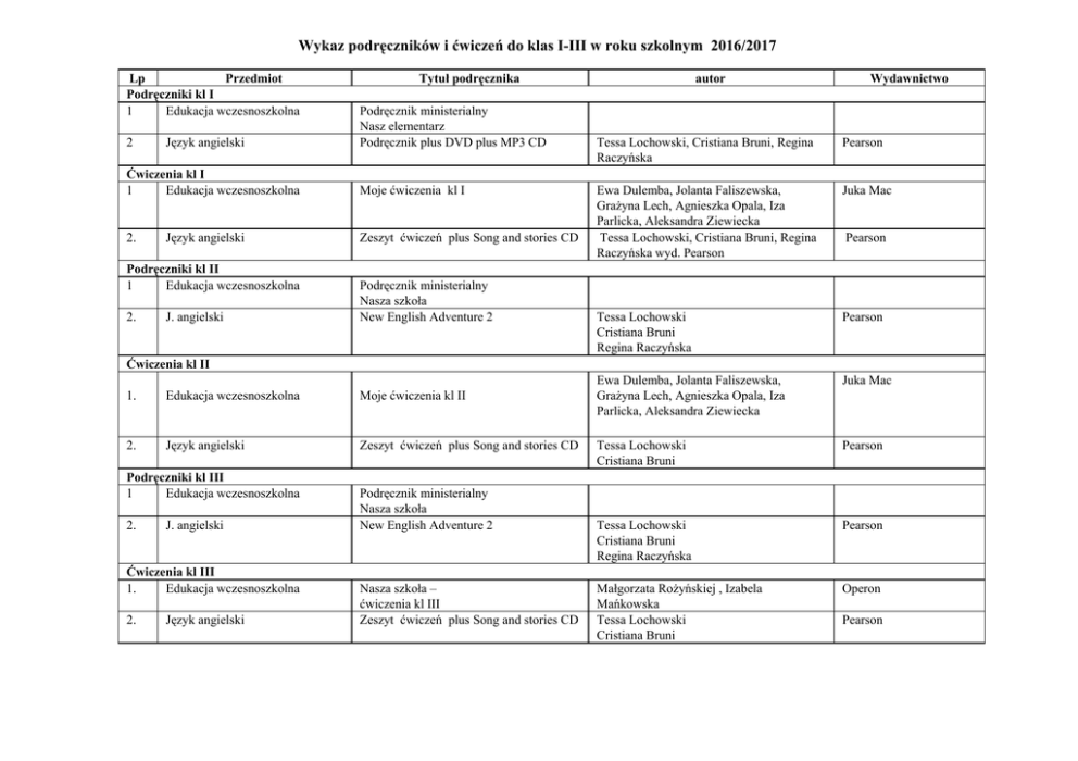 Wykaz podręczników i ćwiczeń do klas IIII w roku szkolnym 2016/2017 Lp Przedmiot Podręczniki kl I 1 Edukacja wczesnoszkolna 2 Język angielski Ćwiczenia kl I 1 Edukacja wczesnoszkolna Wydawnictwo Tessa Lochowski, Cristiana Bruni, Regina Raczyńska Pearson Moje ćwiczenia kl I Zeszyt ćwiczeń plus Song and stories CD Ewa Dulemba, Jolanta Faliszewska, Grażyna Lech, Agnieszka Opala, Iza Parlicka, Aleksandra Ziewiecka Tessa Lochowski, Cristiana Bruni, Regina Raczyńska wyd. Pearson Juka Mac Podręczniki kl II 1 Edukacja wczesnoszkolna 2. J. angielski Podręcznik ministerialny Nasza szkoła New English Adventure 2 Tessa Lochowski Cristiana Bruni Regina Raczyńska Pearson Ćwiczenia kl II 1. Edukacja wczesnoszkolna Moje ćwiczenia kl II Ewa Dulemba, Jolanta Faliszewska, Grażyna Lech, Agnieszka Opala, Iza Parlicka, Aleksandra Ziewiecka Juka Mac 2. Zeszyt ćwiczeń plus Song and stories CD Tessa Lochowski Cristiana Bruni Pearson Podręcznik ministerialny Nasza szkoła New English Adventure 2 Tessa Lochowski Cristiana Bruni Regina Raczyńska Pearson Nasza szkoła – ćwiczenia kl III Zeszyt ćwiczeń plus Song and stories CD Małgorzata Rożyńskiej , Izabela Mańkowska Tessa Lochowski Cristiana Bruni Operon Język angielski Język angielski Podręczniki kl III 1 Edukacja wczesnoszkolna 2. J. angielski Ćwiczenia kl III 1. Edukacja wczesnoszkolna 2. Język angielski autor Podręcznik ministerialny Nasz elementarz Podręcznik plus DVD plus MP3 CD 2. Tytuł podręcznika Pearson Pearson
