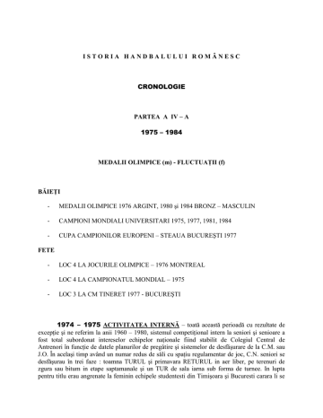 ISTORIA HANDBALULUI ROMÂNESC CRONOLOGIE PARTEA A IV – A 1975 – 1984 MEDALII OLIMPICE (m) - FLUCTUAŢII (f) BĂIEŢI - MEDALII OLIMPICE 1976 ARGINT, 1980 şi 1984 BRONZ – MASCULIN - CAMPIONI MONDIALI UNIVERSITARI 1975, 1977, 1981, 1984 - CUPA CAMPIONILOR EUROPENI – STEAUA BUCUREŞTI 1977 FETE - LOC 4 LA JOCURILE OLIMPICE – 1976 MONTREAL - LOC 4 LA CAMPIONATUL MONDIAL – 1975 - LOC 3 LA CM TINERET 1977 - BUCUREŞTI 1974 – 1975 ACTIVITATEA INTERNĂ – toată această perioadă cu rezultate de excepţie şi ne referim la anii 1960 – 1980, sistemul competiţional intern la seniori şi senioare a fost total subordonat intereselor echipelor naţionale fiind stabilit de Colegiul Central de Antrenori în funcţie de datele planurilor de pregătire şi sistemelor de desfăşurare de la C.M. sau J.O. În acelaşi timp având un numar redus de săli cu spaţiu regulamentar de joc, C.N. seniori se desfăşurau în trei faze : toamna TURUL şi primavara RETURUL in aer liber, pe terenuri de zgura sau bitum in etape saptamanale şi un TUR de sala iarna sub forma de turnee. In lupta pentru titlu erau angrenate la feminin echipele studentesti din Timişoara şi Bucuresti carara li se alaturau temporar Rapidul, Progresul şi Confectia din Bucuresti precum şi CSM Sibiu şi Muresul Tg.Mures. În aceasta perioada Bucurestiul a avut in Divizia A trei, patru şi chiar cinci echipe, iar Timişoara doua. La masculin concurau pentru podium echipele militare : Steaua şi Dinamo, alaturi de care au fost la inceput Rapid şi Universitatea Bucuresti şi sporadic ŞTIINŢA şi Tehnometal din Timişoara, iar in ultimii ani Dinamo Brasov şi Universitatea Cluj. C.N. Editia 17-a, 1974-1975, Categoria A feminin senioare 1. 2. 3. 4. Universitatea Timişoara – antrenor: CONSTANTIN LACHE Universitatea Bucuresti – antrenor: CONSTANTIN POPESCU PILICĂ Progresul Bucuresti – antrenor: SIMION POMPILIU Textila Buhuşi; 5. I.E.F.S. Bucureşti; 6. Confecţia Bucureşti; 7. Voinţa Odorhei; 8. Rapid Bucureşti; 9. Constructorul Timişoara; 10. Mureşul Tg. Mureş; 11. Universitatea Iaşi; 12. Sparta Mediaş. Universitatea TIMIŞOARA- CAMPIOANĂ NAŢIONALĂ SENIOARE 1975: HRISTOV CORNELIA, IONESCU ELISABETA, STAN LIDIA, SAUER EDELTRAUT, STAICOVICI ELENA, PETROVICI CRISTINA, POPA TEREZA, COJOCARU DOINA, LUŢAS IBADUL-NADIRE, IORDACHE NICULINA, HRIVNAC HILDA, GHEORGHE ELENA, CÂMPEANU IOLANDA, FLEŞERIU DORINA, CARBAN ADRIANA. Continua disputa apriga la varf TIMIŞOARA – BUCURESTI, avand protagonisti pe profesorii COSTICA LACHE şi PILICĂ POPESCU, inceputa inca din anii 1960 la handbal in 11 jucatori, cand de partea Timisoarei erau şi WALTER MEITHERT, NICOLAE PARSCH, LADISLAU BARA şi GABRIEL ZUGRAVESCU. Mai tarziu la handbal in 7 jucatori au mai fost direct implicati, in afara celor de mai sus şi CONSTANTIN JUDE, VICTOR CHITA şi CONSTANTIN POPA din Timişoara, iar din Bucuresti FRANCISC SPIER, IOAN BOTA şi SIMION POMPILIU. C.N. Editia 17-a, 1974-1975, Categoria A masculin-seniori 1. Steaua Bucuresti – antrenori: CORNEL OŢELEA, OTTO TELLMAN 2. Dinamo Bucuresti – antrenor: OPREA VLASE 3. Minaur Baia Mare – antrenor: LASCĂR PANĂ 4. Ştiinţa Bacău; 5. Universitatea Bucureşti; 6. Politehnica Timişoara; 7. Dinamo Braşov; 8. Univ. Cluj-Napoca; 9. Carom Gh. Gh. Dej; 10. CSU Galaţi; 11. Independenţa Sibiu; 12. Univ. Craiova. STEAUA BUCUREŞTI- CAMPIOANĂ NAŢIONALĂ SENIORI (m) 1975: ORBAN ŞTEFAN, DINCĂ ALEXANDRU, MUNTEANU NICOLAE, DRĂGĂNIŢĂ CEZAR, KICSID GABRIEL, VOINEA RADU, TUDOSE CONSTANTIN, STŐCKL WERNER, BIRTALAN ŞTEFAN, MARINESCU MIHAIL, COASA TEODOR, CAPRA VASILE, GAŢU CRISTIAN, JENEA DUMITRU. Este al 5-lea titlu consecutiv pentru cuplul OŢELEA / TELLMAN şi tot pentru a 5-a oara pe locul secund OPREA VLASE (dupa ce 8 ani fusese campion) care constatam ca tine piept singur in al 17-lea an celor de la Steaua, unde s-au mai perindat pe la conducere şi IOAN KUNST GHERMANESCU, COSMA LITA, OCTAVIAN NITESCU şi OLIMPIU NODEA. Subliniem aparitia in premiera pe podium a echipei din Baia Mare, o surpriza dar explicabila prin prezenta ca antrenor a lui LASCĂR PANĂ care recidiva dupa ce in anul 1968 urcase pe podium, tot in premiera, o echipa din moldova (Dinamo Bacău). CAMPIONATUL REPUBLICAN (NAŢIONAL) CATEGORIA B organizat in sistem Divizie pe doua serii Est – Vest a cate 10 echipe, tur – retur s-a desfaturat cu regularitate in mijlocul unui interes deosebit mai ales in vechi centre handbalistice: Lugoj, Resita, Fagaras, Copsa Mica, Teleajen (Ploiesti) şi Bucuresti cu Locomotiva CFR una din primele echipe de handbal masculin infiintate in capitala (1934). Capii de serie la feminin – Rulmentul Brasov (antrenor FERENC LECHNER) şi Constructorul Baia Mare (antrenor IOAN TEGHEN) iar la masculin – Rafinaria Teleajen (antrenor ION ILIESCU) şi ASA Tg.Mures (antrenor LUDOVIC BEREKMERY), vor promova in categoria A. CAMPIONATUL DE CALIFICARE AL SENIORILOR pentru promovare in Divizia B s-a organizat in etape pe oras, municipiu, judet, interjudetean pe cate patru serii a cate 4 echipe şi cu un turneu final tot de patru echipe. Au promovat in Categoria B, la feminin ŞTIINŢA Bacău – antrenor EUGEN BARTHA, Spartac Bucuresti, Progresul Corabia şi CIL Tr. Severin, iar la masculin CSU Suceava – antrenor SERBAN POP, CSU Tg.Mures, Petrochimistul Brazi şi Vointa Sebes – antrenor FLORIN FLESERIU. CAMPIONATUL REPUBLICAN AL JUNIORILOR şi SCOLARILOR, s-a aorganizat in sistem Divizie in 6 serii dupa criterii geografice, a cate 8 echipe (baieti şi fete) care jucau in etape saptamanale, tur-retur, fiecare cu fiecare. Formula aceasta s-a dovedit de-a lungul timpului una din cele mai bune; 96 de echipe cu circa 1500 juniori (junioare) erau angrenate intr-un program continuu cu 14 etape de-a lungul anului scolar, iar cei mai buni mai sustineau 5 meciuri in turneul final. C.N. Junioare I, Editia 14-a, 1974-1975, Turneul final la Calarasi 1. 2. 3. 4. Scoala Sportiva pentru Elevi Hunedoara – a