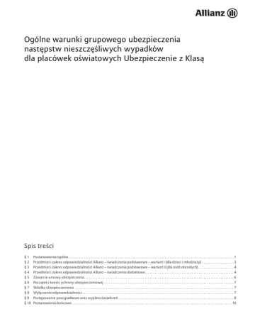 Ogólne warunki grupowego ubezpieczenia następstw nieszczęśliwych wypadków dla placówek oświatowych Ubezpieczenie z Klasą Spis treści § 1 Postanowienia ogólne . . . . . . . . . . . . . . . . . . . . . . . . . . . . . . . . . . . . . . . . . . . . . . . . . . . . . . . . . . . . . . . . . . . . . . . . . . . . . . . . . . . . . . . . . . . . . . . . . 1 § 2 Przedmiot i zakres odpowiedzialności Allianz – świadczenia podstawowe – wariant I (dla dzieci i młodzieży) . . . . . . . . . . . . . . . . . . . 3 § 3 Przedmiot i zakres odpowiedzialności Allianz – świadczenia podstawowe – wariant II (dla osób dorosłych) . . . . . . . . . . . . . . . . . . . . . 4 § 4 Przedmiot i zakres odpowiedzialności Allianz – świadczenia dodatkowe . . . . . . . . . . . . . . . . . . . . . . . . . . . . . . . . . . . . . . . . . . . . . . . . . . . . 4 § 5 Zawarcie umowy ubezpieczenia . . . . . . . . . . . . . . . . . . . . . . . . . . . . . . . . . . . . . . . . . . . . . . . . . . . . . . . . . . . . . . . . . . . . . . . . . . . . . . . . . . . . . . . . 6 § 6 Początek i koniec ochrony ubezpieczeniowej . . . . . . . . . . . . . . . . . . . . . . . . . . . . . . . . . . . . . . . . . . . . . . . . . . . . . . . . . . . . . . . . . . . . . . . . . . . . . 7 § 7 Składka ubezpieczeniowa . . . . . . . . . . . . . . . . . . . . . . . . . . . . . . . . . . . . . . . . . . . . . . . . . . . . . . . . . . . . . . . . . . . . . . . . . . . . . . . . . . . . . . . . . . . . . . 7 § 8 Wyłączenia odpowiedzialności . . . . . . . . . . . . . . . . . . . . . . . . . . . . . . . . . . . . . . . . . . . . . . . . . . . . . . . . . . . . . . . . . . . . . . . . . . . . . . . . . . . . . . . . . 7 § 9 Postępowanie powypadkowe oraz wypłata świadczeń . . . . . . . . . . . . . . . . . . . . . . . . . . . . . . . . . . . . . . . . . . . . . . . . . . . . . . . . . . . . . . . . . . . . 8 § 10 Postanowienia końcowe . . . . . . . . . . . . . . . . . . . . . . . . . . . . . . . . . . . . . . . . . . . . . . . . . . . . . . . . . . . . . . . . . . . . . . . . . . . . . . . . . . . . . . . . . . . . . . . 10 § 1 Postanowienia ogólne 1. Na podstawie niniejszych ogólnych warunków ubezpieczenia, zwanych dalej o.w.u., TUiR Allianz Polska S.A., zwane dalej Allianz, zawiera umowy grupowego ubezpieczenia następstw nieszczęśliwych wypadków na rachunek Ubezpieczonych z osobami prawnymi oraz jednostkami organizacyjnymi, nieposiadającymi osobowości prawnej, zwanymi dalej Ubezpieczającymi, którzy zapoznali się z niniejszymi o.w.u. przed zawarciem umowy. 2. Przedmiotem ubezpieczenia jest zdrowie Ubezpieczonego oraz następstwa nieszczęśliwych wypadków. 3. Ochroną ubezpieczeniową objęte są następstwa nieszczęśliwych wypadków, które wystąpiły w okresie ochrony ubezpieczeniowej. 4. Umowę ubezpieczenia można zawrzeć w jednym z dwóch z następujących wariantów: – wariant I (przeznaczony dla dzieci i młodzieży) lub – wariant II (przeznaczony dla osób dorosłych) albo w obu wariantach jednocześnie. 5. Ubezpieczający (lub pełnomocnik zawierający w jego imieniu umowę) zobowiązany jest podać do wiadomości Allianz wszystkie znane sobie okoliczności, o które Allianz pytał przed zawarciem umowy ubezpieczenia, jak również zobowiązany jest zgłaszać zmiany ww. okoliczności niezwłocznie po otrzymaniu ich do wiadomości. W przypadku podania niezgodnych z prawdą okoliczności lub ich zatajenia Allianz nie ponosi odpowiedzialności za skutki okoliczności, które z naruszeniem powyższych obowiązków nie zostały podane do jego wiadomości. 6. Na Ubezpieczającym spoczywa obowiązek udostępnienia Ubezpieczonym (a w przypadku gdy Ubezpieczony jest niepełnoletni – jego przedstawicielowi ustawowemu) niniejszych o.w.u. wraz z załącznikiem oraz Tabeli oceny procentowej trwałego uszczerbku na zdrowiu wskutek nieszczęśliwego wypadku wraz z załączonym do niej suplementem. 7. Użyte w niniejszych o.w.u. określenia oznaczają: 1) amatorskie uprawianie sportu – aktywność sportowa Ubezpieczonego, której celem jest odpoczynek i rozrywka; 2) amatorskie uprawianie sportów wysokiego ryzyka – amatorskie uprawianie następujących sportów: motorowych lub motorowodnych, powietrznych, speleologii, wspinaczki górskiej i skałkowej przy użyciu sprzętu zabezpieczającego lub asekuracyjnego lub wymagającej użycia takiego sprzętu, raftingu i wszystkich jego odmian, nurkowania przy użyciu specjalistycznego sprzętu, kitesurfingu, heliskiingu, heliboardingu, skoków na gumowej linie, a także uczestniczenie w wyprawach survivalowych lub wyprawach do miejsc charakteryzujących się ekstremalnymi warunkami klimatycznymi czy przyrodniczymi, typu pustynia, wysokie góry (powyżej 5500 m n. p. m.), busz, bieguny, dżungla i tereny lodowcowe lub śnieżne wymagające użycia sprzętu zabezpieczającego lub asekuracyjnego; 3) akt przemocy – skierowanie czynności fizycznej bezpośrednio przeciwko Ubezpieczonemu, co zniewala go do poddania się woli używającego przemocy i określonego zachowania się lub przeciwko rzeczy posiadanej przez Ubezpieczonego, przez co swoboda woli Ubezpieczonego – w zakresie posiadania rzeczy czy władania nią lub korzystania z niej – zostaje ograniczona; 4) akt terroru – nielegalne akcje, które organizowane są z pobudek ideologicznych lub politycznych, indywidualne lub grupowe, skierowane przeciwko osobom lub obiektom w celu wprowadzenia chaosu, zastraszenia ludności i dezorganizacji życia publicznego przy użyciu przemocy oraz skierowane przeciw społeczeństwu z zamiarem jego zastraszenia dla osiągnięcia celów politycznych lub społecznych; –1– 5) Centrum Operacyjne – Mondial Assistance Sp. z o.o. z siedzibą w Warszawie przy ulicy Domaniewskiej 50B – przedstawiciel Allianz udzielający transportu medycznego oraz świadczeń opiekuńczych, którego numer telefonu podany jest do wiadomości Ubezpieczonych przez Allian