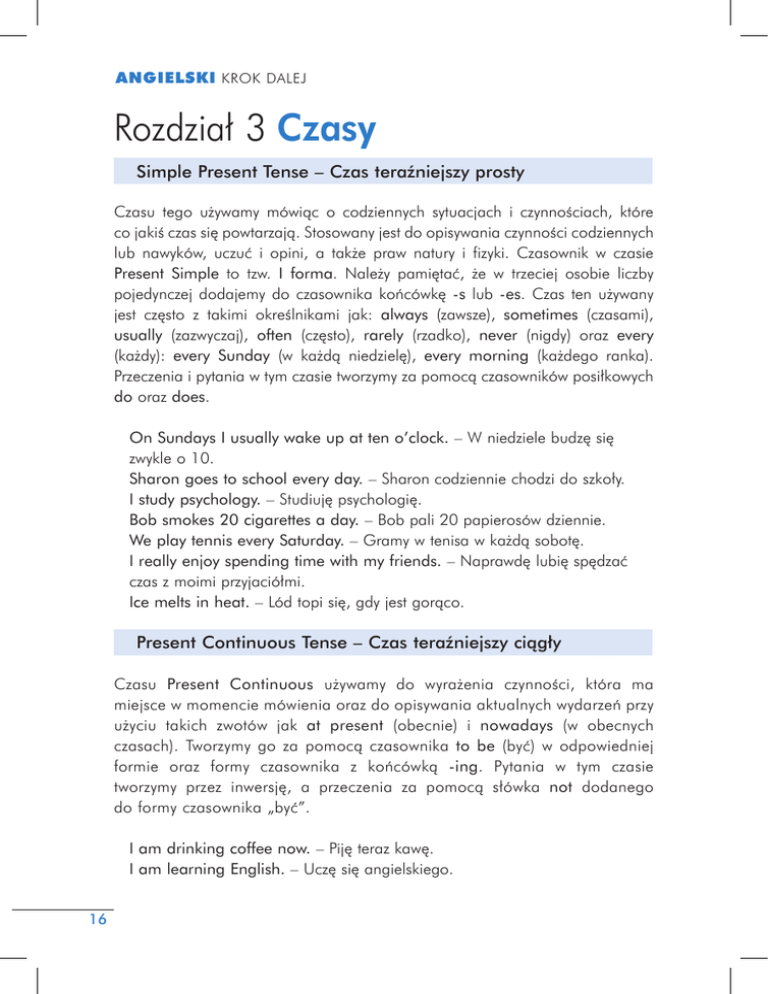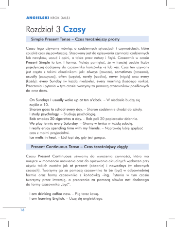 ANGIELSKI KROK DALEJ Rozdział 3 Czasy Simple Present Tense – Czas teraźniejszy prosty Czasu tego używamy mówiąc o codziennych sytuacjach i czynnościach, które co jakiś czas się powtarzają. Stosowany jest do opisywania czynności codziennych lub nawyków, uczuć i opini, a także praw natury i fizyki. Czasownik w czasie Present Simple to tzw. I forma. Należy pamiętać, że w trzeciej osobie liczby pojedynczej dodajemy do czasownika końcówkę -s lub -es. Czas ten używany jest często z takimi określnikami jak: always (zawsze), sometimes (czasami), usually (zazwyczaj), often (często), rarely (rzadko), never (nigdy) oraz every (każdy): every Sunday (w każdą niedzielę), every morning (każdego ranka). Przeczenia i pytania w tym czasie tworzymy za pomocą czasowników posiłkowych do oraz does. On Sundays I usually wake up at ten o’clock. – W niedziele budzę się zwykle o 10. Sharon goes to school every day. – Sharon codziennie chodzi do szkoły. I study psychology. – Studiuję psychologię. Bob smokes 20 cigarettes a day. – Bob pali 20 papierosów dziennie. We play tennis every Saturday. – Gramy w tenisa w każdą sobotę. I really enjoy spending time with my friends. – Naprawdę lubię spędzać czas z moimi przyjaciółmi. Ice melts in heat. – Lód topi się, gdy jest gorąco. Present Continuous Tense – Czas teraźniejszy ciągły Czasu Present Continuous używamy do wyrażenia czynności, która ma miejsce w momencie mówienia oraz do opisywania aktualnych wydarzeń przy użyciu takich zwotów jak at present (obecnie) i nowadays (w obecnych czasach). Tworzymy go za pomocą czasownika to be (być) w odpowiedniej formie oraz formy czasownika z końcówką -ing. Pytania w tym czasie tworzymy przez inwersję, a przeczenia za pomocą słówka not dodanego do formy czasownika „być”. I am drinking coffee now. – Piję teraz kawę. I am learning English. – Uczę się angielskiego. 16 GRAMATYKA Tom is studying at Oxford. – Tom studiuje w Oxfordzie. You can turn off the TV, I’m not watching it. – Możesz wyłączyć telewizor, nie oglądam go. Are they working in the garden now? – Czy oni pracują teraz w ogrodzie? Simple Past Tense – Czas przeszły prosty Jeżeli chcemy wyrazić czynność, która odbyła się i zakończyła w przeszłości, użyjemy czasu Simple Past. Charakterystyczne dla tego czasu są określenia takie jak: yesterday (wczoraj), last year (w zeszłym roku), two days ago (dwa dni temu). Używamy go na przykład opowiadając o zdarzeniach z przeszłości. Czas przeszły tworzymy przez dodanie do czasowników regularnych końcówki -ed (II forma czasownika). Czasowniki nieregularne mają zupełnie inną formę w tym czasie. Ich lista znajduje się na końcu tej książki. Tworząc pytania oraz przeczenia używamy czasownika posiłkowego did. Czasownik to be przybiera w tym czasie formę was dla pierwszej i trzeciej osoby liczby pojedynczej oraz were dla pozostałych osób. I booked a hotel in New York on Monday. – W poniedziałek zarezerwowałem hotel w Nowym Jorku. I had a car accident this morning. – Dziś rano miałem wypadek samochodowy. We sold our old house two days ago. – Dwa dni temu sprzedaliśmy nasz stary dom. Did you buy a car yesterday? – Czy kupiłeś wczoraj samochód? We didn’t go on holiday last summer. – Zeszłego lata nie pojechaliśmy na wakacje. I was ill last week. – Byłam chora w zeszłym tygodniu. We were in Spain last summer. – Zeszłego lata byliśmy w Hiszpanii. Present Perfect Tense – Czas Present Perfect Present Perfect nie ma odpowiednika w języku polskim. Może on wyrażać zarówno przeszłość, jak i teraźniejszość. Czas ten tworzymy przy użyciu czasownika posiłkowego have + III forma czasownika lub has + III forma dla trzeciej osoby liczby pojedynczej. www.jezykiobce.pl 17 ANGIELSKI KROK DALEJ I have been to Paris twice. – Byłam w Paryżu dwa razy. Have you ever tried Chinese food? – Czy próbowałeś kiedyś chińskiego jedzenia? John has never ridden a horse. – John nigdy nie jeździł konno. Their kids have never been punished. – Ich dzieci nigdy nie zostały ukarane. Czasu Present Perfect używamy, kiedy mówimy o: •czynnościach, które zaczęły się w przeszłości, ale trwają nadal, często z przyimkami for oraz since (przez, od) lub so far (dotąd, do tej pory): Jake has worked as a teacher for 15 years. – Jim pracuje jako nauczyciel od 15 lat. We have lived here since 1999. – Mieszkamy tu od 1999 roku. We have been friends since high school. – Jesteśmy przyjaciółmi od szkoły średniej. I haven’t seen Paris so far. – Do tej pory jeszcze nie widziałam Paryża. •czynnościach, które miały miejsce w przeszłości, ale ich skutek jest widoczny w teraźniejszości: I have lost my money. – Zgubiłem pieniądze. (teraz nie mam pieniędzy) Oh, no! I’ve cut my finger! – O nie! Skaleczyłem się w palec! (teraz mnie boli) Jim has had a car accident. – Jim miał wypadek samochodowy. (teraz jest w szpitalu) •czynności przeszłej, bliżej nieokreślonej w czasie: I’ve read this book before. – Czytałam już tę książkę. We have been to Prague three times. – Byliśmy w Pradze trzy razy. •czynności dopiero co ukończonej, używając określeń typu: just (właśnie, dopiero co), already (już), yet (jeszcze), recently (ostatnio): I have just finished my homework. – Właśnie skończyłem pracę domową. Susan has already gone to work. – Susan już wyszła do pracy. 18 GRAMATYKA I haven’t invited Peter to my party yet. – Jeszcze nie zaprosiłem Petera na moje przyjęcie. It hasn’t rained much recently. – Ostatnio nie padało zbyt dużo. Simple Future Tense – Czas przyszły prosty Czasu Future Simple używamy do wyrażenia przyszłości, w szczególności czynności, o których decydujemy spontanicznie, w chwili mówienia. Czas przyszły tworzymy przez dodanie will (‘ll) do czasownika. Dla wszystkich os
