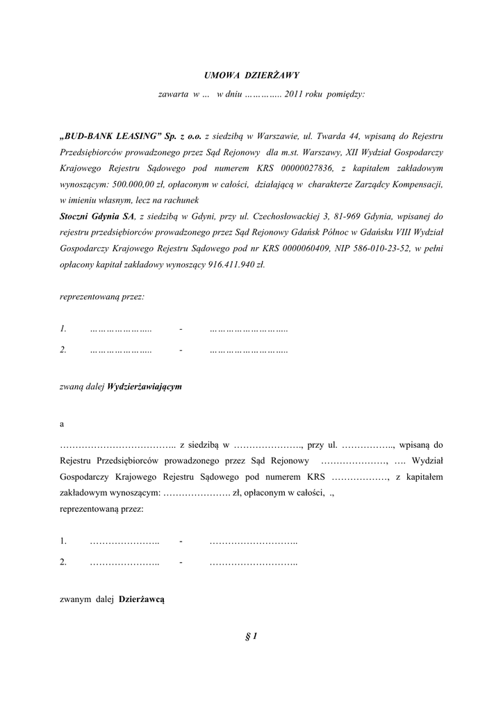 UMOWA DZIERŻAWY zawarta w … w dniu ………….. 2011 roku pomiędzy: „BUD-BANK LEASING” Sp. z o.o. z siedzibą w Warszawie, ul. Twarda 44, wpisaną do Rejestru Przedsiębiorców prowadzonego przez Sąd Rejonowy dla m.st. Warszawy, XII Wydział Gospodarczy Krajowego Rejestru Sądowego pod numerem KRS 00000027836, z kapitałem zakładowym wynoszącym: 500.000,00 zł, opłaconym w całości, działającą w charakterze Zarządcy Kompensacji, w imieniu własnym, lecz na rachunek Stoczni Gdynia SA, z siedzibą w Gdyni, przy ul. Czechosłowackiej 3, 81-969 Gdynia, wpisanej do rejestru przedsiębiorców prowadzonego przez Sąd Rejonowy Gdańsk Północ w Gdańsku VIII Wydział Gospodarczy Krajowego Rejestru Sądowego pod nr KRS 0000060409, NIP 586-010-23-52, w pełni opłacony kapitał zakładowy wynoszący 916.411.940 zł. reprezentowaną przez: 1. ………………….. - ……………………….. 2. ………………….. - ……………………….. zwaną dalej Wydzierżawiającym a ……………………………….. z siedzibą w …………………., przy ul. …………….., wpisaną do Rejestru Przedsiębiorców prowadzonego przez Sąd Rejonowy …………………, …. Wydział Gospodarczy Krajowego Rejestru Sądowego pod numerem KRS ………………, z kapitałem zakładowym wynoszącym: …………………. zł, opłaconym w całości, ., reprezentowaną przez: 1. ………………….. - ……………………….. 2. ………………….. - ……………………….. zwanym dalej Dzierżawcą §1 1. Wydzierżawiający oddaje Dzierżawcy do używania i pobierania pożytków część, całorocznego ośrodka wypoczynkowego – Centrum Wypoczynkowe „Wieżyca”, położonego w Szymbarku, gmina Stężyca, woj. pomorskie, zwanego w dalszej części niniejszej umowy CW Wieżyca. 2. Stanowiąca przedmiot niniejszej umowy dzierżawy część CW Wieżyca zlokalizowana jest na gruncie o powierzchni 79.671 m2, obejmującym stanowiące własność Gminy Stężyca, a znajdujące się w wieczystym użytkowaniu Stoczni Gdynia S.A. nieruchomości gruntowe zabudowane budynkami oraz budowlami, które stanowią odrębną własność Stoczni Gdynia S.A., dla których Sąd Rejonowy w Kartuzach, V Wydział Ksiąg Wieczystych prowadzi księgi wieczyste KW nr GD1R/00032495/2 oraz KW nr GD1R/00016399/1. Mapa wskazująca lokalizację nieruchomości stanowiących przedmiot dzierżawy stanowi załącznik nr 1 do niniejszej umowy. 3. Szczegółowy wykaz nieruchomości gruntowych a także budynków, budowli oraz środków trwałych i wyposażenia stanowiących przedmiot niniejszej Umowy przedstawiony został w załączniku nr 2 do niniejszej Umowy. 4. Przedmiotu niniejszej umowy nie stanowią: - budynek baru gastronomicznego, o powierzchni 181 m2, zlokalizowany na działce nr 611, położony przy drodze gminnej Szymbark – Ostrzyce; -budynek sklepu, o powierzchni 29 m kw, zlokalizowany na działce 559/5, przy drodze gminnej Szymbark – Ostrzyce; wraz z fragmentami działek, na których zlokalizowane są obydwa wyżej wymienione budynki, o łącznej powierzchni 1800 m2; - budynek usługowo – mieszkalny zlokalizowany na działce nr 559/5; - budynek magazynowy przystani OW3 ( wraz z kładką stalową położoną nad drogą ); - droga kołowa dojazdowa z płyt żelbetowych; - nabrzeże umocnione drewniano – betonowe nad Jeziorem Ostrzyckim; - przystań sportowa drewniana z pomostami zlokalizowana nad Jeziorem Ostrzyckim; 5.1 W dacie zawarcia niniejszej umowy Stocznia Gdynia SA znajduje się w posiadaniu samoistnym następujących budynków i budowli: - budynku magazynowego przystani OW3 ( wraz z kładką stalową położoną nad drogą ); - drogi kołowej dojazdowej z płyt żelbetowych; - nabrzeża umocnionego drewniano – betonowego przy Jeziorze Ostrzyckim; - przystani sportowej drewnianej z pomostami zlokalizowanej nad Jeziorem Ostrzyckim; W odniesieniu do wyżej wymienionych przedmiotów Stocznia Gdynia SA nie posiada udokumentowanego prawa własności. 5.2 Wydzierżawiający oddaje w użyczenie wymienione w pkt 5.1 przedmioty Dzierżawcy. 5.3 Dzierżawca oświadcza, iż zapoznał się ze stanem technicznym wyżej wymienionych budowli we własnym zakresie i nie wnosi do niego zastrzeżeń. Dzierżawca oświadcza, iż został poinformowany o stanie prawnym nieruchomości gruntowych, na których są zlokalizowane wyżej wymienione obiekty. Dzierżawca uprawniony jest do korzystania z użyczonych przedmiotów zgodnie z ich przeznaczeniem, w granicach w jakich korzystał z nich Wydzierżawiający. 5.4 Umowa użyczenia zawarta jest na rok, począwszy od daty wejścia w życie niniejszej umowy. 5.5 Dzierżawca zobowiązuje się do utrzymywania przedmiotów użyczenia w stanie zdatnym do użytku. Dzierżawca zrzeka się dochodzenia wszelkich roszczeń mogących powstać w przyszłości, w tym w szczególności roszczeń związanych z korzystaniem z przedmiotów użyczonych oraz zwrot nakładów za wyjątkiem roszczeń o zwrot nakładów, na których poniesienie pisemnie wyraził zgodę Wydzierżawiający. Dzierżawca zrzeka się wszelkich roszczeń wobec Wydzierżawiającego, których tytułem mogłoby być wezwanie do wydania przedmiotów użyczenia przed upływem terminu, na który została zawarta umowa. 5.6 Dzierżawca zobowiązuję się do ubezpieczenia wydanych w ramach użyczenia przedmiotów oraz ponoszenia wszelkich ciężarów i opłat w granicach w jakich ponosił je Wydzierżawiający na zasadach analogicznych jak w odniesieniu do przedmiotu dzierżawy. 5.7 Wydanie przedmiotów wskazanych w pkt 5.1 nastąpi na podstawie protokołu, na zasadach określonych w pkt § 1 pkt 6. 6. Wydanie przedmiotu dzierżawy Dzierżawcy, a także zwrotne jego przekazanie Wydzierżawiającemu nastąpi na podstawie protokołów zdawczo-odbiorczych. Wydanie przedmiotu dzierżawy nastąpi w terminie 3 dni od daty wejścia w życie niniejszej umowy. Zwrotne przekazanie przedmiotu 