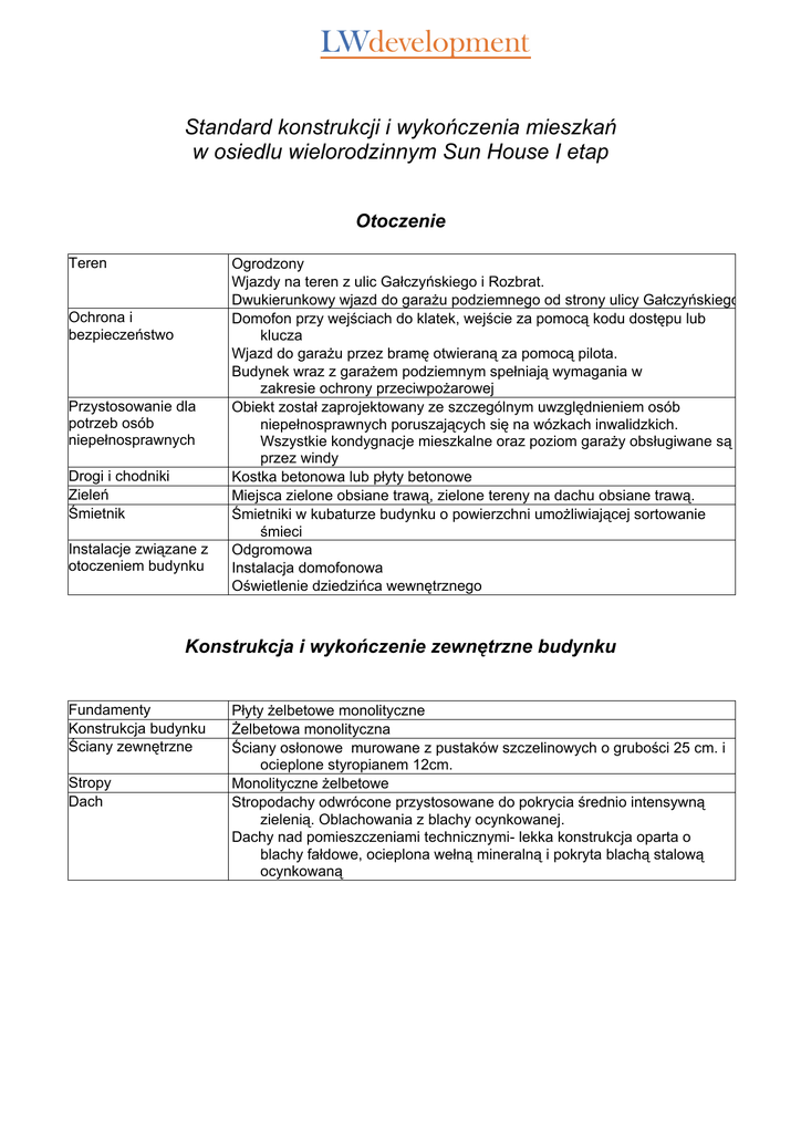 Standard konstrukcji i wykończenia mieszkań w osiedlu wielorodzinnym Sun House I etap Otoczenie Teren Ochrona i bezpieczeństwo Przystosowanie dla potrzeb osób niepełnosprawnych Drogi i chodniki Zieleń Śmietnik Instalacje związane z otoczeniem budynku Ogrodzony Wjazdy na teren z ulic Gałczyńskiego i Rozbrat. Dwukierunkowy wjazd do garażu podziemnego od strony ulicy Gałczyńskiego Domofon przy wejściach do klatek, wejście za pomocą kodu dostępu lub klucza Wjazd do garażu przez bramę otwieraną za pomocą pilota. Budynek wraz z garażem podziemnym spełniają wymagania w zakresie ochrony przeciwpożarowej Obiekt został zaprojektowany ze szczególnym uwzględnieniem osób niepełnosprawnych poruszających się na wózkach inwalidzkich. Wszystkie kondygnacje mieszkalne oraz poziom garaży obsługiwane są przez windy Kostka betonowa lub płyty betonowe Miejsca zielone obsiane trawą, zielone tereny na dachu obsiane trawą. Śmietniki w kubaturze budynku o powierzchni umożliwiającej sortowanie śmieci Odgromowa Instalacja domofonowa Oświetlenie dziedzińca wewnętrznego Konstrukcja i wykończenie zewnętrzne budynku Fundamenty Konstrukcja budynku Ściany zewnętrzne Stropy Dach Płyty żelbetowe monolityczne Żelbetowa monolityczna Ściany osłonowe murowane z pustaków szczelinowych o grubości 25 cm. i ocieplone styropianem 12cm. Monolityczne żelbetowe Stropodachy odwrócone przystosowane do pokrycia średnio intensywną zielenią. Oblachowania z blachy ocynkowanej. Dachy nad pomieszczeniami technicznymi- lekka konstrukcja oparta o blachy fałdowe, ocieplona wełną mineralną i pokryta blachą stalową ocynkowaną Garaże wielostanowiskowe Fundamenty Stropy Ściany zewnętrzne, wewnętrzne, konstrukcyjne i słupy Posadzki Drzwi Wrota wjazd/wyjazd Instalacje Płyty żelbetowe monolityczne Żelbetowe monolityczne Ściany zewnętrzne, konstrukcyjne i słupy żelbetowe monolityczne Ściany i słupy żelbetowe Betonowe, powierzchniowo utwardzone z wyznaczeniem miejsce garażowych oraz organizacją ruchu. Do pomieszczeń technicznych, przedsionków klatek schodowych i holi windowych- stalowe o wymaganej przepisami odporności pożarowej Wrota wjazdowe i wyjazdowe do garażu rolowane lub segmentowe otwierane za pomocą pilota Wrota przeciwpożarowe dzielące garaż na strefy pożarowe- przesuwne jedno lub dwuskrzydłowe Wentylacja mechaniczna garażu- wyciągowa Przeciwpożarowa – hydrantowa Odwodnienia liniowe z pompami tłocznymi Kanalizacja sanitarna Kanalizacja deszczowa: piony i poziomy Instalacja gazowa zasilająca kotłownie na dachu Instalacja wody, instalacja cw. i zw. Instalacja wykrywania tlenku węgla Instalacja automatycznego otwierania wrót garażowych Hole wejściowe, korytarze i klatki schodowe Drzwi wejściowe i przeszklenia Posadzka Ściany Sufit Instalacje Wyposażenie Windy Balustrady Schody Drzwi szklane w profilach aluminiowych-grupa materiałowa 1,5 W/m2K Płytki gresowe wg projektu Tynk gipsowy, malowany Tynk gipsowy, malowany(sufit częściowo podwieszany wg projektu) Oświetleniowa, sterowana czujnikiem czasowym/zmierzchowym Piony instalacji wodociągowej, elektoenergetycznej, centralnego ogrzewania w zamkniętych szachtach. Indywidualne urządzenia pomiarowe instalacji elektrycznych, wodociągowych i centralnego ogrzewania w zamykanych szafkach. Piony instalacji gazowej do kotłowni w otwartych wnękach. Panel przywoławczy instalacji domofonowej Wycieraczki systemowe Hydrauliczne GMV Balustrady ze stali ocynkowanej lub ze stali czarnej, zabezpieczonej antykorozyjnie i malowanej Żelbetowe, wykończone płytkami gresowymi wg projektu Mieszkania Drzwi wejściowe Posadzka Ściany Antywłamaniowe z jednym atestowanym zamkiem Warstwa podkładowa, szlichta cementowa Ściany działowe wewnątrz mieszkania Murowane z pustaków typu PD1 i PD2 o grubości 6,5 oraz 12 cm. Murowane ściany działowe wewnątrz lokalu możliwe do rozebrania. Tynk gipsowy, malowane jednokrotnie na biało. W pomieszczeniach mokrych tynk cementowo-wapienny zacierany na ostro, bez malowania Sufit Tynk gipsowy, malowany jednokrotnie na biało Parapety Konglomerat kamienny Okna i drzwi Z cztero lub pięciokomorowych profili PVC, szklonych zestawami balkonowe termoizolacyjnymi o współczynniku U=1,1 W/m2K Drzwi wewnętrzne Pozostawione otwory do montażu ościeżnic i drzwi Kuchnie-instalacje Podejścia wody do urządzeń tj. zlewozmywaka, pod baterię sztorcową i zmywarki Podejście kanalizacyjne do urządzeń Gniazda elektryczne do podłączenia zmywarki, lodówki, okapu kuchennego Wypust 3-fazowy dla kuchni elektrycznej trójfazowej zakończony puszką z kostką zaciskową Gniazdo do ogólnego użytku Wypust oświetleniowy sufitowy Łazienki Podejścia wody do przyborów bez białego montażu Podejścia kanalizacyjne Gniazdo do pralki Gniazdo przy umywalce Wypust oświetleniowy na stropie oraz nad umywalką Instalacje co Grzejniki płytowe Indywidualne liczniki ciepła dostępne do odczytu z klatki schodowej Instalacje wody Instalacja lokalowa z tworzywa sztucznego Indywidualne wodomierze zw i cw dostępne do odczytu z klatki schodowej Instalacja kanalizacyjna Piony i podejścia z tworzywa sztucznego Instalacja wentylacyjna Wentylacja mechaniczna wyciągowa z kuchni i łazienki. Pozostałe pomieszczenia wentylowane pośrednio. Podłączenie okapu kuchennego do kanału wentylacyjnego W górnej części niektórych okien nawiewniki według projektu. Instalacja elektryczna Oświetlania i gniazd wtykowych zasilane liniami kablowymi Wypust oświetleniowy sufitowy w każdym pomieszczeniu, w łazienkach dodatkowo wypust ścienny nad umywalką Gniazda wtyczkowe ogólnego przeznaczenia we wszystkich pomieszczeniach wg projektu Wypust 3-fazowy dla kuchni elektrycznej trójfazowej zakończony puszką z kostką zaciskową Tablica bezpiecznikowa w holu Instalacje Gniazdo RTV-SAT (sygnał kablowy dostępny po indywidualnym podpisaniu teletechniczne przez mieszkańców umowy z operatorem, sy