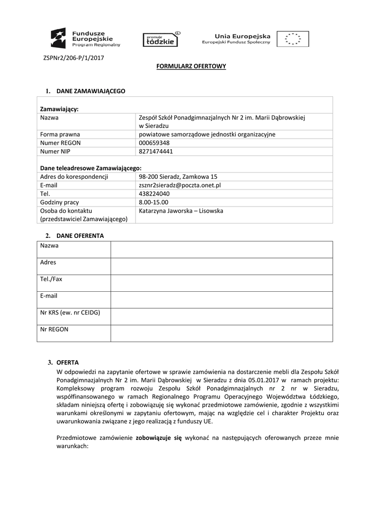 Formularz ofertowy na dostarczenie mebli