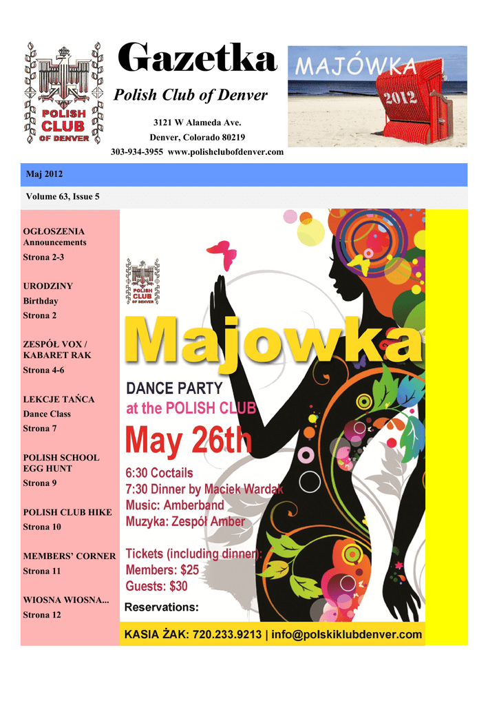Gazetka Polish Club of Denver 3121 W Alameda Ave. Denver, Colorado 80219 303-934-3955 www.polishclubofdenver.com Maj 2012 Volume 63, Issue 5 OGŁOSZENIA Announcements Strona 2-3 URODZINY Birthday Strona 2 ZESPÓŁ VOX / KABARET RAK Strona 4-6 LEKCJE TAŃCA Dance Class Strona 7 POLISH SCHOOL EGG HUNT Strona 9 POLISH CLUB HIKE Strona 10 MEMBERS’ CORNER Strona 11 WIOSNA WIOSNA... Strona 12 Barbara Pyziak 5/28 Franciszka Truczkowski 5/8 Joan Williams 5/22 Danuta Wolicki 5/31 If you prefer that your birthday is not disclosed, please contact Anna Spencer, Membership Director at 970-509-0011 or [email protected] The Board of the Polish Club of Denver has accepted the following resignations: Mrs. Elżbieta Kubala has resigned from the Audit Committee. Mr. Witold Citko has resigned from the Advisory Committe. The Board and the members of the Polish Club of Denver would like to thank Mrs. Kubala and Mr. Citko for their work for the Club. Last month at the General Members Meeting, it was voted that effective June 2012, credit cards will be accepted for bar purchases and online event ticket purchases Sylvia Platek is the winner of the Polish Club Grant. Congratulations! Next Grant deadline is August 1, 2012. Next Scholarship deadline is March 1, 2013. For more information and to apply, please visit our website at www.polishclubofdenver.com Seniors Meeting—May 10 at 11:00 Polish School Cafeteria 517 E 46th Denver, CO 80216 Kinga's Lounge presents its 5th annual POLISH CONSTITUTION DAY PARTY 3PM - Kiełbasa & Karkówka BBQ 8PM - DJ JERRY & MAYA Dance Party- $15 Information: 720.343.6699 Pani Annie Przybyłek życzenia szybkiego powrotu do zdrowia, składają Zarząd i członkowie Klubu. 2 The Polish Club of Denver would like to be a part of its members’ life during good and bad times. If you know of any member of our Club Pani Czesławie Muniz that is going through happy or rough times, please let us know. On życzenia szybkiej behalf of all Polish Club members we will send them greetings and rekowalescencji, flower as a reminder that they are not alone during these changes. składają Please send all info to Anna Spencer, Membership Director, at Zarząd i członkowie [email protected], or 970-509-0011. Klubu. GAZETKA The Polish Club of Denver Presents: Mother’s & Father’s Day Show “Generations” May 13 at 3:00 PM Featuring poetical and dance performances of several generations of members— from children to seniors. Information: Magdalena Lantz 303— NEW GENEALOGY GROUP FORMING AT THE CLUB Polish Club of Denver is currently working on starting its own POLISH GENEALOGY GROUP. The group will be dedicated to helping people with researching their Polish ancestry and exchanging helpful information about genealogy research. The group will meet twice a month. Currently we are looking for two volunteers who would like to lead the group and oversee its activities schedule. For more details, please contact Ania Spencer at [email protected] or 970-509-0011. The first meeting of the group we be announced in the monthly newsletter Gazetka and via email. Polski Klub w Denver pracuje obecnie nad stworzeniem Polskiej Groupy Genealogicznej w Denver. Spotkania grupy odbywać sić będą dwa razy w miesiącu i będą poświęcone wymianie wiedzy i doswiadczeń na temat poszukiwania historii rodziny i tworzenia drzewa genealogicznego. Obecnie poszukujemy dwóch chętnych osób, które poprowadzą tę grupę. Wszystkich zainteresowanych prosimy o kontakt z Ania Spencer na email: [email protected] lub telefonicznie: 970-5090011. 3 Pierwsze spotkanie groupy ogłoszone zostanie w Gazetce i poprzez email. W dniu 17 kwietnia 2012, gośćmi Klubu Polskiego w Denver była grupa VOX oraz Kabaret RAK. Publiczność znakomicie bawiła się w rytm znanych wszystkim klasyków takich jak "Rycz mala rycz" czy "Szcześliwej drogi już czas.” Z koleji w repertuarze Kabaretu RAK jak zwykle nie zabrakło dobrego ślaskiego humoru. Korzystąjac z okazji, postanowiliśmy zadać naszym gościom kilka pytań: Kasia Żak: Jak powstał zespół VOX? Witold Paszt: Nie wiem czy mamy tyle czasu (śmiech)... Jerzy Słota: Witek przebywał we wspaniałej grupie wokalnej Victoria Singers w Warszawie, a że jesteśmy kuzynami, wszyscy jesteśmy z Zamościa...pierwszy manager Maker Skolarski porozmawiał z Witkiem na temat zalożenia grupy wokalnej. Witek zadzwonił do mnie, ja do Andrzeja, przyjechalismy na próbe do Warszawy i okazało się, że to jest strzał w dziesiątkę. Pierwszy koncert odbył się 10 maja 1979 roku. W programie muzyka popowa, muzyka gospel, muzyka swing’owa. KŻ: Na poczatku graliście w nieco innym składzie, prawda? WP: W obecnym składzie gramy już ponad 20 lat. Wczesniej grał z nami także Andrzej Kozioł, ale nie odpowiadało mu ciagłe podróżowanie. JS: Rysia (Ryszard Rynkowski, przyp. red) pożegnaliśmy 9 lat po pierwszej współpracy za obópólną zgodą. KŻ: Który raz jesteście w Stanach? WP: Szósty albo siodmy raz...pierwszy raz to był 1986 rok w Chicago. Mieliśmy bardzo wiele ciekawych kontraktów. Jeden bardzo długi, siedmio-miesieczny gdzie występowaliśmy w towarzystwie fantastycznych artystów z całego świata. KŻ: Czy inna jest Polonijna publiczność tamtych czasów od tej, dla której gracie dziś? JS: Tak, publiczność się zmienia, nie powiem że wymiera ale na pewno przybywa nowa. A my gramy niezmiennie taki sam rodzaj muzyki, który jest znany w Europie i na świecie i on przynosi zespołowi sukces i porozumienie z publicznością. Zresztą zobaczysz dzisiaj. Dariusz Tokarzewski: Jeśli chodzi o Polonię, ja dodam tylko, że było tu bardzo wielu młodych wykonawców, a my jesteśmy zespołem już dość starym i wykonujemy repertuar, który sie nie zmienia. Gramy piosenki, które ludzie pamiętają i tak nam się wydaje, że może wróciły jakieś sentymenty, a może ludzie chcą posłuchać prawdziwych piosenek, którch młode pokolenie, choć bardzo zdolne w naszym 