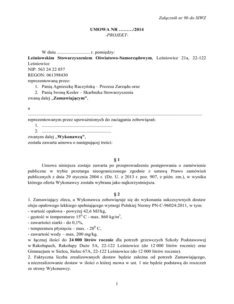 Załącznik nr 9b do SIWZ UMOWA NR ………/2014 -PROJEKT- W dniu ............................ r. pomiędzy: Leśniowskim Stowarzyszeniem Oświatowo-Samorządowym, Leśniowice 21a, 22-122 Leśniowice NIP: 563 24 22 057 REGON: 061398430 reprezentowaną przez: 1. Panią Agnieszkę Raczyńską – Prezesa Zarządu oraz 2. Panią Iwoną Kesler – Skarbnika Stowarzyszenia zwaną dalej „Zamawiającym”, a .................................................................................................................................................... reprezentowanym przez upoważnionych do zaciągania zobowiązań: 1. ............................................................ 2. ........................................................... zwanym dalej „Wykonawcą”, została zawarta umowa o następującej treści: §1 Umowa niniejsza zostaje zawarta po przeprowadzeniu postępowania o zamówienie publiczne w trybie przetargu nieograniczonego zgodnie z ustawą Prawo zamówień publicznych z dnia 29 stycznia 2004 r. (Dz. U. z 2013 r. poz. 907, z późn. zm.), w wyniku którego oferta Wykonawcy została wybrana jako najkorzystniejsza. §2 1. Zamawiający zleca, a Wykonawca zobowiązuje się do wykonania sukcesywnych dostaw oleju opałowego lekkiego spełniającego wymogi Polskiej Normy PN-C-96024:2011, w tym: - wartość opałowa - powyżej 42,6 MJ/kg, - gęstość w temperaturze 150 C - max. 860 kg/m3, - zawartości siarki - do 0,1%, - temperatura płynięcia – max. - 200 C, - zawartość wody – max. 200 mg/kg. w łącznej ilości do 24 000 litrów rocznie dla potrzeb grzewczych Szkoły Podstawowej w Rakołupach, Rakołupy Duże 5A, 22-122 Leśniowice (do 12 000 litrów rocznie) oraz Gimnazjum w Sielcu, Sielec 67A, 22-122 Leśniowice (do 12 000 litrów rocznie). 2. Faktyczna liczba zrealizowanych dostaw będzie zależna od potrzeb Zamawiającego, a niezrealizowanie dostaw w ilości o której mowa w ust. 1 nie będzie podstawą do roszczeń ze strony Wykonawcy. 1 3. Przyjęcie ilościowe oleju opałowego odbywać się będzie wg wskazań dystrybutora na samochodzie Wykonawcy potwierdzone drukiem WZ podpisanym przez upoważnionych przedstawicieli Wykonawcy i Zamawiającego. §3 1. Wykonawca zobowiązuje się dostarczyć do każdej partii oleju opałowego zaświadczenie, świadectwo potwierdzające, że dostarczany olej spełnia wymogi Polskiej Normy PN-C96024:2011, wystawione nie wcześniej niż 30 dni przed dniem dostawy. 2. Wykonawca do każdej dostawy oleju opałowego dołączy dokument potwierdzający obowiązującą w dniu zamówienia cenę oleju opałowego podaną przez producenta. §4 1. Umowa zawarta jest na okres od 1 stycznia 2015 r. do 31 grudnia 2017 r. 2. Olej opałowy będzie dostarczany po wcześniejszym telefonicznym zamówieniu i uzgodnieniu terminu dostawy przez dyrektora szkoły w godzinach pracy szkoły (800 – 1400). 3. Okres od dnia złożenia zamówienia do dnia zrealizowania dostawy wynosi do ……….. dni. 4. Osobą odpowiedzialną za przyjmowanie zamówień oraz wyznaczoną do kontaktu ze strony Wykonawcy jest Pan/i ……………………………………. tel. ………………………………. §5 1. Za wykonanie zamówienia zgodnie z § 2 Zamawiający zapłaci Wykonawcy wynagrodzenie obliczane wg poniższego wzoru: [cena hurtowa producenta obowiązująca w dniu składania zamówienia za 1 litr oleju netto + marża, koszty transportu i tankowania – upust] + VAT = cena brutto 1 litra oleju opałowego. 2. Strony uwzględnią zmiany cen oleju opałowego wynikające: a) ze zmiany cen producenta (potwierdzone stosownym dokumentem, np. wydrukiem ze stron internetowych producenta, notowaniem z prasy), która nie stanowi więcej niż …….% ceny hurtowej obowiązującej na stronie internetowej PKN ORLEN na dzień zamówienia oleju opalowego (opcjonalnie, obowiązuje w przypadku gdy producent nie upublicznia cen hurtowych), b) z ustawowej zmiany podatku VAT (w przypadku ustawowej zmiany przepisów ustalających wysokość stawki podatku VAT cena brutto ulegnie zmianie polegającej na dostosowaniu jej do aktualnie obowiązującej stawki podatku VAT) 3. Marża, koszty transportu i tankowania (………%) oraz ewentualne upusty (………%) nie mogą ulec zmianie do końca terminu obowiązywania umowy. 4. Cena pierwszej dostawy po podpisaniu umowy (około 2 000 litrów) nie może być wyższa od ceny oferowanej w przetargu, tj. do ……….. zł brutto za litr, w tym: cena hurtowa producenta - ………………, marża, koszty transportu i tankowania - ……………….., upust …………………….., podatek VAT - ………………… . §6 1. Strony ustalają, że płatność dokonywana będzie na podstawie faktur VAT wystawionych każdorazowo po zrealizowaniu dostawy oleju opałowego lekkiego w ciągu 21 dni od daty dostarczenia faktury VAT. 2. Strony zgodnie oświadczają, że płatność dokonywana będzie w formie przelewu bankowego na wskazane na fakturze konto Wykonawcy. 2 §7 1. Wykonawca zapłaci Zamawiającemu kary umowne w następujących przypadkach: a) za nieterminowe wykonanie przedmiotu umowy z przyczyn niezależnych od Zamawiającego, w wysokości 1% za każdy dzień zwłoki, od wartości oleju opałowego dostarczanego po terminie; b) za odstąpienie od umowy z przyczyn leżących po stronie Wykonawcy w wysokości 5 % wartości całego zamówienia, wynoszącej …………. zł (słownie: ………………………………………………………………………………….../100 złotych ). 2. Zamawiający może odstąpić od umowy z winy Wykonawcy o ile dostarczany olej opałowy nie będzie spełniał wymogów jakościowych określonych w SIWZ. 3. Z tytułu odstąpienia od umowy z przyczyn określonych w ust. 2. Zamawiający będzie miał prawo naliczenia kary umownej w wysokości 30 % wartości wadliwej dostawy. 4. Niezależnie od kar umownych o których mowa w ust. 1 i 3, Zamawiający ma prawo dochodzić odszkodowania 