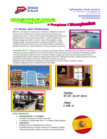 Ogólnopolska Szkoła Językowa 45 – 864 Opole, ul. Niemodlińska 79 tel. (77) 457 33 78 [email protected] www.britishschool.pl 12-dniowy obóz młodzieżowy Blanes ‐ to turystyczna miejscowość w Katalonii, oddalona ok. 6km od Lloret de Mar. Położone jest w malowniczej scenerii: górzysty teren schodzący do morza i zatoki z portem jachtowym.Długa, piaszczysta plaża podzielona jest na dwie części wzniesieniem ‐ cyplem Sa Palomera, z którego rozciąga się widok na miasto i morze. Na szczególna uwagę zasługuje długa, wysadzana palmami, ozdobiona klombami i oczkami wodnymi promenada. Blanes szczyci się również pięknym tropikalnym ogrodem botanicznym rozpoznawalnym na skalę europejską i światową. Hotel Mar Ski 3*** położony jest w portowej miejscowości Blanes, w której kończy się wybrzeże Costa Brava i rozpoczyna się Costa del Maresme (Costa de Barcelona). Hotel usytuowany jest w pierwszej linii brzegowej, dzięki czemu posiada piękny widok na morze. Wewnątrz obiektu znajduje się restauracja serwująca posiłki w formie szwedzkiego bufetu, gdzie znajdziemy bogaty wybór dań kuchni śródziemnomorskiej i międzynarodowej. Na dachu hotelowym umiejscowiony jest basen i niewielki taras słoneczny z barem. Zakwaterowanie w pokojach 3‐osobowych, wyposażonych w: TV‐SAT, telefon, łazienkę z wanną. W pobliżu znajdują się liczne: kawiarenki, bary oraz sklepy. Termin: 07.07-18.07.2013 Cena: 2.395 zł Cena obejmuje: ‐ ‐ zakwaterowanie – 8 noclegów 1 nocleg tranzytowy w hotelu w Paryżu 7 noclegów w hotelu Mar Ski 3*** w Blanes /8dni pobytu/ wyżywienie: śniadanie oraz 2 obiadokolacje w Paryżu 3 posiłki dziennie w hotelu w Blanes tj. śniadania, obiady i kolacje /wszystkie posiłki serwowane w postaci bufetu/ Ogólnopolska Szkoła Językowa 45 – 864 Opole, ul. Niemodlińska 79 tel. (77) 457 33 78 [email protected] www.britishschool.pl - posiłki tranzytowe: śniadanie na trasie dojazdu do Hiszpanii śniadanie i obiad na trasie powrotnej do Polski opiekę pedagogiczną (kadra kwalifikowana przez Kuratorium Oświaty i Wychowania) opiekę rezydenta w Hiszpanii wyposażenie w niezbędne lekarstwa przejazd komfortowym autokarem program turystyczny: ‐ wizyta w Disneylandzie ‐ spotkamy tam wszystkich bohaterów kreskówek Walta Disneya. Można z nimi zrobić zdjęcie, wziąć autograf, pospacerować w towarzystwie Mickey lub Donalda. Pies Pluto i Guffi będą nam towarzyszyć w czasie zabawy, a niezliczone atrakcje w postaci labiryntów, kolejek, karuzel, zamków animacji dopełnią całości. ‐ zwiedzanie Paryża m.in. Katedra Notre Dame, Conciegerie, Święta Kaplica, Pont Neuf, Ogród Luxemburski, Opera, Plac Zgody, Pola Elizejskie, Łuk Triumfalny, Trocadero, panorama Luwru, Wieża Eiffel’a /bilet wstępu schodami na II piętro/, ‐ komunikacja metrem w Paryżu, ‐ W cenie wycieczka do BARCELONY !!! program rekreacyjno – sportowy: - udział w programach animacyjnych organizowanych przez hotel - kąpiele i zabawy na plaży - gry i konkursy, widowiska, imprezy, dyskoteki - rozgrywki sportowe, zawody i mecze, turniej piłki plażowej, zawody pływackie - bieg o błękitną wstęgę Morza Śródziemnego - chrzest obozowy - O’la Espaniola czyli konkurs wiedzy o Hiszpanii suchy prowiant na drogę powrotną ubezpieczenie Signal Iduna KL ‐10.000 Euro, NW –7.000 PLN , bagaż 800 PLN, ASSISTANCE Cena nie obejmuje: obowiązkowego kieszonkowego na wstęp do Eurodisneylandu ‐ 30 euro Zapisy w biurze szkoły lub telefonicznie: British School Opole, ul. Niemodlińska 79 tel. / faks (77) 457 33 78 kom. 608 58 88 86 i Ogólnopolska Szkoła Językowa 45 – 864 Opole, ul. Niemodlińska 79 tel. (77) 457 33 78 [email protected] www.britishschool.pl Szczegółowy program obozu młodzieżowego w Hiszpanii Paryż – Blanes - Barcelona Dzień pierwszy ‐ wyjazd z Polski w godzinach popołudniowych, przejazd przez Niemcy Dzień drugi ‐ ok. 08:00 przyjazd do Disneylandu koło Paryża (8 godzinna zabawa) ‐ ok. 18:00 obiadokolacja, przejazd do Paryża ‐ ok. 20:00 zakwaterowanie w hotelu Dzień trzeci ‐ ok. 08:00 śniadanie ‐ ok. 09:00 zwiedzanie Paryża: Katedra Notre Dame, Conciegerie, Święta Kaplica, Pont Neuf, Ogród Luxemburski, Opera, Plac Zgody, Pola Elizejskie, Łuk Triumfalny, Trocadero, Wieża Eiffel.a, Plac de la Vendome, panorama Luwru ‐ ok. 19:00 kolacja w restauracji w Paryżu ‐ ok. 20:30 wyjazd z Paryża w kierunku Hiszpanii Dzień czwarty ‐ ok. 08:30 śniadanie na trasie ‐ ok. 10:00 przyjazd do hotelu Mar Ski 3***w Blanes ‐ ok. 13:00 obiad w hotelu Dzień czwarty – Dzień jedenasty ‐ pobyt w Blanes zgodnie z programem Barcelona ‐ zwiedzanie: główna arteria Barcelony słynny Ramblas, stare miasto ‐ la Ciutat Vella, Kolumna Krzysztofa Kolumba, Architektura Antonia Gaudiego: Sagrada Familia, Parc Guell, Casa Batllo, Casa Mila, na zakończenie spektakl światła i dźwięku ‐ "Magiczna Fontanna" Dzień jedenasty ‐ ok. 19:00 kolacja w hotelu ‐ ok. 20:00 wyjazd w kierunku Polski Dzień dwunasty ‐ śniadanie na trasie ‐ ok. 15: 00 obiad w restauracji w Niemczech /wymiana kierowców/ ‐ przyjazd do Polski w godzinach wieczornych