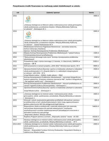 Pozyskiwane środki finansowe na realizację zadań dodatkowych w szkole: rok Zadanie/ sponsor 2016 kwota 3000 zł. „Edukacja ekologiczna w Mieście Łuków realizowana przez szkoły gimnazjalne, szkoły podstawowe, przedszkola miejskie i Miejską Bibliotekę Publiczną w Łukowie" - Gimnazjum Nr 1 2016 2016 2016 2015 2015 2015 2015 2015 2015 2015 2000 zł. „Edukacja ekologiczna w Mieście Łuków realizowana przez szkoły gimnazjalne, szkoły podstawowe, przedszkola miejskie i Miejską Bibliotekę Publiczną w Łukowie" - Szkoła Podstawowa Nr 4 Młodzieżowe Ochotnicze Pogotowie Rówieśnicze - warsztaty taneczne, konkurs dotyczący dopalaczy Sponsor: Komisja Rozwiązywania Problemów Alkoholowych Miejska Komisja Rozwiązywania Problemów Alkoholowych Tydzień Kultury Chrześcijańskiej koncert profilaktyczny "Klub promocji zdrowego stylu życia" Komisja rozwiązywania problemów alkoholowych Prowadzenie zajęć z tenisa ziemnego ( Z. Kamola, A. Marciniuk)./ MKRPA w Łukowie – SP 4 Dofinansowanie w ramach projektu „Orlik 2012” Ministerstwo Sportu SP 4 Upowszechnienie kultury fizycznej i sportu w środowisku szkolnym w obwodzie szkoły podstawowej nr 4 z Zespołu Szkół nr 1 z oddziałami integracyjnymi w Łukowie –UKS Orlik – SP 4 Urząd Miasta Łuków – 3500zł, środki własne – 700zł Komisja Rozwiązywania Problemów Alkoholowych – warsztaty fotograficzne, konkurs plastyczny „Przemocy mówimy stanowcze NIE”, konkurs fotograficzny „Tak spędzam wolny czas” – Gimnazjum 1 Komisja Rozwiązywania Problemów Alkoholowych – koncert profilaktyczny w ramach Tygodnia Kultury Chrześcijańskiej – Gimnazjum 1 Upowszechnienie kultury fizycznej i sportu w środowisku szkolnym w obwodzie 3000 zł 1500 zł. 1500 zł 3200 zł. 9000 zł. 3500 zł. 2500 zł. 2000 zł. 3500 zł. Urząd Miasta Łuków - Gimnazjum 1 2015 2015 2015 2015 2015 2014-2015 „Edukacja ekologiczna w mieście Łuków realizowana przez szkoły gimnazjalne, szkoły podstawowe, przedszkole, Miejską Bibliotekę w Łukowie - Gimnazjum 1 Wniosek z tytułu wyposażenia gabinetów profilaktyki zdrowotnej i pomocy przedlekarskiej w tych szkołach/placówkach, które mają zagwarantowane godziny płatne przez NFZ dla pielęgniarek bądź lekarzy Wyposażenie szkoły w podręczniki, materiały edukacyjne lub materiały ćwiczeniowe dostosowane do potrzeb edukacyjnych i możliwości psychofizycznych uczniów niepełnosprawnych posiadających orzeczenie o potrzebie kształcenia specjalnego „Wyprawka szkolna” dotacja celowa Rządowy Program pomocy uczniom „ Wyprawka szkolna” kwota 10 250 Edukacja ekologiczna w mieście Łuków realizowana przez szkoły gimnazjalne, szkoły podstawowe, przedszkole, Miejską Bibliotekę w Łukowie - SP 4 „Edukacja ekologiczna w mieście Łuków realizowana przez szkoły gimnazjalne, szkoły podstawowe, przedszkola i Miejską Bibliotekę Publiczną w Łukowie” – Gimnazjum 1 Sponsor – Wojewódzki Fundusz Ochrony Środowiska i Gospodarki Wodnej w Lublinie oraz Miasto Łuków. 2000 zł. 500 zł. 54826 zł. 10250 zł. 2000 zł. 2000 zł. 2014 2014 2014 Komisja Rozwiązywania Problemów Alkoholowych – koncert profilaktyczny, warsztaty taneczno- muzyczne w ramach Tygodnia Kultury Chrześcijańskiej – Gimnazjum 1 Parafia Przemienienia Pańskiego - koncert profilaktyczny w ramach Tygodnia Kultury Chrześcijańskiej – Gimnazjum 1 Tenis 10 ( Nauka gry w tenisa dzieci do lat 10./ Polski Związek Tenisa 1500 zł. 1000 zł. Około 2000 zł. Ziemnego ( Sprzęt do nauki gry w tenisa ). 2014 Upowszechnienie kultury fizycznej i sportu w środowisku szkolnym w obwodzie 2500 zł. Urząd Miasta Łuków – Gimnazjum 1 2014 Dofinansowanie w ramach projektu „Orlik 2012” Ministerstwo Sportu SP 4 9000 zł. 2014 Upowszechnienie Kultury Fizycznej I Sportu W Środowisku Szkolnym w Obwodzie Szkoły Podstawowej Nr 4 Z Zespołu Szkół Nr 1 z Oddziałami Integracyjnymi W Łukowie – UKS Orlik Urząd Miasta Łuków – 2500zł, Środki Własne – 500zł Wniosek na wyposażenie szkoły w podręczniki do zajęć z zakresu danego języka obcego nowożytnego, materiały edukacyjne do zajęć z zakresu danego języka obcego nowożytnego lub materiały ćwiczeniowe Rządowy Program pomocy uczniom” Wyprawka szkolna” kwota 26 725 „Edukacja ekologiczna w mieście łuków realizowana przez szkoły gimnazjalne, szkoły podstawowe, przedszkole i miejską bibliotekę publiczną w Łukowie” WFOŚIGW w Lublinie, Urząd Miasta Łuków – SP 4 Festyn integracyjny- sponsorzy :PCPR Łuków i Łukowskie Stowarzyszenie 2500 zł. 2014 2014 2014 2005-2014 2013 7153 zł. 26725 zł. 2000 zł. Łącznie: Rozwoju – SP 4 32.750zł. Ministerstwo Sportu i Turystyki- program „Upowszechnianie sportów 20.000 zł. zimowych” – SP 4 2013 Dofinansowanie w ramach projektu „Orlik 2012” Ministerstwo Sportu - SP 4 9000 zł. 2010-2013 Mały Archimedes Nr projektu WND-POKL.03.03.04-00-160/09 – Gimnazjum 1 2010-2013 e-Akademia Przyszłości – projekt realizowany przez WSiP – Gimnazjum 1 18000 zł. 2012 Ministerstwo Sportu i Turystyki- program „Upowszechnianie sportów 30000 zł. 2010r. – 63.460,00 2011r. – 59.160,00 2012r. – 26.020,00 2013r. – 15.620,00 zimowych” – SP 4 2012 Dofinansowanie w ramach projektu „Orlik 2012” Ministerstwo Sportu - SP 4 2012 RPO Zmienia przyszłość- Namaluj swój świat ( nagroda dla uczennicy oraz dla 9000 zł. 10.000zł. szkoły tablica interaktywna z oprzyrządowaniem) – SP 4 2010-2011 Program nauczania pierwszej pomocy przedmedycznej uczniów ze specjalnymi 6000 zł. potrzebami edukacyjnymi w gimnazjum opracowany przez Akademię Pedagogiki Specjalnej im. M. Grzegorzewskiej w Warszawie – Gimnazjum 1 2006-2011 Internetowe centra informacji multimedialnej w bibliotekach szkolnych Łącznie: i pedagogicznych – Gimnazjum 1 2006-2011 Zakup nowoczesnego sprzętu ułatwiającego kształcenie uczniów ze 14.553 zł. Łącznie: 84.591 zł. specjaln