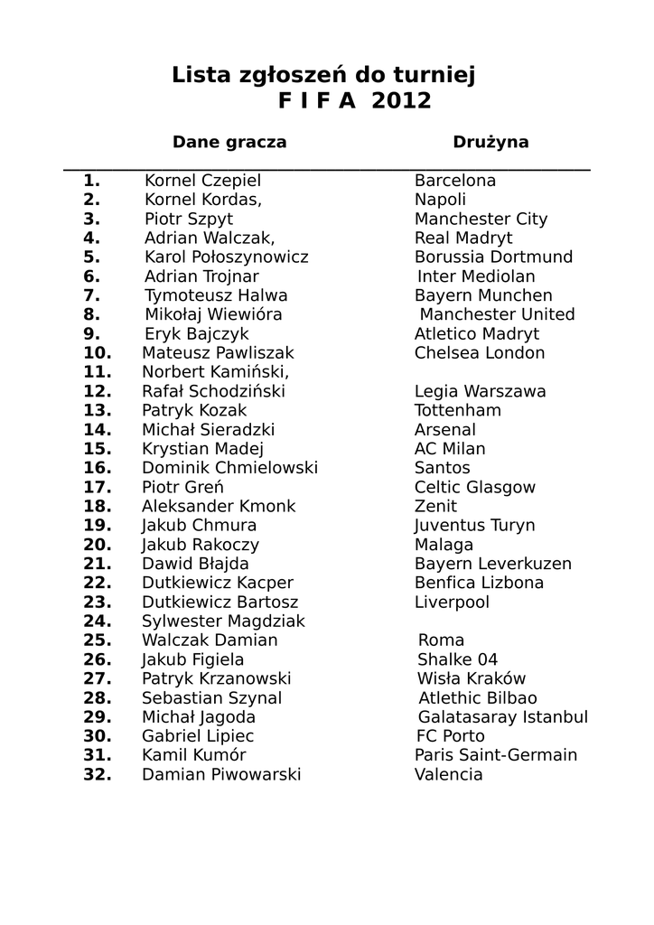 Lista zgłoszeń do turniej F I F A 2012 Dane gracza Drużyna ________________________________________________________________ 1. Kornel Czepiel Barcelona 2. Kornel Kordas, Napoli 3. Piotr Szpyt Manchester City 4. Adrian Walczak, Real Madryt 5. Karol Połoszynowicz Borussia Dortmund 6. Adrian Trojnar Inter Mediolan 7. Tymoteusz Halwa Bayern Munchen 8. Mikołaj Wiewióra Manchester United 9. Eryk Bajczyk Atletico Madryt 10. Mateusz Pawliszak Chelsea London 11. Norbert Kamiński, 12. Rafał Schodziński Legia Warszawa 13. Patryk Kozak Tottenham 14. Michał Sieradzki Arsenal 15. Krystian Madej AC Milan 16. Dominik Chmielowski Santos 17. Piotr Greń Celtic Glasgow 18. Aleksander Kmonk Zenit 19. Jakub Chmura Juventus Turyn 20. Jakub Rakoczy Malaga 21. Dawid Błajda Bayern Leverkuzen 22. Dutkiewicz Kacper Benfica Lizbona 23. Dutkiewicz Bartosz Liverpool 24. Sylwester Magdziak 25. Walczak Damian Roma 26. Jakub Figiela Shalke 04 27. Patryk Krzanowski Wisła Kraków 28. Sebastian Szynal Atlethic Bilbao 29. Michał Jagoda Galatasaray Istanbul 30. Gabriel Lipiec FC Porto 31. Kamil Kumór Paris Saint-Germain 32. Damian Piwowarski Valencia Wtorek 2 lipca 1.Kornel Kordas 2.Piotr Szpyt Środa 3 lipca 3.Adrian Walczak 4.Damian Walczak Czwartek Michał Jagoda Tymoteusz Halwa 10 lipca 11.Karol Połoszynowicz 12.Adrian Trojnar Czwartek Adrian Błajda Gabriel Lipiec 9 lipca 9.Jakub Rakoczy 10.Kornel Czepiel Środa Sebastian Szynal Dawid Błajda 5 lipca 7.Kamil Kumór 8.Michał Sieradzki Wtorek Mateusz Pawliszak Aleksander Kmonk 4 lipca 5.Damian Piwowarski 6.Mikołaj Wiewióra Piątek Bartosz Dutkiewicz Kacper Dutkiewicz walkower walkower 11 lipca 13.Sylwester Magdziak 14.Krystia Madej walkower walkower