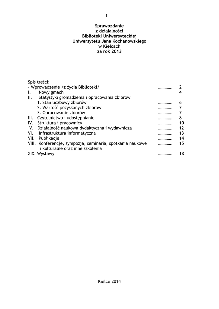 1 Sprawozdanie z działalności Biblioteki Uniwersyteckiej Uniwersytetu Jana Kochanowskiego w Kielcach za rok 2013 Spis treści: - Wprowadzenie /z życia Biblioteki/ I. Nowy gmach II. Statystyki gromadzenia i opracowania zbiorów 1. Stan liczbowy zbiorów 2. Wartość pozyskanych zbiorów 3. Opracowanie zbiorów III. Czytelnictwo i udostępnianie IV. Struktura i pracownicy V. Działalność naukowa dydaktyczna i wydawnicza VI. Infrastruktura informatyczna VII. Publikacje VIII. Konferencje, sympozja, seminaria, spotkania naukowe i kulturalne oraz inne szkolenia XIX. Wystawy Kielce 2014 …………. 2 4 …………. …………. …………. …………. …………. …………. …………. …………. …………. 6 7 7 8 10 12 13 14 15 …………. 18 2 Wprowadzenie Rok 2013 był szczególny i jedyny taki w historii, a upłynął pod znakiem wyjątkowo intensywnej pracy całego zespołu Biblioteki. Powodem takiego stanu rzeczy była przeprowadzka do nowego gmachu przy ul. Świętokrzyskiej 21e, dlatego rok sprawozdawczy 2013 z pewnych względów nie był rokiem łatwym, ale z wielu względów uznać go można za rok udany, ważny, a w pewnej kwestii nawet przełomowy. Wprowadzone w tym roku rozwiązania programowe i systemowe zaowocowały wyraźną zmianą in plus w funkcjonowaniu Biblioteki Uniwersyteckiej. Kontynuowano, rozpoczęte w 2012 roku, prace mające na celu przygotowanie księgozbioru do przewiezienia oraz przystosowania go do pracy w nowym gmachu Biblioteki Uniwersyteckiej. W związku ze zmianą sposobu udostępniania księgozbioru w nowym budynku niezbędne były prace związane z okodowaniem księgozbioru antenami RFID oraz z połączeniem i scaleniem go w jedną całość, a następnie przewiezieniem go do nowej siedziby. W pracach tych uczestniczyli przede wszystkim pracownicy oddziałów udostępniania przy współpracy kolegów i koleżanek z pozostałych oddziałów Biblioteki. Od 13 maja do 16 sierpnia odbywała się przeprowadzka Biblioteki Uniwersyteckiej na ulicę Świętokrzyską 21e. Przewożono księgozbiór zarówno z głównej siedziby Biblioteki, jak i z jej agend zewnętrznych (Czytelnia Historyczna, Czytelnia Neofilologiczna. Czytelnia Matematyczno-Przyrodnicza, Czytelnia Pedagogiczna Czytelnia Zarządzania i Administracji). Odpowiedzialną za przewiezienie księgozbioru była firma Eurelo, wybrana w drodze przetargu, z którą współpraca układała się bardzo dobrze. W wyznaczonym terminie został scalony i przewieziony cały księgozbiór, co pozwoliło na otwarcie Biblioteki dla czytelników 1 października. Oficjalne otwarcie odbyło się 10 października. Uczestniczyły w nim zarówno Władze Uczelni, jak i Władze Miasta oraz Regionu Świętokrzyskiego. Przeniesienie księgozbioru wiązało się z radykalną, zarówno dla Biblioteki, jak i dla naszych czytelników, zmianą sposobu udostępniania dużej części księgozbioru: przeniesienie części zbiorów z magazynu zamkniętego do tzw. wolnego dostępu. Niewątpliwie dodać należy, że do pełnego sukcesu przyczyniła się praca wszystkich pracowników Biblioteki, a zwłaszcza osób pracujących w oddziałach udostępniania. Równolegle z przewożeniem księgozbioru trwały prace związane z przygotowaniem infrastruktury informatycznej i narzędzi komputerowych do pracy w nowym budynku Biblioteki. Pracownicy Oddziału Komputeryzacji i Informatyzacji włożyli ogromy wysiłek w prace związane z wdrażaniem systemu RFID (niezbędnego w wolnym dostępie), konfigurację sprzętu dla pracowników i czytelników oraz rekonfigurację tablic systemu Aleph do nowych warunków w udostępnianiu. Warto również odnotować fakt, że w omawianym roku sprawozdawczym została przygotowana strategia dotycząca digitalizacji zbiorów i uruchomienia Biblioteki Cyfrowej. Zakupiono system dLibra, w celu zbudowania repozytorium cyfrowego Biblioteki Uniwersyteckiej. Należy zaznaczyć, że pomimo przeprowadzki część pracowników Biblioteki nadal zajmowało się codziennymi zadaniami, czyli pracą związana z obsługą czytelników, zakupem, opracowywaniem i wprowadzaniem do naszego zasobu nowości wydawniczych, prowadzeniem statystyk oraz bieżącą kontrolą księgozbioru. W tym zakresie należy niestety podkreślić malejące systematycznie już od kilku lat środki na zakup wydawnictw zwartych, co zaczyna być już sytuacją zagrażającą całej polityce gromadzenia i uzupełniania księgozbioru Biblioteki. W roku sprawozdawczym 2013 zakup był minimalny, na kwotę 48 233,49 zł (33 386,59 zł- 3 Bilioteka w Kielcach, 14 846,90 zł Filia Biblioteki w Piotrkowie Trybunalskim). Głównie była to realizacja dezyderatów, uzupełnianie tytułów wielotomowych i serii. Nowości pochodziły także od osób indywidualnych, w tym pracowników naukowych UJK, oraz instytucji. Najwięcej nowości pochodziło z badań statutowych i zakupów realizowanych w ramach projektów unijnych, choć tych ostatnich było znacznie mniej niż w roku 2012. Sporą część wpływów stanowiły dary: w maju Ośrodek Karta przekazał ok. 700 vol. dokumentów II obiegu, z czego ok. 630 przyjęto do księgozbioru. W czerwcu prof. R. Czarny przekazał dokumenty (m. in. książki, druki ulotne, katalogi wystaw, nadbitki, mapy i plany, wydawnictwa ciągłe i czasopisma) dotyczące krajów skandynawskich, w celu utworzenia kolekcji „Biblioteka Nordycka” w liczbie ok. 350 vol. W listopadzie przyjęto od p. Heleny Naksianowicz zbiór druków dotyczących sztuki - ok. 200 vol. Również w listopadzie Biblioteka nabyła w darze, za pośrednictwem prof. K. Brachy, od p. Mitki Kisielewskiej z Warszawy, ok. 2000 vol. z zakresu historii XX w. Podobnie jak w 2012 roku tak i w 2013 największym źródłem zwiększania stanu naszych zasobów były otrzymywane przez nas dary. Ponieważ jednak nie są to nowości wydawnicze, tak często potrzebne i poszukiwane przez naszych czytelników, siłą rzeczy ich przydatność w naszej ofercie 
