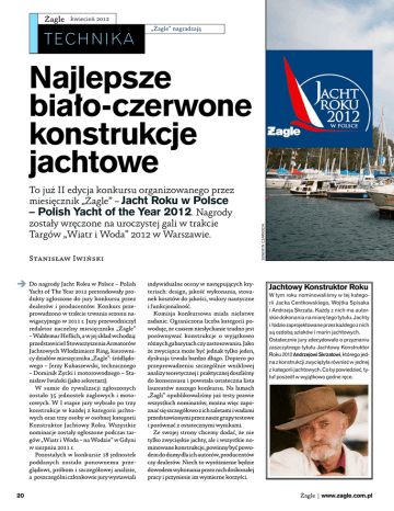 Żagle kwiecień 2012 technika „Żagle” nagradzają To już II edycja konkursu organizowanego przez miesięcznik „Żagle” – Jacht Roku w Polsce – Polish Yacht of the Year 2012. Nagrody zostały wręczone na uroczystej gali w trakcie Targów „Wiatr i Woda” 2012 w Warszawie. Stanisław Iwiński Do nagrody Jacht Roku w Polsce – Polish Yacht of The Year 2012 pretendowały produkty zgłoszone do jury konkursu przez dealerów i producentów. Konkurs przeprowadzono w trakcie trwania sezonu nawigacyjnego w 2011 r. Jury przewodniczył redaktor naczelny miesięcznika „Żagle” – Waldemar Heflich, a w jej skład wchodzą: przedstawiciel Stowarzyszenia Armatorów Jachtowych Włodzimierz Ring, kierownicy działów miesięcznika „Żagle”: śródlądowego – Jerzy Kubaszewski, technicznego – Dominik Życki i motorowodnego – Stanisław Iwiński (jako sekretarz). W sumie do rywalizacji zgłoszonych zostało 35 jednostek żaglowych i motorowych. W I etapie jury wybrało po trzy konstrukcje w każdej z kategorii jachtowych oraz trzy osoby w osobnej kategorii Konstruktor Jachtowy Roku. Wszystkie nominacje zostały ogłoszone podczas targów „Wiatr i Woda – na Wodzie” w Gdyni w sierpniu 2011 r. Pozostałych w konkursie 18 jednostek poddanych zostało ponownemu przeglądowi, próbom i szczegółowej analizie, a poszczególni członkowie jury wystawiali 20 indywidualne oceny w następujących kryteriach: design, jakość wykonania, stosunek kosztów do jakości, walory nautyczne i funkcjonalność. Komisja konkursowa miała niełatwe zadanie. Ograniczona liczba kategorii powoduje, że czasem niesłychanie trudno jest porównywać konstrukcje o wyjątkowo różnych gabarytach czy zastosowaniu. Jako że zwycięzca może być jednak tylko jeden, dyskusja trwała bardzo długo. Dopiero po przeprowadzeniu szczególnie wnikliwej analizy teoretycznej i praktycznej doszliśmy do konsensusu i powstała ostateczna lista laureatów naszego konkursu. Na łamach „Żagli” opublikowaliśmy już testy prawie wszystkich nominatów, można więc zapoznać się szczegółowo z ich zaletami i wadami przedstawionymi przez nasze grupy testowe i porównać z ostatecznymi wynikami. Ze swojej strony chcemy dodać, że nie tylko zwycięskie jachty, ale i wszystkie nominowane konstrukcje, powinny być powodem do dumy dla ich autorów, producentów czy dealerów. Niech to wyróżnienie będzie dowodem wykonania przez nich doskonałej pracy i przyniesie im wymierne korzyści. seweryn czarnocki Najlepsze biało-czerwone konstrukcje jachtowe Jachtowy Konstruktor Roku W tym roku nominowaliśmy w tej kategorii Jacka Centkowskiego, Wojtka Spisaka i Andrzeja Skrzata. Każdy z nich ma autorskie dokonania na miarę tego tytułu. Jachty i łodzie zaprojektowane przez każdego z nich są ozdobą szlaków i marin jachtowych. Ostatecznie jury zdecydowało o przyznaniu zaszczytnego tytułu Jachtowy Konstruktor Roku 2012 Andrzejowi Skrzatowi, którego jedna z konstrukcji zwyciężyła również w jednej z kategorii jachtowych. Co by powiedzieć, tytuł poszedł w wyjątkowo godne ręce. Żagle | www.zagle.com.pl Jacht Żaglowy do 7,5 m długości Kategoria ta jest chyba najbardziej popularna wśród polskich żeglarzy. Na naszych akwenach zdecydowanie dominują właśnie takie konstrukcje i chyba najlepiej przystają do naszych warunków żeglarskich. Największą liczbę punktów uzyskał jacht S-850 Centaurus , zaprojektowany przez biuro projektowe Centkowski & Denert Design Studio, a produkowany przez firmę J&M.W. Yachts z Augustowa. Jacht miał swoją krajową premierę na Targach „Wiatr i Woda” 2011 w Warszawie. Jego największym plusem jest ciekawa sylwetka i oryginalnie zaplanowane wnętrze, według nas doskonale nadające się do żeglarskiej turystyki rodzinnej lub pływania w niewielkim gronie przyjaciół. Choć trudniej adaptować go do prostych czarterów, z pewnością sprawdzi się w bardziej ekskluzywnej ofercie. Jacht wykonano wyjątkowo dobrze i solidnie. Na uwagę zasługuje też znakomicie doświetlone wnętrze i wysokość stania pod pokładem. S-850 Centaurus zdecydowanie wyróżniał się odmienną od swoich konkurentów ideą rozplanowania, ergonomią i wykorzystaniem przestrzeni. Jego bezpośrednimi konkurentami były: Phobos 21 i Maxus 21. S - 8 5 0 C e n t au r u s długość kadłuba 7,48 m szerokość 2,78 m zanurzenie 0,55/1,70 m masa 2560 kg powierzchnia grota 17,50 m² powierzchnia foka samozwrot. 7,5 m² powierzchnia genuy 12,50 m² silnik stacjonarny 10 – 20 KM projektant Centkowski & Denert Design Studio archiwum "Żagli" (2) Dane techniczne 21 Żagle kwiecień 2012 technika „Żagle” nagradzają Jacht Żaglowy powyżej 7,5 m długości Tytuł jachtu roku 2012 w Polsce został przyznany Delphii 46 cc, zgłoszonej i produkowanej przez stocznię Delphia Yachts Kot, a zaprojektowanej przez Andrzeja Skrzata, jak zdecydowana większość konstrukcji z Olecka. To również typowa jednostka armatorska, na której ma pływać tylko właściciel i jego najbliżsi, w warunkach maksymalnego komfortu. W tym niezwykłym jachcie nie ma żadnego kompromisu w stronę udostępnienia go liczniejszej załodze. Jacht zaprojektowany został z dbałością o każdy detal, szczególnie jeśli chodzi o wyposażenie wnętrza. Zadbano na nim także o jak najwyższe standardy bezpieczeństwa, co jest bardzo ważne z uwagi na certyfikowanie go w CE – kategorii „A”. Jednak nie tylko design, wyposażenie oraz wygląd zadecydowały o jego zwycięstwie. W przeprowadzonym teście ta flagowa jednostka oleckiej stoczni wykazała się również bardzo dobrymi parametrami nautycznymi. Spośród nominowanych Delphia 46 cc była największą i najbardziej komfortową jednostką. W końcowej rywalizacji konkurowała z Laguną 30 – Stocznia Sułkowski i Shinem 30 – Fourth Sp. z o.o. Delphia 46 cc Dane techniczne archiwum "Żagli" (2) długość kadłuba 14,03 m szerokość 4,48 m zanurzenie 2,30 m