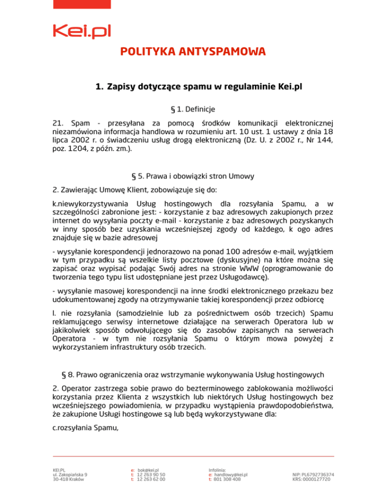 POLITYKA ANTYSPAMOWA 1. Zapisy dotyczące spamu w regulaminie Kei.pl § 1. Definicje 21. Spam - przesyłana za pomocą środków komunikacji elektronicznej niezamówiona informacja handlowa w rozumieniu art. 10 ust. 1 ustawy z dnia 18 lipca 2002 r. o świadczeniu usług drogą elektroniczną (Dz. U. z 2002 r., Nr 144, poz. 1204, z późn. zm.). § 5. Prawa i obowiązki stron Umowy 2. Zawierając Umowę Klient, zobowiązuje się do: k.niewykorzystywania Usług hostingowych dla rozsyłania Spamu, a w szczególności zabronione jest: - korzystanie z baz adresowych zakupionych przez internet do wysyłania poczty e-mail - korzystanie z baz adresowych pozyskanych w inny sposób bez uzyskania wcześniejszej zgody od każdego, k ogo adres znajduje się w bazie adresowej - wysyłanie korespondencji jednorazowo na ponad 100 adresów e-mail, wyjątkiem w tym przypadku są wszelkie listy pocztowe (dyskusyjne) na które można się zapisać oraz wypisać podając Swój adres na stronie WWW (oprogramowanie do tworzenia tego typu list udostępniane jest przez Usługodawcę). - wysyłanie masowej korespondencji na inne środki elektronicznego przekazu bez udokumentowanej zgody na otrzymywanie takiej korespondencji przez odbiorcę l. nie rozsyłania (samodzielnie lub za pośrednictwem osób trzecich) Spamu reklamującego serwisy internetowe działające na serwerach Operatora lub w jakikolwiek sposób odwołującego się do zasobów zapisanych na serwerach Operatora - w tym nie rozsyłania Spamu o którym mowa powyżej z wykorzystaniem infrastruktury osób trzecich. § 8. Prawo ograniczenia oraz wstrzymanie wykonywania Usług hostingowych 2. Operator zastrzega sobie prawo do bezterminowego zablokowania możliwości korzystania przez Klienta z wszystkich lub niektórych Usług hostingowych bez wcześniejszego powiadomienia, w przypadku wystąpienia prawdopodobieństwa, że zakupione Usługi hostingowe są lub będą wykorzystywane dla: c.rozsyłania Spamu, § 16. Rozwiązanie Umowy 5. Operator ma prawo do wypowiedzenia Umowy ze skutkiem natychmiastowym i zaprzestania świadczenia Usług hostingowych w przypadku: e. podjęcia przez Klienta lub Użytkownika działań, które będą skutkowały niewykonaniem któregokolwiek z obowiązków wskazanych w &5.2 w pkt. od h) do l) Regulaminu " 2. Spam a polskie prawo Ustawa z dnia 29 sierpnia 1997 r. o ochronie danych osobowych. http://isap.sejm.gov.pl/DetailsServlet?id=WDU19971330883 Ustawa z dnia 18 lipca 2002 r. o świadczeniu usług drogą elektroniczną. http://isap.sejm.gov.pl/DetailsServlet?id=WDU20021441204 "Art. 2. Określenia użyte w ustawie oznaczają: (...) 2) informacja handlowa - każdą informację przeznaczoną bezpośrednio lub pośrednio do promowania towarów, usług lub wizerunku przedsiębiorcy lub osoby wykonującej zawód, której prawo do wykonywania zawodu jest uzależnione od spełnienia wymagań określonych w odrębnych ustawach, z wyłączeniem informacji umożliwiającej porozumiewanie się za pomocą środków komunikacji elektronicznej z określoną osobą oraz informacji o towarach i usługach niesłużącej osiągnięciu efektu handlowego pożądanego przez podmiot, który zleca jej rozpowszechnianie, w szczególności bez wynagrodzenia lub innych korzyści od producentów, sprzedawców i świadczących usługi. Art. 10. 1. Zakazane jest przesyłanie niezamówionej informacji handlowej skierowanej do oznaczonego odbiorcy za pomocą środków komunikacji elektronicznej, w szczególności poczty elektronicznej. 2. Informację handlową uważa się za zamówioną, jeżeli odbiorca wyraził zgodę na otrzymywanie takiej informacji, w szczególności udostępnił w tym celu identyfikujący go adres elektroniczny. Art. 4. 1. Jeżeli ustawa wymaga uzyskania zgody usługobiorcy to zgoda ta: a) nie może być domniemana lub dorozumiana z oświadczenia woli o innej treści, b) może być odwołana w każdym czasie. 2. Usługodawca wykazuje uzyskanie zgody, o której mowa w ust. 1, dla celów dowodowych. Art. 24. 1. Kto przesyła za pomocą środków komunikacji elektronicznej niezamówione informacje handlowe, podlega karze grzywny. 2. ściganie wykroczenia, o którym mowa w ust. 1, następuje na wniosek pokrzywdzonego. " 3. Procedury obowiązujące w Kei.pl dotyczące użytkowników rozsyłających Spam (procedura ma wyłącznie charakter informacyjny i w żaden sposób nie wpływa na zapisy regulaminu Kei.pl) 1. Poszkodowany zgłasza spam, który otrzymał na swoją skrzynkę e-mail. 2. Kei.pl przesyła informację o spamie wysłanym przez użytkownika serwera w Kei.pl do bezpośredniego Klienta z tzw. pierwszym ostrzeżeniem. Jest to informacja która mówi o tym iż dany użytkownik wysłał spam i prosimy o pouczenie go. Wiadomość ta również zawiera informację iż jeśli otrzymamy kolejne zgłoszenie spamu wysyłanego przez tego użytkownika to jego domena zostania usunięta z dns bez możliwości jej przywrócenia. 3. Jeśli nie otrzymamy zgłoszenie o kolejnej wysyłce w ciągu 12 miesięcy zgłoszenie jest zamykane. 4. Jeśli uzytkownik wysyła spam ponownie jego domen lub konto email (jeśli nie korzystał z własnej domeny) jest usuwana. 5. O fakcie usunięcia domeny z DNS powiadamiany jest bezpośredni Klient Kei.pl. 4. Konsekwencje prawne W Polsce dotychczas rozpatrzono kilkanaście spraw dotyczących rozsyłania niezamówionej informacji handlowej przez firmy. Wysokość grzywn wynosiła kilka tysięcy złotych. Firmy rozsyłające tego typu reklamy były zmuszone do zapłacenia również kosztów sądowych oraz odszkodowania na rzecz poszkodowanego z tytułu poniesionych strat. 5. Zalecenia UOKIK Wybrane: Jak uzyskać zgodę adresata? Przedsiębiorcy chcący skorzystać z reklamy za pomocą poczty elektronicznej muszą uzyskać zgodę danego konsumenta na jej otrzymanie. Brak takiej zgody przed przesłaniem wiadomości stanowiącej ofertę lub reklamę stanowi naruszenie prawa i może być ścigane na drodze indywidualne