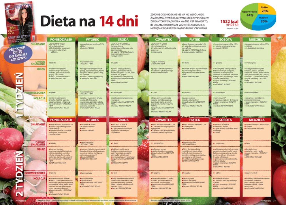 białko 26% węglowodany Dieta na 14 dni PONIEDZIAŁEK ŚNIADANIE ZEP PRZYCTĘ DIE JEJ O DO SW WKI LODÓ DRUGIE ŚNIADANIE 1 TYDZIEŃ OBIAD PODWIECZOREK KOLACJA G INFUNAT TÉ VERDE lub herbata zielona G 3 łyżki płatków owsianych z jogurtem naturalnym i 1 jabłkiem G 3 śliwki WTOREK G kawa zbożowa na mleku 1,5% G 2 kiwi G 6 ciastek FIBROKI G jogurt naturalny z REDUNAT FIBRA 2 TYDZIEŃ 30 KOLACJA lub herbata zielona G 3 łyżki musli z ½ szklanki mleka sojowego G mała gruszka G1 jabłko G jogurt naturalny z REDUNAT FIBRA średnia: 14 dni PIĄTEK SOBOTA NIEDZIELA G kawa zbożowa na mleku 1,5% G 2 plastry świeżego ananasa G 6 ciastek FIBROKI G kawa zbożowa na mleku 1,5% G 1 jabłko G ½ drożdżówki bez lukru G 3 śliwki G1 gruszka G 1 nektarynka G kuleczki mięsne w pomidorach G surówka z pora i jabłka G jogurt naturalny z REDUNAT G duszony filet cielęcy w sosie G szaszłyk drobiowy (pierś brzoskwiniowym (cielęcina, zmielone orzechy włoskie, zmielone brzoskwinie, odrobina białego wina wytrawnego, oliwa z oliwek, przyprawy) G jogurt naturalny z REDUNAT FIBRA G DRENANAT INSTANT kurczaka, cebula, papryki: czerwona, zielona, żółta, cukinia, zioła prowansalskie, sól i pieprz) G surówka z cykorii i nektarynki G jogurt naturalny z REDUNAT FIBRA G DRENANAT INSTANT G kawa zbożowa na mleku 1,5% G 1 szklanka wyciśniętego soku z grejpfruta G 2 grzanki FIBROKI z polędwicą drobiową, sałatą i ogórkiem G gulasz cielęcy (cielęcina, papryka, pomidory, cebula, kostka warzywna KILUVA, oliwa z oliwek, sól, pieprz) G surówka z kiszonej kapusty G jogurt naturalny z REDUNAT FIBRA G DRENANAT INSTANT G1 jabłko G jogurt naturalny G1 nektarynka G 2 kiwi G1 gruszka G 3 mandarynki G pieczone jabłko* G omlet ze szpinakiem G sałatka z twarogiem (chudy G sałatka z selera naciowego G bigos jarzynowy (świeża twaróg, 2 łyżki jogurtu naturalnego, pomidor, cebula, pietruszka, rzodkiewka, papryka czerwona, koperek) G herbata INFUNAT RELAX i kurczaka* G jogurt naturalny z REDUNAT FIBRA G herbata INFUNAT RELAX kapusta, pomidor, papryka, cukinia, pieczarki, czosnek, pieprz i sól, kostka warzywna KILUVA) G jogurt naturalny z REDUNAT FIBRA G herbata INFUNAT RELAX G zupa ogórkowa G sałatka z tuńczykiem G jogurt naturalny z REDUNAT G krem z cukinii* G 2 plastry polędwicy drobiowej G jogurt naturalny z REDUNAT G jajecznica z pomidorem, (2 białka, 1 żółtko, szpinak, orzechy włoskie, sól i pieprz) G jogurt naturalny z REDUNAT FIBRA G herbata INFUNAT RELAX FIBRA G herbata INFUNAT RELAX G herbata INFUNAT RELAX z REDUNAT FIBRA G kawa zbożowa na mleku 1,5% G szklanka wyciskanego soku WTOREK G1 jabłko ŚRODA G INFUNAT TÉ VERDE G INFUNAT TÉ VERDE lub herbata zielona G 2 kiwi G 6 ciastek FIBROKI lub herbata zielona G 3 łyżki płatków owsianych z jogurtem naturalnym i 1 jabłkiem G jogurt naturalny z REDUNAT FIBRA G panga z listkami szpinaku* G ½ szklanki ryżu brązowego G DRENANAT INSTANT (6404 kJ) (pstrąg, jogurt naturalny, kostka warzywna KILUVA, pieprz biały, sól, koperek) G surówka z kapusty pekińskiej G DRENANAT INSTANT twarogiem, pomidorem i szczypiorkiem PODWIECZOREK G INFUNAT TÉ VERDE herbata zielona G szklanka wyciskanego soku z pomarańczy G 2 grzanki FIBROKI z chudym twarogiem, pomidorem i szczypiorkiem 30% G pstrąg w sosie koperkowym z pomarańczy OBIAD G INFUNAT TÉ VERDE lub 1532 kcal tłuszcze (mielone mięso drobiowe, pomidor, pieczarki lub inne grzyby, kilka oliwek) G sałatka śródziemnomorska G DRENANAT INSTANT G 2 grzanki FIBROKI z chudym DRUGIE ŚNIADANIE CZWARTEK 44% G faszerowana papryka PONIEDZIAŁEK ŚNIADANIE ŚRODA ZDROWE ODCHUDZANIE NIE MA NIC WSPÓLNEGO Z MAKSYMALNYM REDUKOWANIEM LICZBY POSIŁKÓW ZJADANYCH W CIĄGU DNIA. WAŻNE JEST BOWIEM TO, BY ORGANIZM OTRZYMAŁ WSZYSTKIE SUBSTANCJE NIEZBĘDNE DO PRAWIDŁOWEGO FUNKCJONOWANIA FIBRA G DRENANAT INSTANT CZWARTEK G kawa zbożowa na mleku 1,5% G 1 szklanka wyciśniętego soku z grejpfruta PIĄTEK G kawa zbożowa na mleku 1,5% G1 nektarynka G 6 ciastek FIBROKI G 2 grzanki FIBROKI z polędwicą drobiową, sałatą i ogórkiem G 3 śliwki G1 pomarańcza G jogurt naturalny G grillowany pstrąg G sałatka śródziemnomorska G jogurt naturalny z REDUNAT FIBRA SOBOTA G INFUNAT TÉ VERDE lub herbata zielona G 3 łyżki musli z ½ szklanki mleka sojowego G 3 śliwki pieczarkami i cebulą G jogurt naturalny z REDUNAT FIBRA G herbata INFUNAT RELAX NIEDZIELA G kawa zbożowa na mleku 1,5% G 1 jabłko G ½ drożdżówki bez lukru G1 nektarynka G 2 kiwi G filet z dorsza z cukinią G grillowana cielęcina (marynata: i pomidorami (dorsz, oliwa z oliwek, cukinia, czosnek, pomidory, zioła prowansalskie, sok z cytryny, sól i pieprz) G ½ szklanki ryżu brązowego G DRENANAT INSTANT czosnek, tymianek, gałka muszkatołowa, sok z cytryny, skórka z cytryny, oliwa z oliwek, pietruszka, sól i pieprz) G grillowane warzywa (papryka, cukinia, grzyby) G jogurt naturalny z REDUNAT FIBRA G DRENANAT INSTANT G dorsz pieczony G surówka z pora i jabłka G jogurt naturalny z REDUNAT z REDUNAT FIBRA G duszony kurczak G duszona cielęcina z warzywami G bakłażan nadziewany po prowansalsku (filet z piersi, cukinia, bakłażan, pomidor, cebula, oliwa z oliwek, natka pietruszki, bazylia, sól i pieprz) G jogurt naturalny z REDUNAT FIBRA G DRENANAT INSTANT (łopatka cielęca, cebula, papryka czerwona, zielona część pora, pietruszka, przyprawy) G 2 grzanki FIBROKI G DRENANAT INSTANT (bakłażan, mięso drobiowe, papryka, cebula, pieczarki, pietruszka, sól i pieprz) G surówka z kapusty pekińskiej G jogurt naturalny z REDUNAT FIBRA G DRENANAT INSTANT G1 jabłko G1 pomarańcza G 2 kiwi G1 grejpfrut G1 gruszka G1 jabłko Gjogurtowe lody G zupa z czerwonej papryki* G sałatka z tuńczyka z brzoskwi- G zupa jarzynowa G jajo na twardo G jogurt naturalny z REDUNAT G indyk zapiekany z brokułami G omlet z kalafiorem (2 białka, 1 żółtko, gotowany kalafior, koncentrat pomidorowy) G jogurt naturalny z REDUNAT FIBRA G herbata INFUNAT 