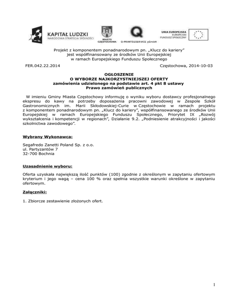 Projekt z komponentem ponadnarodowym pn. „Klucz do kariery” jest współfinansowany ze środków Unii Europejskiej w ramach Europejskiego Funduszu Społecznego FER.042.22.2014 Częstochowa, 2014-10-03 OGŁOSZENIE O WYBORZE NAJKORZYSTNIEJSZEJ OFERTY zamówienia udzielonego na podstawie art. 4 pkt 8 ustawy Prawo zamówień publicznych W imieniu Gminy Miasta Częstochowy informuję o wyniku wyboru dostawcy profesjonalnego ekspresu do kawy na potrzeby doposażenia pracowni zawodowej w Zespole Szkół Gastronomicznych im. Marii Skłodowskiej-Curie w Częstochowie w ramach projektu z komponentem ponadnarodowym pn. „Klucz do kariery”, współfinansowanego ze środków Unii Europejskiej w ramach Europejskiego Funduszu Społecznego, Priorytet IX „Rozwój wykształcenia i kompetencji w regionach”, Działanie 9.2. „Podniesienie atrakcyjności i jakości szkolnictwa zawodowego”. Wybrany Wykonawca: Segafredo Zanetti Poland Sp. z o.o. ul. Partyzantów 7 32-700 Bochnia Uzasadnienie wyboru: Oferta uzyskała największą ilość punktów (100) zgodnie z określonym w zapytaniu ofertowym kryterium i jego wagą – cena 100 % oraz spełnia wszystkie warunki określone w zapytaniu ofertowym. Załączniki: 1. Zbiorcze zestawienie złożonych ofert. 1 Projekt z komponentem ponadnarodowym pn. „Klucz do kariery” jest współfinansowany ze środków Unii Europejskiej w ramach Europejskiego Funduszu Społecznego Załącznik nr 1 do ogłoszenia o wyborze najkorzystniejszej oferty ZBIORCZE ZESTAWIENIE ZŁOŻONYCH OFERT L.p . Nazwa i adres wykonawcy Cena brutto oferty Liczba punktów 1. Flint Espresso Sp. z o.o. ul. Nowolipki 25 01-010 Warszawa 7 257,00 zł Oferta odrzucona 2. Segafredo Zanetti Poland Sp. z o.o. ul. Partyzantów 7 32-700 Bochnia 7 749,00 zł 100,00 3. M&M Gastro s.c. ul. T. Ociepki 8 A 40-413 Katowice 6 699,99 zł Oferta odrzucona 4. Przedsiębiorstwo Handlowe „PRO-HAND” s.c. ul. Wieczorka 2A/107 41-200 Sosnowiec 9 987,60 zł 77,59 Uzasadnienie odrzucenia ofert: Oferta cenowa firmy Flint Espresso Sp. z o.o. zostaje odrzucona z powodu niezgodności treści oferty z wymaganiami określonymi w zapytaniu ofertowym, tj. minimalnymi parametrami technicznymi profesjonalnego ekspresu do kawy wskazanymi przez Zamawiającego. Oferta cenowa firmy M&M Gastro s.c. zostaje odrzucona z powodu niezgodności treści oferty z wymaganiami określonymi w zapytaniu ofertowym, tj. minimalnymi parametrami technicznymi profesjonalnego ekspresu do kawy wskazanymi przez Zamawiającego. DODATKOWE INFORMACJE: Oferta cenowa firmy BSM Group Sp. z o.o. z siedzibą w Toruniu przy ul. Mickiewicza 82 wpłynęła drogą elektroniczną w dniu 29.09.2014 r. o godz. 14:46, tj. po terminie składania ofert cenowych w niniejszym zapytaniu ofertowym, ustalonym na dzień 29.09.2014 r. godz. 14:00. Niniejszym oferta cenowa firmy BSM Group Sp. z o.o. nie została rozpatrzona. 2 Projekt z komponentem ponadnarodowym pn. „Klucz do kariery” jest współfinansowany ze środków Unii Europejskiej w ramach Europejskiego Funduszu Społecznego 3