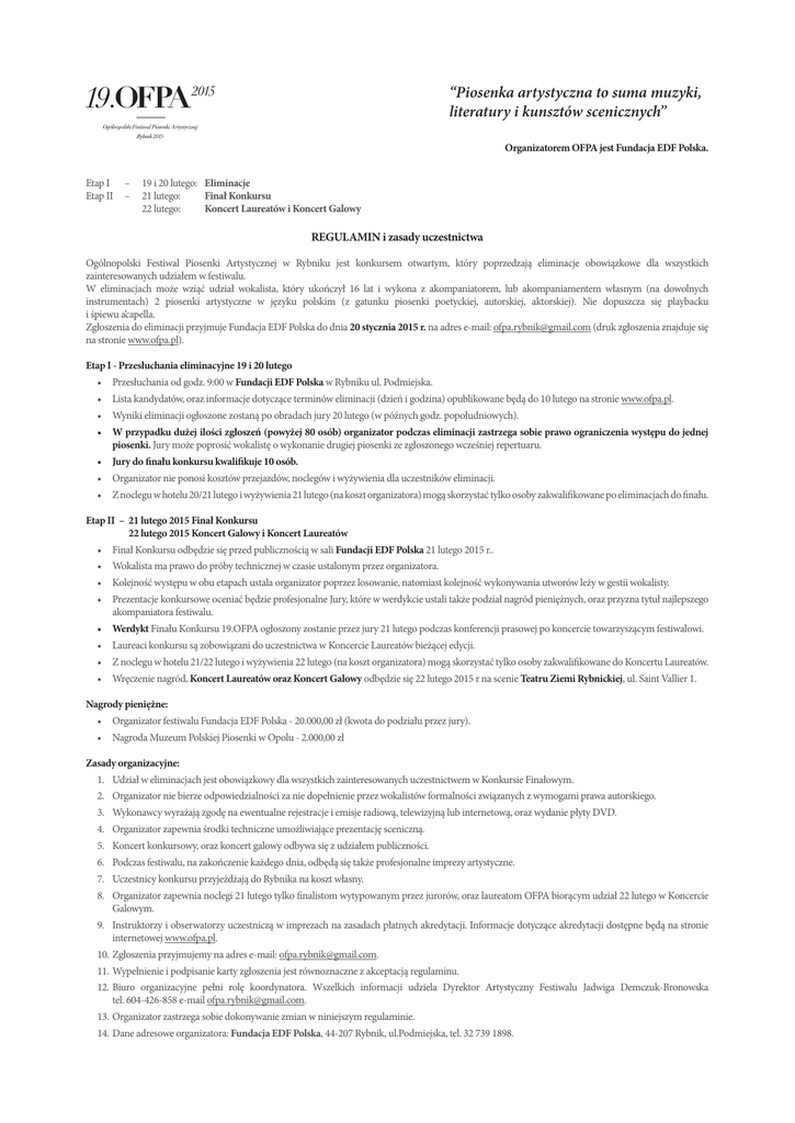 “Piosenka artystyczna to suma muzyki, literatury i kunsztów scenicznych” Organizatorem OFPA jest Fundacja EDF Polska. Etap I – 19 i 20 lutego: Eliminacje Etap II – 21 lutego: Finał Konkursu 22 lutego: Koncert Laureatów i Koncert Galowy REGULAMIN i zasady uczestnictwa Ogólnopolski Festiwal Piosenki Artystycznej w Rybniku jest konkursem otwartym, który poprzedzają eliminacje obowiązkowe dla wszystkich zainteresowanych udziałem w festiwalu. W eliminacjach może wziąć udział wokalista, który ukończył 16 lat i wykona z akompaniatorem, lub akompaniamentem własnym (na dowolnych instrumentach) 2 piosenki artystyczne w języku polskim (z gatunku piosenki poetyckiej, autorskiej, aktorskiej). Nie dopuszcza się playbacku i śpiewu a’capella. Zgłoszenia do eliminacji przyjmuje Fundacja EDF Polska do dnia 20 stycznia 2015 r. na adres e-mail: [email protected] (druk zgłoszenia znajduje się na stronie www.ofpa.pl). Etap I - Przesłuchania eliminacyjne 19 i 20 lutego • Przesłuchania od godz. 9:00 w Fundacji EDF Polska w Rybniku ul. Podmiejska. • Lista kandydatów, oraz informacje dotyczące terminów eliminacji (dzień i godzina) opublikowane będą do 10 lutego na stronie www.ofpa.pl. • Wyniki eliminacji ogłoszone zostaną po obradach jury 20 lutego (w późnych godz. popołudniowych). • W przypadku dużej ilości zgłoszeń (powyżej 80 osób) organizator podczas eliminacji zastrzega sobie prawo ograniczenia występu do jednej piosenki. Jury może poprosić wokalistę o wykonanie drugiej piosenki ze zgłoszonego wcześniej repertuaru. • Jury do finału konkursu kwalifikuje 10 osób. • Organizator nie ponosi kosztów przejazdów, noclegów i wyżywienia dla uczestników eliminacji. • Z noclegu w hotelu 20/21 lutego i wyżywienia 21 lutego (na koszt organizatora) mogą skorzystać tylko osoby zakwalifikowane po eliminacjach do finału. Etap II – 21 lutego 2015 Finał Konkursu 22 lutego 2015 Koncert Galowy i Koncert Laureatów • Finał Konkursu odbędzie się przed publicznością w sali Fundacji EDF Polska 21 lutego 2015 r.. • Wokalista ma prawo do próby technicznej w czasie ustalonym przez organizatora. • Kolejność występu w obu etapach ustala organizator poprzez losowanie, natomiast kolejność wykonywania utworów leży w gestii wokalisty. • Prezentacje konkursowe oceniać będzie profesjonalne Jury, które w werdykcie ustali także podział nagród pieniężnych, oraz przyzna tytuł najlepszego akompaniatora festiwalu. • Werdykt Finału Konkursu 19.OFPA ogłoszony zostanie przez jury 21 lutego podczas konferencji prasowej po koncercie towarzyszącym festiwalowi. • Laureaci konkursu są zobowiązani do uczestnictwa w Koncercie Laureatów bieżącej edycji. • Z noclegu w hotelu 21/22 lutego i wyżywienia 22 lutego (na koszt organizatora) mogą skorzystać tylko osoby zakwalifikowane do Koncertu Laureatów. • Wręczenie nagród, Koncert Laureatów oraz Koncert Galowy odbędzie się 22 lutego 2015 r na scenie Teatru Ziemi Rybnickiej, ul. Saint Vallier 1. Nagrody pieniężne: • Organizator festiwalu Fundacja EDF Polska - 20.000,00 zł (kwota do podziału przez jury). • Nagroda Muzeum Polskiej Piosenki w Opolu - 2.000,00 zł Zasady organizacyjne: 1. Udział w eliminacjach jest obowiązkowy dla wszystkich zainteresowanych uczestnictwem w Konkursie Finałowym. 2. Organizator nie bierze odpowiedzialności za nie dopełnienie przez wokalistów formalności związanych z wymogami prawa autorskiego. 3. Wykonawcy wyrażają zgodę na ewentualne rejestracje i emisje radiową, telewizyjną lub internetową, oraz wydanie płyty DVD. 4. Organizator zapewnia środki techniczne umożliwiające prezentację sceniczną. 5. Koncert konkursowy, oraz koncert galowy odbywa się z udziałem publiczności. 6. Podczas festiwalu, na zakończenie każdego dnia, odbędą się także profesjonalne imprezy artystyczne. 7. Uczestnicy konkursu przyjeżdżają do Rybnika na koszt własny. 8. Organizator zapewnia noclegi 21 lutego tylko finalistom wytypowanym przez jurorów, oraz laureatom OFPA biorącym udział 22 lutego w Koncercie Galowym. 9. Instruktorzy i obserwatorzy uczestniczą w imprezach na zasadach płatnych akredytacji. Informacje dotyczące akredytacji dostępne będą na stronie internetowej www.ofpa.pl. 10.Zgłoszenia przyjmujemy na adres e-mail: [email protected]. 11.Wypełnienie i podpisanie karty zgłoszenia jest równoznaczne z akceptacją regulaminu. 12.Biuro organizacyjne pełni rolę koordynatora. Wszelkich informacji udziela Dyrektor Artystyczny Festiwalu Jadwiga Demczuk-Bronowska tel. 604-426-858 e-mail [email protected]. 13.Organizator zastrzega sobie dokonywanie zmian w niniejszym regulaminie. 14.Dane adresowe organizatora: Fundacja EDF Polska, 44-207 Rybnik, ul.Podmiejska, tel. 32 739 1898.