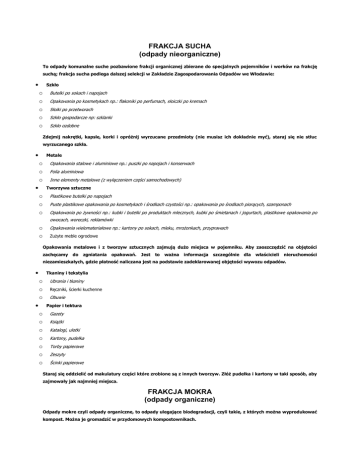 FRAKCJA SUCHA (odpady nieorganiczne) To odpady komunalne suche pozbawione frakcji organicznej zbierane do specjalnych pojemników i worków na frakcję suchą; frakcja sucha podlega dalszej selekcji w Zakładzie Zagospodarowania Odpadów we Włodawie: Szkło o o o o o Butelki po sokach i napojach Opakowania po kosmetykach np.: flakoniki po perfumach, słoiczki po kremach Słoiki po przetworach Szkło gospodarcze np: szklanki Szkło ozdobne Zdejmij nakrętki, kapsle, korki i opróżnij wyrzucane przedmioty (nie musisz ich dokładnie myć), staraj się nie stłuc wyrzucanego szkła. Metale o o o Opakowania stalowe i aluminiowe np.: puszki po napojach i konserwach Folia aluminiowa Inne elementy metalowe (z wyłączeniem części samochodowych) Tworzywa sztuczne o o o Plastikowe butelki po napojach Puste plastikowe opakowania po kosmetykach i środkach czystości np.: opakowania po środkach piorących, szamponach Opakowania po żywności np.: kubki i butelki po produktach mlecznych, kubki po śmietanach i jogurtach, plastikowe opakowania po owocach, woreczki, reklamówki o o Opakowania wielomateriałowe np.: kartony po sokach, mleku, mrożonkach, przyprawach Zużyte meble ogrodowe Opakowania metalowe i z tworzyw sztucznych zajmują dużo miejsca w pojemniku. Aby zaoszczędzić na objętości zachęcamy do zgniatania opakowań. Jest to ważna informacja szczególnie dla właścicieli nieruchomości niezamieszkałych, gdzie płatność naliczana jest na podstawie zadeklarowanej objętości wywozu odpadów. Tkaniny i tekstylia o o o Ubrania i tkaniny Ręczniki, ścierki kuchenne Obuwie Papier i tektura o o o o o o o Gazety Książki Katalogi, ulotki Kartony, pudełka Torby papierowe Zeszyty Ścinki papierowe Staraj się oddzielić od makulatury części które zrobione są z innych tworzyw. Złóż pudełka i kartony w taki sposób, aby zajmowały jak najmniej miejsca. FRAKCJA MOKRA (odpady organiczne) Odpady mokre czyli odpady organiczne, to odpady ulegające biodegradacji, czyli takie, z których można wyprodukować kompost. Można je gromadzić w przydomowych kompostownikach. Organiczne odpady kuchenne o o o Resztki żywności Fusy z kawy i herbaty Odpady z bytowania zwierząt domowych o o Żwirek z kociej kuwety Trociny z klatek Zużyte ręczniki papierowe i chusteczki higieniczne Pieluchy jednorazowe Odpady zielone (w osobnym pojemniku lub worku) o o o o Obierki, skorupki z jajek Trawa Liście Zwiędłe rośliny Owoce Popioły z pieców i kominów (w osobnym pojemniku lub worku)