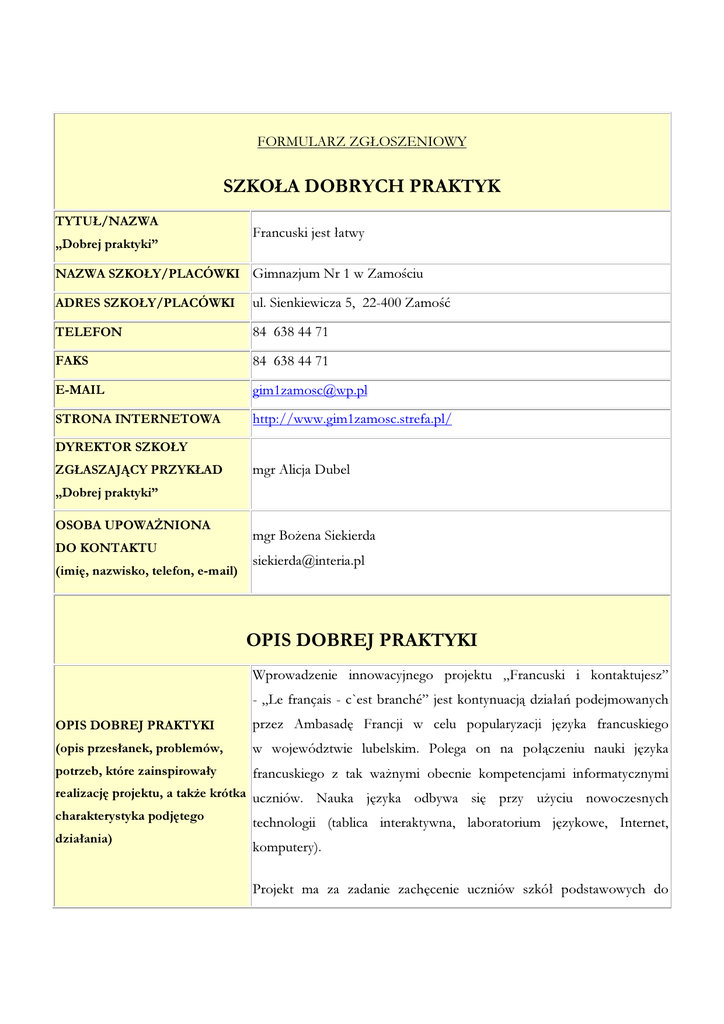FORMULARZ ZGŁOSZENIOWY SZKOŁA DOBRYCH PRAKTYK TYTUŁ/NAZWA „Dobrej praktyki” Francuski jest łatwy NAZWA SZKOŁY/PLACÓWKI Gimnazjum Nr 1 w Zamościu ADRES SZKOŁY/PLACÓWKI ul. Sienkiewicza 5, 22-400 Zamość TELEFON 84 638 44 71 FAKS 84 638 44 71 E-MAIL [email protected] STRONA INTERNETOWA http://www.gim1zamosc.strefa.pl/ DYREKTOR SZKOŁY ZGŁASZAJĄCY PRZYKŁAD mgr Alicja Dubel „Dobrej praktyki” OSOBA UPOWAŻNIONA DO KONTAKTU (imię, nazwisko, telefon, e-mail) mgr Bożena Siekierda [email protected] OPIS DOBREJ PRAKTYKI Wprowadzenie innowacyjnego projektu „Francuski i kontaktujesz” - „Le français - c`est branché” jest kontynuacją działań podejmowanych OPIS DOBREJ PRAKTYKI przez Ambasadę Francji w celu popularyzacji języka francuskiego (opis przesłanek, problemów, w województwie lubelskim. Polega on na połączeniu nauki języka potrzeb, które zainspirowały francuskiego z tak ważnymi obecnie kompetencjami informatycznymi realizację projektu, a także krótka uczniów. Nauka języka odbywa się przy użyciu nowoczesnych charakterystyka podjętego technologii (tablica interaktywna, laboratorium językowe, Internet, działania) komputery). Projekt ma za zadanie zachęcenie uczniów szkół podstawowych do wyboru nauki języka francuskiego w gimnazjum. Jego celem jest też zachęcenie rodziców do wspólnych, otwartych lekcji z ich dziećmi. Przeprowadzane są lekcje otwarte dla rodziców, w celu pokazania, w jaki sposób wykorzystywane są nowoczesne technologie w nauce języka francuskiego. Przeprowadza się lekcje języka francuskiego dla uczniów klas VI szkół podstawowych w Zamościu z wykorzystaniem tablicy interaktywnej. REZULTATY/KORZYŚCI Uczniowie naszego gimnazjum biorą udział z sukcesami w ogólnopolskich konkursach organizowanych przez Ambasadę Francji w Polsce: • „Narysuj mi Szopena” • „Uczę się języka francuskiego, ponieważ…” PROBLEMY I PRZESZKODY Zwalczanie stereotypów wśród młodzieży i rodziców, że język francuski W REALIZACJ jest językiem trudnym. Zachęcanie uczniów i ich rodziców do uczenia się jednego z najczęściej RADY I WSKAZÓWKI używanych języków europejskich. Nie chodzi o to, by „konkurować” z językiem angielskim, lecz by wykorzystać naturalne w tym wieku zdolności uczniów i otworzyć ich na inne kultury. INSTYTUCJE/ORGANIZACJE WSPÓŁPRACUJĄCE w realizacji działania Ambasada Francji w Polsce, Stowarzyszenie Nauczycieli Języka Francuskiego ZAŁĄCZNIKI (dodatkowe materiały uzupełniające) -