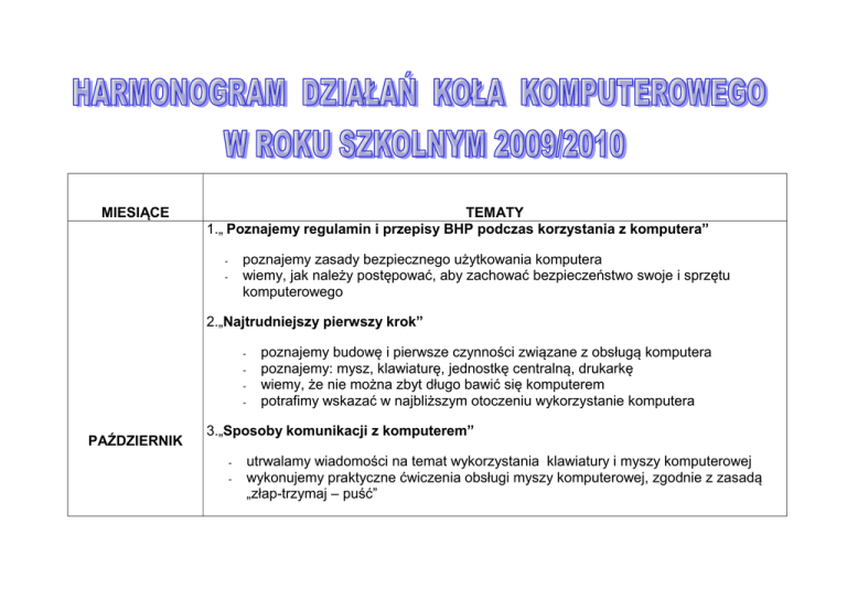 MIESIĄCE TEMATY 1.„ Poznajemy regulamin i przepisy BHP podczas korzystania z komputera” poznajemy zasady bezpiecznego użytkowania komputera wiemy, jak należy postępować, aby zachować bezpieczeństwo swoje i sprzętu komputerowego - 2.„Najtrudniejszy pierwszy krok” - PAŹDZIERNIK poznajemy budowę i pierwsze czynności związane z obsługą komputera poznajemy: mysz, klawiaturę, jednostkę centralną, drukarkę wiemy, że nie można zbyt długo bawić się komputerem potrafimy wskazać w najbliższym otoczeniu wykorzystanie komputera 3.„Sposoby komunikacji z komputerem” - utrwalamy wiadomości na temat wykorzystania klawiatury i myszy komputerowej wykonujemy praktyczne ćwiczenia obsługi myszy komputerowej, zgodnie z zasadą „złap-trzymaj – puść” 1. Rozmawiamy na temat zastosowania komputera i korzyści wynikających z jego stosowania - wiemy, że komputery mają zastosowanie w najbliższym otoczeniu (przedszkole, dom, poczta itp.) - wiemy, że mogą być stosowane w zabawie i rozrywce - wiemy, że należy korzystać z właściwie dobranych do wieku gier komputerowych - poznajemy korzyści wynikające z zastosowania komputerów - przygotowujemy się do korzystania z komputera jako narzędzia codziennego użytku 2. „Sposoby komunikowania – Bolek i Lolek” - prawidłowo posługujemy się myszą komputerową - układamy puzzle – doskonalimy spostrzegawczość i koordynację wzrokowo – ruchową 3. Tworzymy ilustrację – nauka obsługi programu Paint - poznajemy zasady uruchomienia programu Paint - poznajemy funkcje zadania paska rysowania - próbujemy tworzyć własną ilustrację – wybór koloru z palety LISTOPAD 4. Rysujemy na ekranie – „Jesienne liście” - nabywamy umiejętności uruchamiania edytora - Paint - poznajemy narzędzia dostępne w programie Paint - doskonalimy umiejętność rysowania - utrwalamy nazwy poznanych drzew i wygląd poszczególnych liści 1.Rysujemmy i malujemy na ekranie na dowolne tematy - poznajemy sposoby wyboru i użycia kolorów - wypełniamy kolorem gotowe rysunki - doskonalimy koordynację oko – ręka oraz sprawność manualną 2. Malujemy na ekranie – prawidłowo nazywamy narzędzia do malowania. Ćwiczenia. - GRUDZIEŃ - dzieci prawidłowo nazywają narzędzia do malowania i rysowania: ołówek, pędzel, kałamarz, paletę kolorów z zestawem różnych barw kreślimy na ekranie linie proste w wybranym kolorze podejmujemy próby rysowania i malowania na ekranie doskonalą umiejętności posługiwania się myszą 1. Rysujemy i malujemy na ekranie - tworzymy proste rysunki - tworzymy rysunki okolicznościowe – kartka świąteczna 2. Gra logiczno – sprawnościowa „Labirynt” - doskonalimy umiejętność posługiwania się myszką komputerową - ćwiczymy koordynację wzrokowo – ruchową 3. Tworzymy dokumenty tekstowe - uruchamiamy edytor tekstu Word Pad - poznajemy kursor tekstowy - poznajemy sposoby pisania wielkich i małych liter - poznajemy przeznaczenie klawiszy SPACJA, BACKSPACE, ENTER 4. „Matematyczna odkrywanka” STYCZEŃ - poznajemy zasady uruchamiania i obsługi programu prawidłowo dodajemy i odejmujemy liczby układamy i odczytujemy rysunek prawidłowo wpisujemy hasło do pól (np. owoce, warzywa) 1.Zabawy figurek” – utrwalenie poznanych figur geometrycznych z wykorzystaniem programu Paint - LUTY - dzieci poznają sposób rysowania figur: prostokąta, kwadratu, koła, kwadratu (z wykorzystaniem klawisz Shift) dzieci uczą się samodzielnego rysowania trójkąta doskonalą umiejętność kolorowania na ekranie 2. Gry komputerowe - rozmawiamy o szkodliwości niektórych gier i możliwości uzależnienia się od komputera 1. Poznajemy program „Klik uczy czytać” - utrwalamy poznane litery doskonalimy umiejętność analizy i syntezy wyrazów, podziału na sylaby 2. Piszemy swoje imiona – praca w edytorze tekstowym MARZEC - umiejętnie piszemy wielkie i małe litery wiemy do czego służą klawisze: SPACJA, BACKSPACE, ENTER doskonalimy umiejętność czytania 3.Zabawy i gry zręcznościowe „Skaczące żelki” - poznajemy obsługę programu oraz przeznaczenia klawiszy w grze ćwiczenia koordynacji wzrokowo – ruchowej ćwiczymy szybką reakcję na określoną sytuację 1. Poznajemy program „Zostań małym Picasso” - KWIECIEŃ - doskonalimy koordynację wzrokowo – ruchową oraz umiejętność posługiwania się myszą doskonalimy umiejętność rysowania i malowania umiejętnie wybieramy kolory z palety 2. „Matematyczna łamigłówka” - utrwalamy znajomość cyfr i znaków matematycznych piszemy cyfry na klawiaturze ćwiczymy umiejętność dodawania i odejmowania 3. Gra edukacyjna „Układamy puzzle” - poznajemy zasady uruchomienia i obsługi programu prawidłowo układamy i odczytujemy rysunek poprawnie wpisujemy tekst do pól 1. Malujemy bukiet dla mamy w programie „Zostań małym Picasso” - MAJ - prawidłowo nazywamy kolory potrafimy korzystać z pędzla doskonalimy koordynację wzrokowo – ruchową 2.„Matematyczna łamigłówka” - rozpoznajemy i prawidłowo nazywamy cyfry i znaki matematyczne potrafimy dodawać i odejmować 1. „Klik uczy zasad ruchu drogowego” – poznajemy nowy program edukacyjny - CZERWIEC przypominamy sobie o podstawowych zasadach ruchu drogowego dowiadujemy się o konieczności przestrzegania zasad bezpieczeństwa w czasie wakacji: na ulicy, w lesie, nad wodą, w górach Katarzyna Orłowska