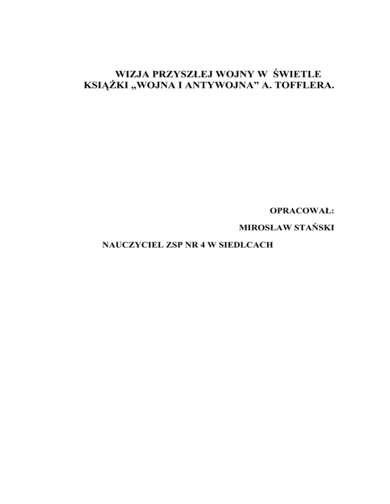WIZJA PRZYSZŁEJ WOJNY W ŚWIETLE KSIĄŻKI „WOJNA I ANTYWOJNA” A. TOFFLERA. OPRACOWAŁ: MIROSŁAW STAŃSKI NAUCZYCIEL ZSP NR 4 W SIEDLCACH I. WSTĘP Niniejsza praca stanowiąca podsumowanie zajęć podyplomowego studium dla nauczycieli przysposobienia obronnego jest syntezą zagadnień, które są istotne dla zrozumienia problemów wojny i pokoju oraz ich przyszłej wizji. Prace Alvina i Heidi Tofflerów „Wojna i Antywojna” i „Trzecia fala” są cennym źródłem wiedzy historycznej, socjologicznej i technicznej oraz dotyczącej obrazu przyszłości, która może stać się teraźniejszością w chwili mniej odległej niż się wydaje. 2 II. WOJNY W POSZCZEGÓLNYCH OKRESACH ROZWOJU SPOŁECZNEGO. 1.Zasadnicze tezy o wojnie. Alvin Toffler we wprowadzeniu książki „Wojna i Antywojna” formułuje dość jasną tezę iż, sposoby prowadzenia wojen nie odbiegają zasadniczo od sposobów jakimi zdobywają dobra materialne. Zmienia się więc oczywiście ich zasięg, podobnie jak zasięg jaki osiągają dobra tworzone w rożnych epokach ludzkości. Korelacje sposobów produkcji i walki są tak oczywiste, iż dziwnym się wydaje brak powszechnego zrozumienia (o czym sam mówi) dla tezy postawionej przez autora. Czym jest antywojna? „...wojna i antywojna nie są przeciwstawieniem typu „albo-albo”. Antywojen nie prowadzi się za pomocą przemówień, modłów, demonstracji, marszów i pikiet nawołujących do pokoju. Antywojny obejmują przede wszystkim działania podejmowane przez polityków, a nawet żołnierzy, mające na celu stworzenia warunków, które odstraszałyby od wojny albo ograniczały jej zasięg. Zdarza się bowiem w tym skomplikowanym świecie, że wojna staje się niezbędnym narzędziem zapobiegającym większej straszliwszej wojnie. Wojna bywa więc antywojną. ...podczas gdy wojny aktualne czy potencjalne a także namiastki wojen, kształtują nasze istnienie, pojawia się przecież całkowicie zapomniana odwrotność tej sytuacji, bo życie każdego z nas kształtują również te wojny, których nie prowadzono, którym udało się zapobiec, ponieważ zwycięstwo odniosły antywojny.”1 Zależnie od sposobu liczenia, jak podają autorzy, od chwili zawarcia pokoju w 1945 roku na świecie szalało 1 Toffler A. i H., Wojna i antywojna, WWL Muza SA,Warszawa 1997, s. 11 3 150-160 wojen i konfliktów wewnętrznych. W tym „powojennym” okresie zginęło 7 mln. 200 tys. żołnierzy (bez rannych i okaleczonych). Jeżeli dodamy do tego liczbę ofiar wśród ludności cywilnej, to suma sięgnie astronomicznej liczby 33-40 milionów (znowu bez rannych, okaleczonych, wysiedlonych, zgwałconych i chorych). Na 2340 tygodni przypadających między rokiem 1945 a 1990, jedynie trzy (!) obyło się bez wojen. Nazywanie tego okresu „erą powojenną” jest więc szydzeniem z tragedii, jakie dotknęły uczestniczących w nich ludzi. Najistotniejszą jednak i najważniejszą tezą książki, która może pomóc ludziom i uchronić ich od zagrożeń ze strony wojen jest ta, że sposobom prowadzenia wojny powinny odpowiadać sposoby prowadzenia antywojny.2 W dotychczasowych dziejach ludzkości wojna o pokój była zawsze w tyle za dążeniem do rozpętania czy utrzymania wojny. Autorzy zdają sobie sprawę, iż nie oferują lekarstwa na wszelkie dolegliwości. mają jednak nadzieję, że przyczynią się do poprawy świadomości ludzi, którzy mogą w chwili obecnej i w przyszłości wpływać na swoje losy. 2.Wojna pierwszej fali. Wojna w swej formie najbardziej znanej współcześnie żyjącym ma swój zakorzeniony daleko w przeszłości pierwowzór. To jak wyglądała wojna w społeczeństwach przedagrarnych, zależało od tego jak wyglądało życie społeczeństw w tym czasie. Zanim ludzie zajęli się uprawą ziemi mieli ograniczone możliwości. Cały niemal czas poświęcali na polowanie. Przemieszczali się przy tym z miejsca na miejsce a zapasy jakie udało im się zgromadzić nie były wystarczająco obfite i trwałe, aby mieli czas na 2 por. Toffler A. i H., Wojna i antywojna, WWL Muza SA,Warszawa 1997, s. 12 4 dodatkowe zajęcia. Nie znaczy to, że nie podejmowali walk. Zawsze bowiem znalazł się ktoś na tyle sprytny, aby nie zajmować się samodzielnie zdobywaniem pożywienia i zabierał łup innym. Rozwój rolnictwa doprowadził do tego, iż ludzie chcąc niechcąc musieli się osiedlić. Wymusiło to konieczność doskonalenia uprawy aby powiększyć ilość zapasów i uniezależnić się od przyrody. To z kolei wymagało od osiadłych plemion obrony swych terytoriów. Nowa możliwość to napaść na sąsiednie plemiona w celu pozbawienia ich zapasów. Co oczywiście osłabiało przeciwnika i zapobiegało możliwości ataku z jego strony. Nie znaczyło wszakże spokoju na zawsze, ponieważ w naturze ludzkiej odwet ma od dawna swoje miejsce. Broń jaka służyła do prowadzenia wojen tamtego okresu oczywiście nie była z braku technologii i materiałów zbyt zaawansowana i sprowadzała się do użycia narzędzi codziennej pracy. Dalszy rozwój społeczeństw agrarnych doprowadził do organizowania się w większe obszarowo i liczebnie zbiorowiska. Częściowa przynajmniej specjalizacja oraz doskonalenie uprawy i hodowli doprowadziły do powstania nadwyżek środków i czasu. Mimo to wojny mogły się dobywać jedynie w czasie gdy nie trzeba było pracować w polu. Nie możliwe też było prowadzenie działań w czasie zimy. Walka na polu bitwy była w zasadzie walką wręcz, twarzą w twarz i na długość miecza. Jeszcze częściej na długość motyki czy siekiery. Odległość między walczącymi „żołnierzami” od tamtej pory nigdy nie była mniejsza, czyli inaczej stale rosła. Taką formę wojny, przetrwałą w różnych częściach świata nieraz i do dzisiejszego dnia nazwali autorzy wojną pierwszej fali. 5 3. Wojna drugiej fali. Druga fala i odpowiadając jej wojna nastąpiła wraz z początkiem rewolucji przemysłowej. Sama rewolucja spowo