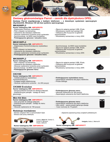 Zestawy głośnomówiące Parrot – cennik dla dystrybutora OPEL Zestawy Parrot współpracują z każdym telefonem – z dowolnym systemem operacyjnym (SymbianOS, Windows CE lub bez systemu operacyjnego. MKi9200PL2 Numer katalogowy GM: AMPARROT6 - Zdejmowany kolorowy wyświetlacz. - Pilot z klipsem na kierownicę. - Ustawienia dla dziesięciu telefonów. - Głosowe wybieranie numerów przez syntezator. - Synchronizacja do 8000 nazw kontaktów. - Polskojęzyczne głosowe i wizualne menu. - Złącza do wpięcia pamięci USB, iPoda. - Wbudowany czytnik kart pamięci SD. - Odtwarza pliki muzyczne na głośniki samochodowe. - Wbudowany wzmacniacz o mocy 20W. MKi9100PL2 Numer katalogowy GM: AMPARROT5 - Zdejmowany monochromatyczny wyświetlacz OLED. - Pilot z klipsem na kierownicę. - Ustawienia dla dziesięciu telefonów. - Głosowe wybieranie numerów przez syntezator. - Polskojęzyczne głosowe i wizualne menu. - Synchronizacja do 8000 nazw kontaktów - Złącza do wpięcia pamięci USB, iPoda. - Odtwarza pliki muzyczne na głośniki samochodowe. - Wbudowany wzmacniacz o mocy 20W. MKi9000PL2 Numer katalogowy GM: AMPARROT4 - Pilot z klipsem na kierownicę. - Ustawienia dla dziesięciu telefonów. - Głosowe wybieranie numerów przez syntezator. - Synchronizacja do 8000 nazw kontaktów - Polskojęzyczne głosowe menu - Złącza do wpięcia pamięci USB, iPoda. - Odtwarza pliki muzyczne na głośniki samochodowe. - Wbudowany wzmacniacz o mocy 20W. CK3100 Numer katalogowy GM: AMPARROT3 - Ciekłokrystaliczny wyświetlacz monochromatyczny. - Podgląd książki telefonicznej. - Głosowe wybieranie numerów – do 200 pozycji. - Polskojęzyczne wyświetlane menu. - Zapamiętuje ustawienia dla pięciu telefonów. - Prosta obsługa. CK3000 Evolution Numer katalogowy GM: AMPARROT2 - Dwuprzyciskowa konsola do obsługi połączeń. - Wielofunkcyjne pokrętło - dostęp do menu głosowego. - Polskojęzyczne głosowe menu. - Głosowe wybieranie do 300 pozycji. - Zapamiętuje ustawienia dla trzech telefonów. Mini Kit Slim Numer katalogowy GM: AMPARROT1 - Dwa przyciski do obsługi połączeń. - Wielofunkcyjne pokrętło - dostęp do menu głosowego. - Głosowe wybieranie do 150 pozycji. - Polskojęzyczne głosowe menu - Zapamiętuje ustawienia dla pięciu telefonów. - Ultra cienki – panel przedni generuje dźwięk. - Czas rozmowy do 10 godzin. Redukcja montażowa - Montaż urządzeń ISO w samochodach Opel. - Skraca czas pracy elektryka. Antara, Astra H, Combo C, Corsa D, Movano, Vivaro, Zafira B Numer katalogowy GM: AMPARROT8 Kierownik zespołu handlowców: Wojciech Kołecki: [email protected] 110218AMXAB - Zapewnia poprawną pracę urządzeń pokładowych. Insignia, Astra J, Meriva B Numer katalogowy GM: AMPARROT7