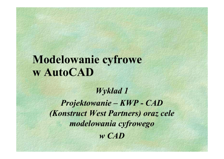 Modelowanie cyfrowe w AutoCAD Wykład 1 Projektowanie – KWP - CAD (Konstruct West Partners) oraz cele modelowania cyfrowego w CAD Cechy współczesnego projektowania Wymagania stawiane obecnie przedmiotom projektowania są diametralnie róŜne od wymagań stawianych tradycyjnie. Wynika to przede wszystkim z wyraźnie wyŜszych wymagań jakościowych (przykładem mogą być tutaj wymagania stawiane współcześnie produkowanym samochodom co do ich bezpieczeństwa i niezawodności), masowości produkcji, rozległości i róŜnorodności obejmowanej tematyki, kompleksowości powiązań zewnętrznych i ponoszonych kosztów, etc. Jednocześnie w wielu dziedzinach, gdy projektowany obiekt jest duŜy (statek, fabryka, centrum handlowe, itp.), projekt naleŜy wykonać na indywidualne zamówienie. Zwiększa się ponadto róŜnorakość projektowanych urządzeń i systemów oraz siła ich powiązań z otoczeniem. śąda się ponadto coraz krótszych czasów projektowania, wynika to z konkurencji na rynku. Nowe wymagania dla systemu projektującego •konieczność angaŜowania duŜej liczby projektantów do jednego zadania, •konieczność angaŜowania specjalistów z róŜnych dziedzin do jednego zadania, •konieczność angaŜowania duŜych środków finansowych, •uzyskanie najwyŜszej jakości projektowania. Nowe Ŝądania w stosunku do procesu projektowania •konieczność starannego planowania procesu, •dekompozycji zadań i koordynacji prac róŜnych zespołów, •umoŜliwienie współuczestnictwa osobom spoza zespołu projektującego, •potrzeba wykorzystania najnowszych metod projektowania wspomaganego komputerowo, •niezbędność optymalizacji działań projektowych ze względu na czas i koszty, •racjonalizacja zbierania i przechowywania informacji, •umoŜliwienie efektywnej pracy osobom o mniejszym talencie lub doświadczeniu zawodowym. Ujęcie systemowe Ujęcie systemowe nakazuje widzieć proces projektowania jako jeden z elementów procesu zaspokajania potrzeby, który składa się co najmniej z trzech elementów: • procesu projektowania, • procesu wykonania obiektu, • procesu eksploatacji obiektu. Celem projektowania będzie więc obmyślenie obiektu projektowania oraz sposobu jego eksploatacji, czasem równieŜ niektórych nietypowych procesów wytwarzania obiektu. Cele projektowania Celem projektowania będzie więc obmyślenie obiektu projektowania oraz sposobu jego eksploatacji, czasem równieŜ niektórych nietypowych procesów wytwarzania obiektu. Podsumowując jako charakterystyczne dla procesu projektowania uznano następujące elementy: •projektowanie jest procesem przetwarzania informacji i generowania informacji, •celem procesu projektowania jest obmyślanie tego, czego jeszcze nie było; stąd wynika konieczność stosowania metod heurystycznych lub innych działań twórczych oraz konieczność programowania i symulowania, Cele projektowania •projektowanie jest procesem złoŜonym, zawierającym działania o róŜnym stopniu sformalizowania: od czysto heurystycznych do czysto algorytmicznych, przy czym działania twórcze są kluczowe; rezultaty silnie zaleŜą od człowieka, •proces projektowania jest podporządkowany procesowi zaspokajania potrzeb., mimo znacznego udziału elementów twórczych, proces projektowania moŜe być badany, opisywany i powinien być nauczany, •brak jednoznacznych modeli samego procesu projektowania, •informacja wejściowa projektowania jest niepełna, •najczęściej brak jest pełnego matematycznego modelu projektowanego obiektu i procesów z nim związanych, co powoduje, Ŝe proces projektowania moŜna algorytmizować tylko częściowo, •ekonomiczne i pozaekonomiczne skutki złych rezultatów projektowania mogą powodować wielkie straty (ekonomiczne, socjalne, i inne). Rodzaje projektowania Przyjęty rodzaj procesu projektowania zaleŜy m.in. od: •rodzaju zadania projektowego, •rodzaju podmiotu projektowania (systemu projektującego), np. własne biuro konstrukcyjne czy zlecenie na zewnątrz, kwalifikacje personelu, wyposaŜenie zaplecza, dostęp do informacji, •środków finansowych i czasu przeznaczonego na projektowanie. KWP - System CAD KWP (Konstruct West Partners; Komputerowe Wspomaganie Projektowania ) nazywa się proces uŜytkowania zbioru metod i środków informatycznych (komputerowych) wzmacniających moŜliwości twórcze konstruktora czy projektanta. Jest to pewien system składający się z trzech głównych elementów: •konstruktora lub projektanta, nazwanego dalej uŜytkownikiem, mającego odpowiednie kwalifikacje, •sprzętu komputerowego, •oprogramowania. Taki trójelementowy układ nazywa się systemem CAD (Computer Aided Design) lub systemem KWP (Komputerowego Wspomagania Projektowania Pakiety CAD NaleŜy podkreślić, Ŝe CAD jest narzędziem wspomagającym pracę człowieka przy uŜyciu komputera, a nie eliminuje jego z procesu projektowania. Przyjęły się odpowiednie nazwy klas takich pakietów jak: •CAD (Computer Aided Design) – konstruowanie i projektowanie wspomagane komputerowo, •CADD (Computer Aided Design and Drafting) – wspomagane komputerowo geometryczne modelowanie (rysowanie) w zintegrowanym procesie konstruowania i projektowania, •CAM (Computer Aided Manufacturing) – wspomagane komputerowo sterowanie procesem wytwarzania, z wykorzystaniem obrabiarek sterowanych numerycznie (NC-numerical Control) i obrabiarek sterowanych mikroprocesorami (CNC – Computer Numerical Control), Pakiety CAD •CAD/CAM (Computer Aided Design and Manufacturing) – zintegrowane (komputerowo wspomagane) konstruowanie i sterowanie produkcją z moŜliwością tworzenia plików z danymi pośrednimi między kolejnymi fazami realizacji programu komputerowego, •CIM (Computer Integrated Manufacturing) – zintegrowany, komputerowo wspomagany system technicznego i organizacyjnego przygotowania produkcji oraz nadzoru procesu wytwarzania , •CAT (Computer Aided Testing) – s