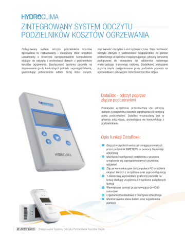 ZINTEGROWANY SYSTEM ODCZYTU PODZIELNIKÓW KOSZTÓW OGRZEWANIA Zintegrowany system odczytu podzielników kosztów ogrzewania to rozbudowany i elastyczny zbiór urządzeń uzupełniony o intuicyjne oprogramowanie komputerowe służące do odczytu i archiwizacji danych z podzielników kosztów ogrzewania. Elastyczność systemu pozwala na dopasowanie go do konkretnych potrzeb i wymagań klienta, gwarantując jednocześnie odbiór dużej ilości danych, poprawność odczytów i oszczędność czasu. Daje możliwość odczytu danych z podzielników bezpośrednio za pomoc przenośnego urządzenia magazynującego, głowicy optycznej podłączonej do komputera lub odbiornika radiowego wykorzystując transmisję radiową. Dodatkowo wskazanie zużycia ciepła zarejestrowane przez podzielnik pozwala na sprawiedliwe i precyzyjne rozliczenie kosztów ciepła. DataBox - odczyt poprzez złącze podczerwieni Przenośne urządzenie przeznaczone do odczytu danych z podzielnika kosztów ogrzewania za pomocą portu podczerwieni. DataBox wyposażony jest w głowicę odczytową, pozwalającą na komunikację z podzielnikiem. DataBox Opis funkcji DataBoxa: Esc 1 2 3 4 5 6 7 Zintegrowane Systemy Odczytu Podzielników Kosztów Ciepła Odczyt wszystkich wskazań zmagazynowanych przez podzielnik BMETERS za pomocą transmisji optycznej Możliwość konfiguracji podzielnika z poziomu urządzenia wg zaprogramowanych wcześniej ustawień Złącze komunikacyjne do komputera PC umożliwia eksport danych z urządzenia oraz jego konfigurację 7-wierszowy wyświetlacz graficzny pozwala na łatwą obsługę urządzenia i wywołanie pożądanych funkcji Wewnętrzna pamięć przechowująca do 4000 rekordów Ergonomiczna obudowa z tworzywa sztucznego Monitorowanie stanu baterii oraz wypełnienia pamięci Dane techniczne DataBox BMETERS DataBox wykonuje zadania związane z akwizycją danych pomiarowych z podzielników HydroClima-RFM oraz HydroClima-OPTO oraz ich konserwacją. Wyposażone jest w złącze komunikacyjne do komputera PC, za pośrednictwem którego może być dokonywana konfiguracja niektórych parametrów pracy urządzenia. Ponadto DataBox wyposażony jest w interfejs użytkownika składający się z wyświetlacza i przycisków funkcyjnych, za pomocą których można wywoływać potrzebne w danej sytuacji funkcje takie jak odczyt podzielników, przegląd historii odczytów, konfiguracja podzielnika, wywołanie statusu urządzenia itp. Podstawowym zadaniem jest magazynowanie danych odczytanych z podzielnika. W tym celu urządzenie jest wyposażone w interfejs optyczny zgodny z interfejsem optycznym podzielnika. Odebrane dane są gromadzone w wewnętrznej pamięci. DATABOX Interfejs optyczny zgodny z IrDA SIR Interfejs użytkownika 7-wierszowy, monochromatyczny wyświetlacz graficzny Zasilanie Baterie litowe 1,5V Interfejs do komputera PC port USB Pamięć 4000 rekordów Wymiary: 120 x 65 x 22 Dane odczytywane 1 2 3 4 5 6 Numer podzielnika Wskazanie aktualnie naliczonych jednostek Wskazanie jednostek za zakończony okres rozliczeniowy Wskazanie aktualne temperatury komfortu cieplnego Wskazanie temperatury komfortu cieplnego za zakończony okres rozliczeniowy Informacja o błędach podzielnika Pozycje menu 1 2 3 4 5 6 7 Odczyt podzielnika Przegląd historii odczytów Programowanie parametrów - I rodzaj Programowanie parametrów - II rodzaj Wzbudzenie podzielnika do prezentacji danych na wyświetlaczu Wzbudzenie podzielnika do konfiguracji drogą radiową Status urządzenia Zintegrowane Systemy Odczytu Podzielników Kosztów Ogrzewania