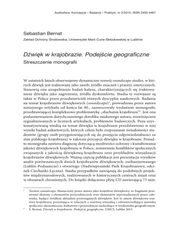 Audiosfera. Koncepcje – Badania – Praktyki, nr 2/2015, ISSN 2450-4467 Sebastian Bernat Zakład Ochrony Środowiska, Uniwersytet Marii Curie-Skłodowskiej w Lublinie Dźwięk w krajobrazie. Podejście geograficzne Streszczenie monografii W ostatnich latach obserwujemy dynamiczny rozwój soundscape studies, w których dźwięk jest traktowany jako zasób, źródło znaczeń i przeżyć estetycznych. Stanowią one uzupełnienie badań hałasu, charakteryzujących się traktowaniem dźwięku jako zagrożenia, źródła dyskomfortu. Studia te rozwijane są także w Polsce przez przedstawicieli różnych dyscyplin naukowych. Badania na temat krajobrazów dźwiękowych (soundscape)1, prowadzone przez autora niniejszego artykułu od końca lat 90., zaowocowały wydaniem monografii, przedstawiającej kompleksowo problematykę „słuchania krajobrazu”2. Jest ona podsumowaniem dotychczasowego dorobku naukowego autora, rozwinięciem sygnalizowanych w licznych artykułach, problemów badawczych. Poza usystematyzowaną wiedzą na temat dźwięku w krajobrazie przedstawiono w niej wyniki badań ankietowych, których celem było rozpoznanie świadomości studentów (grupy osób przygotowujących się do przejęcia odpowiedzialności za stan polskiego krajobrazu) w zakresie percepcji dźwięku w krajobrazie. Ponadto monografia zawiera diagnozę dotyczącą możliwości ochrony i kształtowania jakości dźwiękowych krajobrazu w Polsce, zestawienie konfliktów społecznych związanych z jakością dźwiękową krajobrazu oraz przykładów wizualizacji krajobrazów dźwiękowych. Ważną częścią publikacji jest prezentacja wyników analiz porównawczych dwóch krajobrazów dźwiękowych: zurbanizowanego (Lublin-Podzamcze) i otwartego (Nadwieprzański Park Krajobrazowy, odcinek Ciechanki-Łęczna). Studia przypadków nawiązują do podobnych projektów międzynarodowych, realizowanych w historycznych centrach miast oraz w obszarach chronionych. Do książki dołączono płytę CD zawierającą 73 min. 1 2 Termin soundscape, tłumaczony przez autora jako krajobraz dźwiękowy, to fragment przestrzeni złożony z elementów przyrodniczych oraz elementów wprowadzonych przez człowieka, będący źródłem aktualnie postrzeganych dźwięków. Jest to zatem dźwiękowa warstwa krajobrazu, pozostająca w relacjach z warstwą wizualną i odzwierciedlająca zjawiska społeczno‑ekonomiczne, kulturowe i przyrodnicze zachodzące w środowisku geograficznym. S. Bernat, Dźwięk w krajobrazie. Podejście geograficzne, UMCS, Lublin 2015. 118 Sebastian Bernat autorskich nagrań dźwiękowych dokonanych w Lublinie, Łęcznej, Nadwieprzańskim Parku Krajobrazowym w latach 2012–2015. Poniżej zamieszczono syntetyczny opis monografii, zawierający streszczenia jej poszczególnych rozdziałów. Choć publikacja przedstawia podejście geograficzne, to jej adresatem są wszyscy dostrzegający potrzebę poprawy jakości dźwiękowej krajobrazu. 1. Wprowadzenie W konsekwencji przemian cywilizacyjnych obserwujemy szybkie zanikanie obszarów cichych oraz tradycyjnych krajobrazów dźwiękowych charakterystycznych dla konkretnych miejsc. Od lat 70. XX w. geografowie uczestniczą w badaniach ekologii akustycznej – interdyscyplinarnego kierunku badawczego, analizującego w aspekcie percepcyjnym i historyczno-społecznym zależności, jakie człowiek nawiązuje ze swoim otoczeniem za pośrednictwem dźwięków. Dźwięk określa się jako zaniedbany przedmiot badań geograficznych; a przecież pełni on istotną rolę w doświadczaniu i zapamiętywaniu miejsc i jest równie ważny dla studiów geograficznych jak widok. 2. Cel i metody badań Głównym celem badań było rozpoznanie, z perspektywy geografa, jakie relacje zachodzą między dźwiękiem a krajobrazem. Jako pierwsze zadanie związane z jego realizacją tego potraktowano przegląd literatury i prezentowanych w niej problemów badawczych w odniesieniu do tematyki „dźwięku w krajobrazie”. Duży nacisk położono na przedstawienie dorobku polskich autorów, zwłaszcza odnoszącego się do krajobrazu dźwiękowego miast i regionów w Polsce. Ponadto celem badań było rozpoznanie świadomości studentów w zakresie percepcji dźwięku w krajobrazie oraz diagnoza dotycząca możliwości ochrony i kształtowania jakości dźwiękowych krajobrazu w Polsce. Ponieważ efektywna ochrona krajobrazów dźwiękowych wymaga udziału społeczeństwa oraz wykorzystania mapy jako sposobu analizy i prezentacji przedmiotu ochrony, kolejnym zadaniem było zestawienie konfliktów społecznych związanych z jakością dźwiękową krajobrazu oraz przykładów wizualizacji krajobrazów dźwiękowych. Ostatni cel badawczy stanowiło porównanie jakości dwóch krajobrazów dźwiękowych (zurbanizowanego i otwartego) oraz zaproponowanie wytycznych dla ich ochrony i rewitalizacji. Wymiar teoretyczny monografii został wzbogacony o aspekt praktyczny, wprowadzony przez powiązanie badań z jakością życia, ochroną środowiska, rozwojem zrównoważonym, turystyką, gospodarką przestrzenną i geoinformacją. Ze względu na złożoność problematyki i jej interdyscyplinarność niezbędne było nawiązanie do kilku podejść metodologicznych. Najważniejsze z nich 119 Dźwięk w krajobrazie. Podejście geograficzne. Streszczenie monografii to podejście fenomenologiczne, akcentujące subiektywne znaczenia i wartości oraz istotność indywidualnego doświadczenia w miejscu. Dane zbierano różnymi metodami (ilościowymi i jakościowymi), co umożliwiło pełniejsze, wielostronne poznanie obiektu poddanego analizom, pozwoliło na większą rzetelność, trafność, ścisłość i poprawność wyników badań jakościowych, a także zapewniło odpowiednią głębię analiz. W badaniach empirycznych przeprowadzono ankietę, „spacer dźwiękowy”, obserwację (w tym studium panoramy) oraz studia z wykorzystaniem rysunku odręcznego (mapa mentalna) i opisu swobodnego. Podczas bad