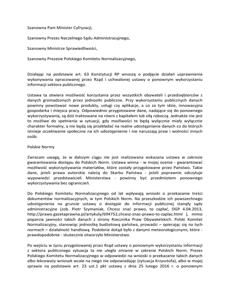 Szanowna Pani Minister Cyfryzacji, Szanowny Prezes Naczelnego Sądu Administracyjnego, Szanowny Ministrze Sprawiedliwości, Szanowny Prezesie Polskiego Komitetu Normalizacyjnego, Działając na podstawie art. 63 Konstytucji RP wnoszę o podjęcie działań usprawnienia wykonywania opracowanej przez Rząd i uchwalonej ustawy o ponownym wykorzystaniu informacji sektora publicznego. Ustawa ta otwiera możliwość korzystania przez wszystkich obywateli i przedsiębiorców z danych gromadzonych przez jednostki publiczne. Przy wykorzystaniu publicznych danych powinny powstawać nowe produkty, usługi czy aplikacje, a co za tym idzie, innowacyjna gospodarka i miejsca pracy. Odpowiednio przygotowane dane, nadające się do ponownego wykorzystywania, są dziś traktowane na równi z kapitałem lub siłą roboczą. Jednakże nie jest to możliwe do spełnienia w sytuacji, gdy możliwości te będą wyłącznie miały wyłącznie charakter formalny, a nie będą się przekładać na realne udostępnianie danych co do których istnieje oczekiwanie społeczne na ich udostępnienie i nie naruszają praw i wolności innych osób. Polskie Normy Zwracam uwagę, że w dalszym ciągu nie jest realizowana wskazana ustawa w zakresie gwarantowania dostępu do Polskich Norm. Ustawa winna ‐ w mojej ocenie ‐ gwarantować możliwość wykorzystywania materiałów, które zostały przygotowane przez Państwo. Takie dane, jeżeli prawa autorskie należą do Skarbu Państwa ‐ jeżeli poprawnie odczytuje wypowiedzi przedstawicieli Ministerstwa ‐ powinny być przedmiotem ponownego wykorzystywania bez ograniczeń. Do Polskiego Komitetu Normalizacyjnego od lat wpływają wnioski o przekazanie treści dokumentów normalizacyjnych, w tym Polskich Norm. Na przeszkodzie ich powszechnego udostępnienia na gruncie ustawy o dostępie do informacji publicznej stanęły sądy administracyjne (zob. Piotr Szymaniak, Chcesz znać prawo, to zapłać, DGP 4.04.2013, http://prawo.gazetaprawna.pl/artykuly/694752,chcesz‐znac‐prawo‐to‐zaplac.html ), mimo poparcia jawności takich danych z strony Rzecznika Praw Obywatelskich. Polski Komitet Normalizacyjny, stanowiąc jednostkę budżetową państwa, prowadzi – opierając się na tych normach – działalność handlową. Podobnie dotąd było z danymi meteorologicznymi, które ‐ prawdopodobnie ‐ skutecznie otworzyło Ministerstwo. Po wejściu w życiu przygotowanej przez Rząd ustawy o ponownym wykorzystaniu informacji z sektora publicznego sytuacja ta nie uległa zmianie w zakresie Polskich Norm. Prezes Polskiego Komitetu Normalizacyjnego w odpowiedzi na wnioski o przekazanie takich danych albo lekceważy wniosek wcale na niego nie odpowiadając (sytuacja Krzysztofa), albo w mojej sprawie na podstawie art. 23 ust.1 pkt ustawy z dnia 25 lutego 2016 r. o ponownym wykorzystywaniu informacji sektora publicznego (Dz. U. z 2016 r., poz. 352), w odpowiedzi na wniosek z dnia 26 czerwca 2016 r. o udostępnienie w celu ponownego wykorzystywania informacji z sektora publicznego poprzez jednorazowe przekazanie informacji w zakresie kopii treści dokumentu przykładowej polskiej normy tj. PN‐EN ISO 13688:2013‐12 w wersji polskiej ‐ Odzież ochronna ‐‐ Wymagania ogólne odmawia udostępnienia ww. informacji. Argumentuje to uznając, że do informacji z sektora publicznego w postaci treści Polskiej Normy nie mają zastosowania przepisy ustawy o ponownym wykorzystywaniu informacji sektora publicznego, lecz wyłącznie przepisy ustawy o normalizacji, co powoduje, że nie może być ona udostępniona na zasadach wskazanych we wniosku, a w szczególności nie może być udostępniona nieodpłatnie. Stosowną decyzje PKN przesyłam w załączeniu. Dodatkowo zwracam uwagę, że w dniu 16 czerwca 2016 roku weszła w życiue ustawa z dnia 25 lutego 2016 r. o ponownym wykorzystywaniu informacji sektora publicznego (Dz.U. 2016 poz. 352) (dalej: ustawa o re‐use). Stanowi ona, że przez informację sektora publicznego należy rozumieć każdą treść lub jej część, niezależnie od sposobu utrwalenia, w szczególności w postaci papierowej, elektronicznej, dźwiękowej, wizualnej lub audiowizualnej, będącą w posiadaniu podmiotów zobowiązanych (art. 2 ust. 1 ustawy o re‐use). Stanowi ona także, że prawo do ponownego wykorzystywania podlega ograniczeniu w zakresie informacji sektora publicznego do których prawa autorskie i prawa pokrewne w rozumieniu przepisów ustawy z dnia 4 lutego 1994 r. o prawie autor‐ skim i prawach pokrewnych (Dz. U. z 2006 r. poz. 631, z późn. zm.) przysługują podmiotom innym niż podmioty zobowiązane (art. 6 ust. 4 pkt 3 ustawy o re‐use). Natomiast w okolicznościach niniejszej sprawy nie powinno budzić żadnych wątpliwości, że autorskie prawa majątkowe do Polskich Norm i innych niż Polskie Normy dokumentów normalizacyjnych zatwierdzonych przez krajową jednostkę normalizacyjną przysługują krajowej jednostce normalizacyjnej (art. 5 ust. 5 i art. 6 ustawy z dnia 12 września 2002 r. o normalizacji. Dz.U. 2002 nr 169 poz. 1386; dalej: UON). Z tego względu, że treść autorskich praw majątkowych przysługuje jednostce normalizacyjnej, będącego jednocześnie podmiotem zobowiązanym do udostępniania lub przekazywania informacji sektora publicznego w celu ponownego wykorzystywania dokonując wykładni a contario art. 6 ust. 4 pkt. 3 ustawy o re‐use należy uznać, że nie jest dopuszczalna odmowa przekazania informacji w celu ponownego wykorzystania informacji z sektora publicznego ze względu na ochronę treści tych dokumentów ochrony jak utwory literackie (art. 5 ust. 5 UON). Należy także zwrócić uwagę, że z oczywistych względów nie będzie mieć w sprawie również zastosowanie art. 5 ust. 7 UON, gdyż odwołuje się on do ustawy z dnia 6 września 2001 r. o dostępie do informacji publicznej (Dz. U. Nr 112, poz. 1198 oraz z 2002 r. Nr 153, poz. 1271), która nie ma w sprawie zastosowania i w sposób zupełni