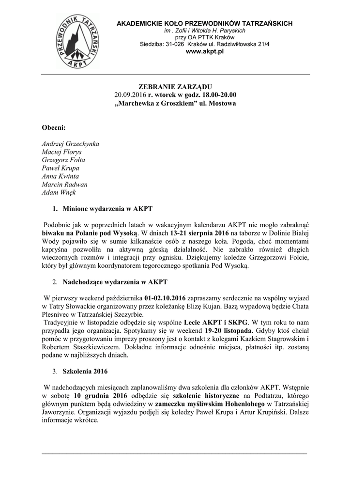 AKADEMICKIE KOŁO PRZEWODNIKÓW TATRZAŃSKICH im . Zofii i Witolda H. Paryskich przy OA PTTK Kraków Siedziba: 31-026 Kraków ul. Radziwiłłowska 21/4 www.akpt.pl ZEBRANIE ZARZĄDU 20.09.2016 r. wtorek w godz. 18.00-20.00 „Marchewka z Groszkiem” ul. Mostowa Obecni: Andrzej Grzechynka Maciej Florys Grzegorz Folta Paweł Krupa Anna Kwinta Marcin Radwan Adam Wnęk 1. Minione wydarzenia w AKPT Podobnie jak w poprzednich latach w wakacyjnym kalendarzu AKPT nie mogło zabraknąć biwaku na Polanie pod Wysoką. W dniach 13-21 sierpnia 2016 na taborze w Dolinie Białej Wody pojawiło się w sumie kilkanaście osób z naszego koła. Pogoda, choć momentami kapryśna pozwoliła na aktywną górską działalność. Nie zabrakło również długich wieczornych rozmów i integracji przy ognisku. Dziękujemy koledze Grzegorzowi Folcie, który był głównym koordynatorem tegorocznego spotkania Pod Wysoką. 2. Nadchodzące wydarzenia w AKPT W pierwszy weekend października 01-02.10.2016 zapraszamy serdecznie na wspólny wyjazd w Tatry Słowackie organizowany przez koleżankę Elizę Kujan. Bazą wypadową będzie Chata Plesnivec w Tatrzańskiej Szczyrbie. Tradycyjnie w listopadzie odbędzie się wspólne Lecie AKPT i SKPG. W tym roku to nam przypadła jego organizacja. Spotykamy się w weekend 19-20 listopada. Gdyby ktoś chciał pomóc w przygotowaniu imprezy proszony jest o kontakt z kolegami Kazkiem Stagrowskim i Robertem Staszkiewiczem. Dokładne informacje odnośnie miejsca, płatności itp. zostaną podane w najbliższych dniach. 3. Szkolenia 2016 W nadchodzących miesiącach zaplanowaliśmy dwa szkolenia dla członków AKPT. Wstępnie w sobotę 10 grudnia 2016 odbędzie się szkolenie historyczne na Podtatrzu, którego głównym punktem będą odwiedziny w zameczku myśliwskim Hohenlohego w Tatrzańskiej Jaworzynie. Organizacji wyjazdu podjęli się koledzy Paweł Krupa i Artur Krupiński. Dalsze informacje wkrótce. ___________________________________________________________________________ AKADEMICKIE KOŁO PRZEWODNIKÓW TATRZAŃSKICH im . Zofii i Witolda H. Paryskich przy OA PTTK Kraków Siedziba: 31-026 Kraków ul. Radziwiłłowska 21/4 www.akpt.pl Niezmiennie, zima nie może rozpocząć się bez odświeżenia i poszerzenia swoich umiejętności poruszania się w terenie lawinowym. Tomek Nodzyński zaprasza wszystkich chętnych w dniach 17-18 grudnia 2016. 4. Spotkania AKPT – wiosna 2017 Mimo tego, że wciąż obowiązuje nas kalendarz na 2016 rok, warto już teraz wpisać w swój przyszłoroczny grafik dwa cykliczne kołowe wydarzenia tj. Memoriał Basi, Ani i Bogdana 01-02.04.2017 oraz Spotkania Przewodników z Umiejętnościami, które odbędą się w Dursztynie w weekend 22-23.04.2017. 5. Kalendarze kołowe 2017 Tak jak co roku zostaną przygotowane specjalne kołowe kalendarze 2017. Ich przygotowaniem zajmuje się kolega Andrzej Grzechynka. W związku z tym, iż pojawiały się różne propozycje i koncepcje jakie zdjęcia powinny znajdować się w naszych kalendarzach, ostatecznie po dłuższej dyskusji zdecydowano przyjąć założenie, że powinny one zawierać tylko i wyłącznie zdjęcia z Tatr, wykonane przede wszystkim przez członków AKPT. W miarę możliwości warto by były to zdjęcia z naszymi twarzami robione np. w czasie różnych kołowych spotkań i szkoleń. W tej sprawie odbyło się głosowanie. Wszyscy obecni tj. 7 osób potwierdziło powyższa koncepcję. Zachęcamy do fotografowania i dzielenia się własna twórczością na rzecz naszych kalendarzy. 6. Lista mailingowa AKPT Od kilku dni działa nowa lista mailingowa AKPT. Tym samym, prosimy o zaprzestanie korzystania z listy „yahoo”. Od teraz maile wysyłane na adres [email protected] będą trafiać automatycznie do wszystkich osób zapisanych na liście mailingowej. Wszyscy zainteresowani otrzymali maila z dokładna instrukcją od Grzegorza Folty. W razie problemów i niejasności prosimy o kontaktowanie się bezpośrednio z nim. 7. Wtorkowe spotkania tematyczne w Marchewce z Groszkiem Po wakacyjnej przerwie ruszamy z tzw. wtorkami tematycznymi w Marchewce z Groszkiem. Zachęcamy wszystkich chętnych opowiedzieć o własnych wyprawach lub innych ciekawych zagadnieniach o tematyce około górskiej, wspinaczkowej i sportowej. Mile widziane także propozycje ciekawych filmów. Koordynacją tematycznych wtorków zajmuje się kolega Marcin Radwan. 8. Fundusze z 1% - przeznaczenie Zgodnie z wcześniejszymi zapowiedziami rozpoczynamy współpracę z organizacjami zrzeszającymi osoby z niepełnosprawnością fizyczną i sensoryczną. Będziemy wspierać finansowo i wspólnie realizować z nimi różne projekty i wyjazdy na teren naszych górskich ___________________________________________________________________________ AKADEMICKIE KOŁO PRZEWODNIKÓW TATRZAŃSKICH im . Zofii i Witolda H. Paryskich przy OA PTTK Kraków Siedziba: 31-026 Kraków ul. Radziwiłłowska 21/4 www.akpt.pl uprawnień. W drodze głosowania zarząd AKPT zdecydował, że na każde wydarzenie możemy przeznaczyć do 700 zł, aż do wyczerpania środków uzyskanych z odpisu 1% podatku na AKPT (6 – osób ZA, 1 – WSTRZYMAŁA SIĘ). Wkrótce podane zostaną dokładniejsze informacje na temat projektu planowanego wraz ze stowarzyszeniem „Lajkonik” z krakowskich Bronowic. 9. Zmiany w Słowackim prawie – sytuacja polskich przewodników na Słowacji Wiele osób zaniepokoiła informacja o zmianach prawnych na Słowacji zgodnie, z którymi pod znakiem zapytania stanął status polskich przewodników tatrzańskich i możliwość prowadzenia przez nich wycieczek w Tatrach po drugiej stronie granicy jeśli nie należą oni jednocześnie do międzynarodowych stowarzyszeń typu UIMLA czy IVBV. Analiza aktów prawnych nie pozwala niestety na jednoznaczne stwierdzenie czy nasi przewodnicy mogą wchodzić z klientami na teren Tatr Słowackich. W związku z powyższym Centrum Przewodnictwa Tatrzańskiego podjęło działania w celu oficjalnego 