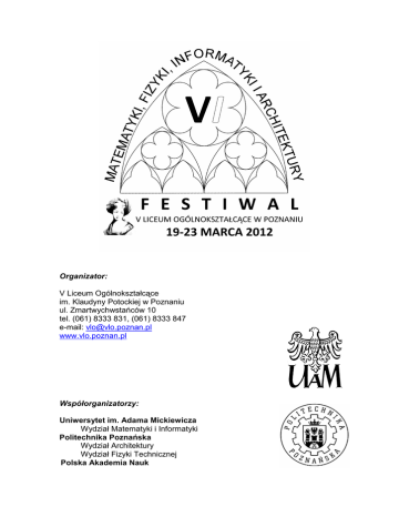 Organizator: V Liceum Ogólnokształcące im. Klaudyny Potockiej w Poznaniu ul. Zmartwychwstańców 10 tel. (061) 8333 831, (061) 8333 847 e-mail: [email protected] www.vlo.poznan.pl Współorganizatorzy: Uniwersytet im. Adama Mickiewicza Wydział Matematyki i Informatyki Politechnika Poznańska Wydział Architektury Wydział Fizyki Technicznej Polska Akademia Nauk Program Festiwalu PONIEDZIAŁEK, 19.03.2012r. Dzień pod patronatem Wydziału Matematyki i Informatyki UAM 9.40 – 9.45 Uroczyste rozpoczęcie festiwalu (aulo-szatnia) 9.45 – 10.30 dr hab. Jerzy Grzybowski, UAM – prezentacja z animacją komputerową „Płytkowanie płaszczyzny i cegiełkowanie przestrzeni” (aulo-szatnia) 10.45 – 11.30 dr Marcin Gogolewski, UAM – „Wprowadzenie do kompresji danych” (aulo-szatnia) 12.35 – 13.20 Zawody fizyczne (sala 115, reprezentanci klas zgłoszeni wcześniej) 14.20 – 15.50 dr hab. Grzegorz Pawłowski, UAM „Wybrane zagadnienia z fizyki Ziemi” (projekt „Newton też był uczniem, sala 115) „Dyskretna liga zadaniowa” – konkurs odbywający się przez cały tydzień w czasie każdej dużej przerwy (II piętro, obok sali 205) Konkurs matematyczno-geograficzny (sala 104) Wystawa prac Wydziału Architektury PP Wystawa plakatów – Sławni matematycy, fizycy i informatycy (prace uczniów V LO) WTOREK, 20.03.2012r. Dzień pod patronatem PAN oraz dzień zmagań logicznych 8.50 – 13.20 I etap konkursu logicznego „Super Umysły V LO” – rywalizacja klas I i II (biorą udział trzej reprezentanci wskazanych klas) (sala multimedialna) 9.45 – 11.45 dr Zbigniew Śniadecki, PAN – wykład i eksperyment „Lewitacja magnetyczna” (sala 115) ŚRODA, 21.03.2012r. Dzień pod patronatem Wydziału Fizyki Technicznej PP oraz Wydziału Fizyki UAM 8.45 – 9.30 prof. dr hab. Piotr Pierański, PP – „Energetyka jądrowa – nadzieja czy zagrożenie?” (aulo-szatnia) 9.35 – 10.30 prof. dr hab. Anna Preiss, UAM – “Czy mikrofon i aparat słuchowy to to samo?” (aulo-szatnia) 10.35 – 11.30 prof. dr hab. Ryszard Krzyminiewski, UAM – „Fizyka w diagnostyce i terapii medycznej XXI wieku” (aulo-szatnia) 11.35 – 12.30 dr Marek Thomas, UAM – „Niewidzialne widzialne” (aulo-szatnia) 12.35 – 13.30 dr Lidia Skibińska, V LO – „Fizyka w kuchni” (aulo-szatnia) CZWARTEK, 22.03.2012r. Dzień pod patronatem Wydziału Fizyki Technicznej PP oraz dzień zmagań konkursowych 8.30 – 9.30 dr inż. Adam Buczek, PP – Pokaz doświadczeń fizycznych (aulo-szatnia) 8.50 – 12.30 Półfinał i finał konkursu logicznego „Super Umysły V LO” – rywalizacja klas (biorą udział trzy najlepsze drużyny klas I oraz II, sala multimedialna) „Matura przedwojenna” – konkurs dla reprezentantów klas III (sala 104) 14.30 Konkurs liczenia pamięciowego „Rachmistrz V LO” (wskazane sale, po 2 reprezentantów z każdej klasy) PIĄTEK, 23.03.2012r. Dzień pod patronatem Wydziału Architektury PP 9.00 – 10.15 dr inż. arch. Hanna Michalak, prodziekan Wydziału Architektury PP – Prezentacja pracy Wydziału oraz programu studiów na WAPP (sala multimedialna) 10.20 – 11.00 Warsztaty I pt.: „Zasady kompozycji” – podstawy komponowania przestrzeni przy użyciu powtarzalnego modułu – butelek po wodzie (aulo-szatnia) 11.10 – 11.40 przedstawienie działalności Koła Naukowego Studentów Wydziału Architektury Illumination – prezentacja multimedialna (sala multimedialna) 11.45 – 11.50 „LightPAINTING” – instalacja audiowizualna KN Illumination (sala multimedialna) 12.00 – 13.40 warsztaty II pt.: “reKOMPOZYCJA” – budowa elementów małej architektury przy użyciu modułu z elementami oświetlenia (aulo-szatnia) 13.40 – 14.00 Studenci Wydziału Architektury przy wystawie będą odpowiadali na pytania zainteresowanych