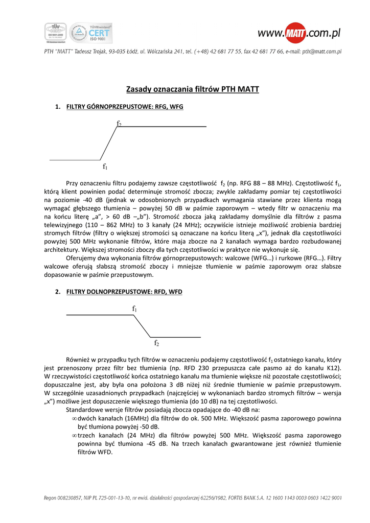 Zasady oznaczania filtrów PTH MATT 1. FILTRY GÓRNOPRZEPUSTOWE: RFG, WFG f2 f1 Przy oznaczeniu filtru podajemy zawsze częstotliwość f2 (np. RFG 88 – 88 MHz). Częstotliwość f1, którą klient powinien podać determinuje stromość zbocza; zwykle zakładamy pomiar tej częstotliwości na poziomie -40 dB (jednak w odosobnionych przypadkach wymagania stawiane przez klienta mogą wymagać głębszego tłumienia – powyżej 50 dB w paśmie zaporowym – wtedy filtr w oznaczeniu ma na końcu literę „a”, > 60 dB –„b”). Stromość zbocza jaką zakładamy domyślnie dla filtrów z pasma telewizyjnego (110 – 862 MHz) to 3 kanały (24 MHz); oczywiście istnieje możliwość zrobienia bardziej stromych filtrów (filtry o większej stromości są oznaczane na końcu literą „x”), jednak dla częstotliwości powyżej 500 MHz wykonanie filtrów, które maja zbocze na 2 kanałach wymaga bardzo rozbudowanej architektury. Większej stromości zboczy dla tych częstotliwości w praktyce nie wykonuje się. Oferujemy dwa wykonania filtrów górnoprzepustowych: walcowe (WFG…) i rurkowe (RFG…). Filtry walcowe oferują słabszą stromość zboczy i mniejsze tłumienie w paśmie zaporowym oraz słabsze dopasowanie w paśmie przepustowym. 2. FILTRY DOLNOPRZEPUSTOWE: RFD, WFD f1 f2 Również w przypadku tych filtrów w oznaczeniu podajemy częstotliwość f1 ostatniego kanału, który jest przenoszony przez filtr bez tłumienia (np. RFD 230 przepuszcza całe pasmo aż do kanału K12). W rzeczywistości częstotliwość końca ostatniego kanału ma tłumienie większe niż pozostałe częstotliwości; dopuszczalne jest, aby była ona położona 3 dB niżej niż średnie tłumienie w paśmie przepustowym. W szczególnie uzasadnionych przypadkach (najczęściej w wykonaniach bardzo stromych filtrów – wersja „x”) możliwe jest dopuszczenie większego tłumienia (do 10 dB) na tej częstotliwości. Standardowe wersje filtrów posiadają zbocza opadające do -40 dB na: • dwóch kanałach (16MHz) dla filtrów do ok. 500 MHz. Większość pasma zaporowego powinna być tłumiona powyżej -50 dB. • trzech kanałach (24 MHz) dla filtrów powyżej 500 MHz. Większość pasma zaporowego powinna być tłumiona -45 dB. Na trzech kanałach gwarantowane jest również tłumienie filtrów WFD. Jest możliwość wykonania filtrów o zwiększonym nachyleniu zbocza (wersja „x”) oraz wersja ze zwiększonym tłumieniem w paśmie zaporowym (wersja „a”). W przypadku takiej wersji trzeba jednak pamiętać, że bardzo trudno jest (szczególnie dla filtrów z końca pasma) zachować wtedy zbocze o nachyleniu 3 kanałów do -40 dB. Wtedy wykonujemy filtry ze zboczem na 4 kanałach (32 MHz) lub informujemy klienta, że ostatni przepuszczany kanał będzie miał większe tłumienie (nośna dźwięku może mieć tłumienie w okolicach -10 dB). 3. FILTRY PASMOWOPRZEPUSTOW: RFP, WFP f2 f3 f4 f1 Przy oznaczaniu tych filtrów podajemy częstotliwości f2 i f3 oznaczające pasmo przepuszczania tego filtru. Jeżeli chodzi o nachylenie zboczy, to jest ono zależne od typu filtrów. Z reguły takie filtry służą do wydzielenia pasma pakietu socjalnego z pasma TV. Najczęstszym przypadkiem jest pasmo FM + kilka kanałów z początku pasma (np. RFP 88 - 214). Wszystkie filtry, które przenoszą pasmo radiowe FM, muszą skutecznie wycinać kanał zwrotny; tak więc w przypadku tych filtrów częstotliwość f1 będzie równa 65 MHz. Częstotliwość f4 jest zależna od wykonania filtru i najczęściej jest położona: • 3 kanały (24 MHz) od częstotliwości f3 dla filtrów WFP oraz RFP posiadających zbocze opadające powyżej 350 MHz; • 2 kanały (16 MHz) od częstotliwości f4 dla filtrów RFP ze zboczem opadającym w paśmie do ok. 350 MHz. Szczególnym przypadkiem filtrów pasmowoprzepustowych są filtry kanałowe RFC, umożliwiające wydzielenie tylko jednego kanału z pasma TV. Ważną rzeczą jest fakt, że filtry te w paśmie przepustowym mogą wnosić dość duże tłumienie (od ok. 3 dB dla filtrów na kanały z początku pasma aż do ok. 12 dB dla filtrów kanałowych z końca pasma). Zbocza narastające i opadające zawierają się w dwóch sąsiednich kanałach. Należy pamiętać również, że filtry te są bardzo pracochłonne jeśli chodzi o wykonanie, jak i zestrojenie (stąd ich cena). 4. FILTRY PASMOWOZAPOROWE: RFZ, WFZ f1 f4 f2 f3 Wszystkie filtry pasmowozaporowe są wykonywane tylko i wyłącznie jako rurkowe; w nazwę filtru wchodzą częstotliwości f1 i f4. Są one stosowane zazwyczaj do wydzielenia pasma Internetu w sieciach, gdzie downstream (czyli przesyłanie danych od sieci do abonenta) znajduje się na końcu pasma. 2 Jeżeli chodzi o częstotliwości nachylenia zboczy f2 i f3, to do tej pory oferowano 2 rodzaje filtrów pasmowozaporowych: • filtry z mniejszą stromością zboczy 5 – 6 kanałów (40 – 48 MHz); stosowane w sieciach, które przedkładają cenę filtru ponad parametry; dopuszczają możliwość przepuszczenia kilku kanałów TV wraz z pasmem Internetu. Gwarantowany poziom tłumienia w paśmie zaporowym to 40 dB. • filtry z większą stromością zboczy 3 – 4 kanały (24 – 32 MHz). W tym miejscu należy zaznaczyć że te bardziej strome filtry nie są oznaczane literą „x” ze względu na fakt, że istnieje teoretyczna możliwość wykonania filtrów ze stromością 2 kanałów (16 MHz). Z reguły posiadają również większe tłumienie w paśmie zaporowym. 5. FILTR DOLNOPRZEPUSTOWY + PASMOWOPRZEPUSTOWY: RFDP f1 f4 f2 f5 f3 f6 Filtry RFDP są stosowane do wydzielenia usługi Internetu z pasma telewizji kablowej tam, gdzie pasmo downstream jest usytuowane w środku pasma TV lub do wydzielenia pasma socjalnego (warunek – pasmo socjalne znajduje się na początku pasma, zaraz za pasmem FM) i usługi Internetu z pasma TVK. Nachylenie zboczy jest standardowe i wynosi 3 - 4 kanały (24 - 32 MHz) dla zwykłych wykonań i 2 kanały dla wykonań „x