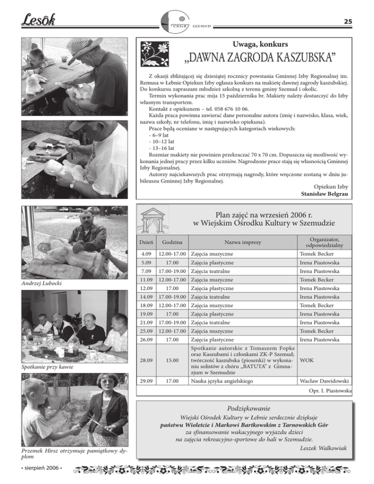 25 Uwaga, konkurs ,,DAWNA ZAGRODA KASZUBSKA” Z okazji zbliżającej się dziesiątej rocznicy powstania Gminnej Izby Regionalnej im. Remusa w Łebnie Opiekun Izby ogłasza konkurs na makietę dawnej zagrody kaszubskiej. Do konkursu zapraszam młodzież szkolną z terenu gminy Szemud i okolic. Termin wykonania prac mija 15 października br. Makiety należy dostarczyć do Izby własnym transportem. Kontakt z opiekunem – tel. 058 676 10 06. Każda praca powinna zawierać dane personalne autora (imię i nazwisko, klasa, wiek, nazwa szkoły, nr telefonu, imię i nazwisko opiekuna). Prace będą oceniane w następujących kategoriach wiekowych: - 6–9 lat - 10–12 lat - 13–16 lat Rozmiar makiety nie powinien przekraczać 70 x 70 cm. Dopuszcza się możliwość wykonania jednej pracy przez kilku uczniów. Nagrodzone prace stają się własnością Gminnej Izby Regionalnej. Autorzy najciekawszych prac otrzymają nagrody, które wręczone zostaną w dniu jubileuszu Gminnej Izby Regionalnej. Opiekun Izby Stanisław Belgrau Plan zajęć na wrzesień 2006 r. w Wiejskim Ośrodku Kultury w Szemudzie Dzień 4.09 5.09 7.09 Andrzej Lubocki Spotkanie przy kawie Godzina Nazwa imprezy 12.00-17.00 Zajęcia muzyczne 17.00 Zajęcia plastyczne 17.00-19.00 Zajęcia teatralne Organizator, odpowiedzialny Tomek Becker Irena Piastowska Irena Piastowska 11.09 12.00-17.00 Zajęcia muzyczne Tomek Becker 12.09 Irena Piastowska 17.00 Zajęcia plastyczne 14.09 17.00-19.00 Zajęcia teatralne Irena Piastowska 18.09 12.00-17.00 Zajęcia muzyczne Tomek Becker 19.09 Irena Piastowska 17.00 Zajęcia plastyczne 21.09 17.00-19.00 Zajęcia teatralne Irena Piastowska 25.09 12.00-17.00 Zajęcia muzyczne Tomek Becker 26.09 Irena Piastowska 17.00 Zajęcia plastyczne 28.09 15.00 Spotkanie autorskie z Tomaszem Fopke oraz Kaszubami i członkami ZK-P Szemud; twórczość kaszubska (piosenki) w wykona- WOK niu solistów z chóru „BATUTA” z Gimnazjum w Szemudzie 29.09 17.00 Nauka języka angielskiego Wacław Dawidowski Opr. I. Piastowska Podziękowanie Przemek Hirsz otrzymuje pamiątkowy dyplom • sierpień 2006 • Wiejski Ośrodek Kultury w Łebnie serdecznie dziękuje państwu Wioletcie i Markowi Bartkowskim z Tarnowskich Gór za sfinansowanie wakacyjnego wyjazdu dzieci na zajęcia rekreacyjno-sportowe do hali w Szemudzie. Leszek Walkowiak 26 Ogłoszenia GCKSiR Szemud UWAGA, KONKURS! - przypominamy ŻE NADAL TRWA konkurs fotograficzny „Cztery pory roku w gminie Szemud” Szczegółowy Regulamin Konkursu znajduje się do wglądu w: - Gminnym Centrum Kultury, Sportu i Rekreacji w Szemudzie, ul. Szkolna 4a, - Gminnej Izbie Regionalnej im. Remusa w Łebnie, 84-217 Szemud, Łebno, ul. Ks. Stawickiego 25, opiekun Stanisław Belgrau, - na stronie internetowej: www.szemud.pl. Zapraszamy do udziału! Stanisław Belgrau i Alicja Szarafin-Grządkowska Przed uczestnikami konkursu ostatni etap: lato Termin nadsyłania prac tego etapu upłynie w pierwszym dniu kalendarzowej jesieni. Finał całego konkursu oraz wystawa wszystkich prac odbędzie się w dniu jubileuszu Izby Regionalnej, czyli w listopadzie br. Wiek uczestników nie ma znaczenia, przy czym osoby niepełnoletnie uczestniczą w konkursie za pisemną zgodą rodziców (opiekunów). Konkurs polega na przesłaniu za pośrednictwem poczty na adres GCKSiR w Szemudzie lub osobistym złożeniu w siedzibie GCKSiR maksymalnie czterech zdjęć wraz z opisem: - format – 15 x 21 cm, - kolorowe, - mile widziane zdjęcia uwidoczniające prace polowe przebiegające w tradycyjny sposób oraz przy użyciu starych, tradycyjnych narzędzi rolniczych. Osoba zgłaszająca swój udział w konkursie podaje swoje dane osobowe (imię i nazwisko, adres oraz telefon kontaktowy), a także składa oświadczenie o posiadaniu praw autorskich do zdjęć. Autorom najciekawszych prac zostaną przyznane nagrody, które wręczymy w dniu jubileuszu Gminnej Izby Regionalnej. Uczestników konkursu prosimy, aby nie zamieszczali opisów bezpośrednio na zdjęciach, ponieważ bardzo często uszkadzają one zdjęcia. WOK ŁEBNO Wiejski Ośrodek Kultury w Łebnie ogłasza zapisy dzieci i młodzieży szkolnej na zajęcia stałe w roku kulturalnym 2006/2007. Od września br. planowane są następujące zajęcia: - nauka gry na instrumentach muzycznych - koło plastyczne - koło teatralne - warsztaty teatralne dla młodzieży - zespół wokalno-taneczny - zajęcia regionalne - nauka języków obcych (także dla dorosłych) Przypominamy o możliwości wynajęcia sali na zabawy i spotkania okolicznościowe dla dzieci oraz na uroczystości rodzinne. Leszek Walkowiak Kalendarz imprez sportowych w hali widowiskowo-sportowej w Szemudzie wrzesień 2006 r. Lp. Data Godzina zapisu Godzina rozpoczęcia 1 10.09 13.00 13.30 XII Otwarty Turniej Tenisa Stołowego o Puchar Wójta Gminy Szemud. 2 16.09 19.00 19.15 Zakończenie lata – Otwarty Turniej gry w karty „baśka”. Wpisowe 5 zł 3 17.09 12.00 12.30 XIII Otwarty Turniej Piłki Siatkowej o Puchar Wójta Gminy Szemud. Wpisowe drużyny – 70 zł. Zapisy do 11 września 2006 r. 4 24.09 12.00 12.30 XVI Otwarty Turniej Badmintona o Nagrodę GCKSiR w Szemudzie gry podwójne juniorów i seniorów. Wpisowe: junior 3 zł, senior 7 zł 5 30.09 15.00 15.30 IX Otwarty Turniej Gry w Szachy o Nagrodę Wójta Gminy Szemud. Nazwa imprezy Gminne Centrum Kultury Sportu i Rekreacji w Szemudzie serdecznie zaprasza dzieci i młodzież szkolną na zajęcia sportowe do hali sportowej w Szemudzie przez okres całych wakacji codziennie od poniedziałku do piątku w godzinach od 10.00 do 16.00. Zajęcia rekreacyjno-sportowe obejmować będą następujące dyscypliny: piłka halowa, tenis stołowy, badminton, siatkówka, koszykówka, ringo. B. Napieralski • sierpień 2006 • 27 Turniej LATA piłki nożnej w Łebnie W niedzielę 23 lipca 2006 r. w Łebnie Gminne Centrum Kultury Sportu i Rekreacji w Szemudzie wraz z działaczami klubu sportowego BARKA Łebno zorganizowało turniej LATA o Puchar Wójta