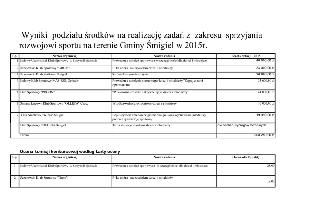 Wyniki podziału środków na realizację zadań z zakresu sprzyjania rozwojowi sportu na terenie Gminy Śmigiel w 2015r. Lp. Nazwa organizacji 1 Ludowy Uczniowski Klub Sportowy w Starym Bojanowie Nazwa zadania Prowadznie szkoleń sportowych w szczególności dla dzieci i młodzieży Kwota dotacji 2015 40 000,00 zł 2 Uczniowski Klub Sportowy "GROM" Piłka nożna nauczycielem dzieci i młodzieży 34 000,00 zł 3 Uczniowski Klub Siatkarek Śmigiel Siatkówka-sposób na życie 20 660,00 zł 4 Ludowy Klub Sportowy MAS-ROL Spławie Prowadznie szkolenia sportowego dzieci i młodzieży "Zagraj z nami Spławiakami" 33 600,00 zł 5 Klub Sportowy "POGOŃ" "Piłka nożna- zdrowe i aktywne życie dzieci i młodzieży 44 000,00 zł 6 Gminny Ludowy Klub Sportowy "ORLĘTA" Czacz Współzawodnictwo sportowe dzieci i młodzieży 16 000,00 zł 7 Klub Szachowy "Wieża" Śmigiel Popularyzacja szachów w gminie Śmigiel oraz wychowanie młodzieży poprzez rywalizację sportową 8 Klub Sportowy POLONIA Śmigiel Tenis stołowy- szkolenie dzieci i młodzieży 19 990,00 zł nie spełnia wymogów formalnych 208 250,00 zł Razem Ocena komisji konkursowej według karty oceny Lp. Nazwa organizacji Nazwa zadania 1 Ludowy Uczniowski Klub Sportowy w Starym Bojanowie Prowadznie szkoleń sportowych w szczególnosci dla dzieci i młodzieży 2 Uczniowski Klub Sportowy "Grom" Piłka nożna nauczycielem dzieci i młodzieży Ocena ofert/punkty 25,00 18,00 3 Uczniowski Klub Siatkarek Śmigiel Siatkówka-sposób na życie 20,00 4. Ludowy Klub Sportowy MAS-ROL Spławie Prowadznie szkolenia sportowego dzieci i młodzieży "Zagraj z nami Spławiakami" 22,50 5 Klub Sportowy "Pogoń "Śmigiel Piłka nożna- zdrowe i aktywne życie dzieci i młodzieży 24,00 6. Gminny Ludowy Klub Sportowy "ORLĘTA" Czacz Współzawodnictwo sportowe dzieci i młodzieży 20,00 7 Klub Szachowy "Wieża" Śmigiel Popularyzacja szachów w gminie Śmigiel oraz wychowanie młodzieży poprzez rywalizację sportową 27,00 8. Klub Sportowy POLONIA Śmigiel Tenis stołowy- szkolenie dzieci i młodzieży 0 Wymagana liczba punktów to 18 Organizacje którym przyznano środki proszone sa o dostarczenie zaktualizowanego kosztorysu zgodnie z przyznaną dotacja Śmigiel dnia 22.12.2014r. Burmistrz Śmigla /Małgorzata Adamczak/