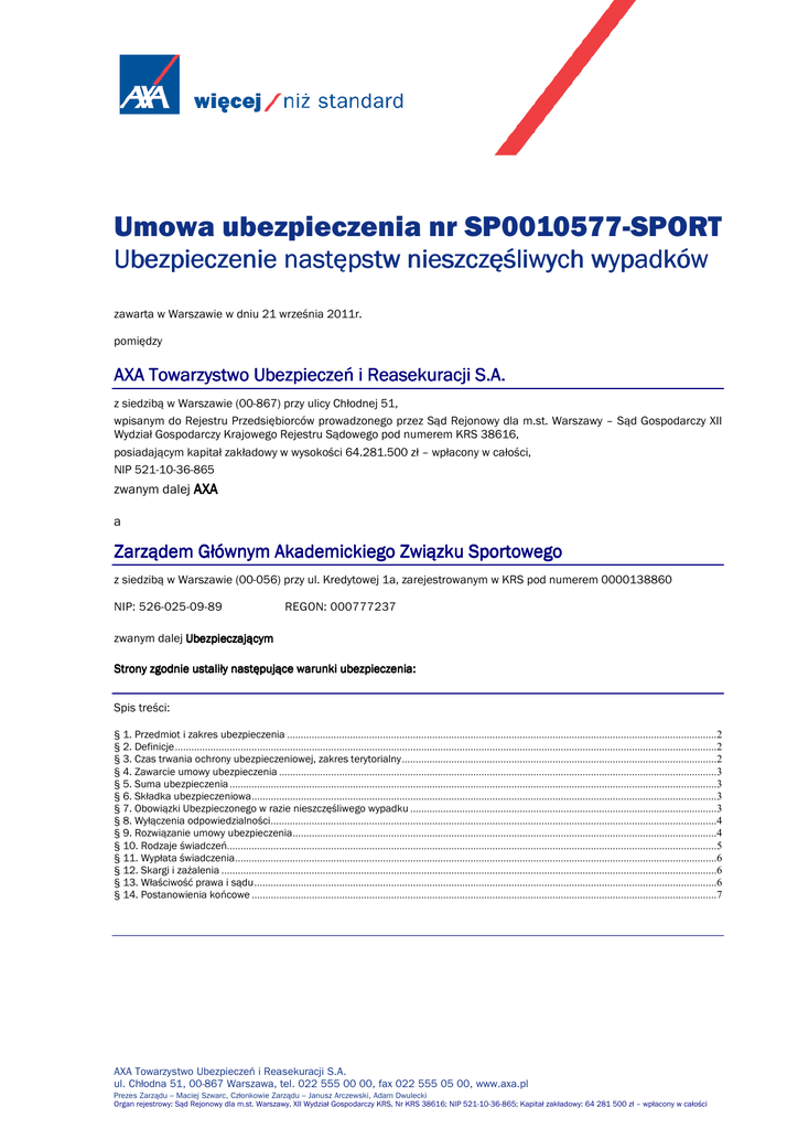 Umowa ubezpieczenia nr SP0010577-SPORT Ubezpieczenie Ubezpieczenie następstw nieszczęśliwych wypadków zawarta w Warszawie w dniu 21 września 2011r. pomiędzy AXA Towarzystwo Ubezpieczeń i Reasekuracji S.A. z siedzibą w Warszawie (00-867) przy ulicy Chłodnej 51, wpisanym do Rejestru Przedsiębiorców prowadzonego przez Sąd Rejonowy dla m.st. Warszawy – Sąd Gospodarczy XII Wydział Gospodarczy Krajowego Rejestru Sądowego pod numerem KRS 38616, posiadającym kapitał zakładowy w wysokości 64.281.500 zł – wpłacony w całości, NIP 521-10-36-865 zwanym dalej AXA a Zarządem Głównym Akademickiego Akademickiego Związku Związku Sportowego Sportowego z siedzibą w Warszawie (00-056) przy ul. Kredytowej 1a, zarejestrowanym w KRS pod numerem 0000138860 NIP: 526-025-09-89 REGON: 000777237 zwanym dalej Ubezpieczającym Ubezpieczającym Strony zgodnie ustaliły następujące warunki ubezpieczenia: Spis treści: § 1. Przedmiot i zakres ubezpieczenia .............................................................................................................................................................2 § 2. Definicje......................................................................................................................................................................................................2 § 3. Czas trwania ochrony ubezpieczeniowej, zakres terytorialny...................................................................................................................2 § 4. Zawarcie umowy ubezpieczenia ................................................................................................................................................................3 § 5. Suma ubezpieczenia ..................................................................................................................................................................................3 § 6. Składka ubezpieczeniowa..........................................................................................................................................................................3 § 7. Obowiązki Ubezpieczonego w razie nieszczęśliwego wypadku ................................................................................................................3 § 8. Wyłączenia odpowiedzialności...................................................................................................................................................................4 § 9. Rozwiązanie umowy ubezpieczenia...........................................................................................................................................................4 § 10. Rodzaje świadczeń...................................................................................................................................................................................5 § 11. Wypłata świadczenia................................................................................................................................................................................6 § 12. Skargi i zażalenia .....................................................................................................................................................................................6 § 13. Właściwość prawa i sądu.........................................................................................................................................................................6 § 14. Postanowienia końcowe ..........................................................................................................................................................................7 AXA Towarzystwo Ubezpieczeń i Reasekuracji S.A. ul. Chłodna 51, 00-867 Warszawa, tel. 022 555 00 00, fax 022 555 05 00, www.axa.pl Prezes Zarządu – Maciej Szwarc, Członkowie Zarządu – Janusz Arczewski, Adam Dwulecki Organ rejestrowy: Sąd Rejonowy dla m.st. Warszawy, XII Wydział Gospodarczy KRS, Nr KRS 38616; NIP 521-10-36-865; Kapitał zakładowy: 64 281 500 zł – wpłacony w całości UMOWA UBEZPIECZENIA NR SP0010577SP0010577-SPORT Ubezpieczenie następstw nieszczęśliwych nieszczęśliwych wypadków § 1. Przedmiot i zakres ubezpieczenia 1. 2. Przedmiotem ubezpieczenia w niniejszej umowie ubezpieczenia są następstwa nieszczęśliwego wypadku polegające na obrażeniach ciała Ubezpieczonego, skutkujące jego uszczerbkiem na zdrowiu lub śmiercią Ubezpieczonego. Ochrona ubezpieczeniowa obejmuje świadczenia z tytułu: • śmierci Ubezpieczonego w następstwie nieszczęśliwego wypadku, • trwałego uszczerbku na zdrowiu Ubezpieczonego w następstwie nieszczęśliwego wypadku, • pobytu Ubezpieczonego w szpitalu w następstwie nieszczęśliwego wypadku, • zwrotu kosztów nabycia lub naprawy protez i środków pomocniczych dla Ubezpieczonego w następstwie nieszczęśliwego wypadku, • zwrotu kosztów leczenia i rehabilitacji Ubezpieczonego w następstwie nieszczęśliwego wypadku. § 2. 2. Definicje Przez użyte w niniejszej umowie ubezpieczenia określenia rozumie się: 1. nieszczęśliwy wypadek – przypadkowe, nagłe zdarzenie wywołane wyłącznie przyczyną zewnętrzną, niezależne od woli ani stanu zdrowia Ubezpieczonego. Za nieszczęśliwy wypadek nie uważa się następstw zdrowotnych przeciążenia, wysiłku, dźwignięcia, pochylenia. 2. obrażenia ciała – uszkodzenie narządów lub układów narządów Ubezpieczonego powstałe bezpośrednio w następstwie nieszczęśliwego wypadku. 3. pobyt w szpitalu – trwający nieprzerwanie co najmniej 24 godziny pobyt Ubezpieczonego w szpitalu w celu leczenia doznanych obrażeń ciała. W rozumieniu niniejszej umowy okres pobytu w szpitalu rozpoczyna się w dniu i godzinie przyjęcia Ubezpieczonego do szpitala, a kończy w dniu i godzinie wypisania Ubezpieczonego ze szpitala; 4. proteza - sztuczne uzupełnienie brakującej części lub całoś