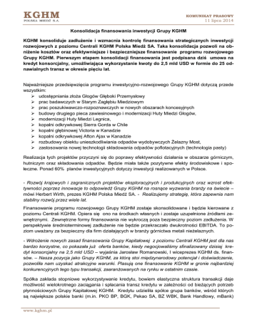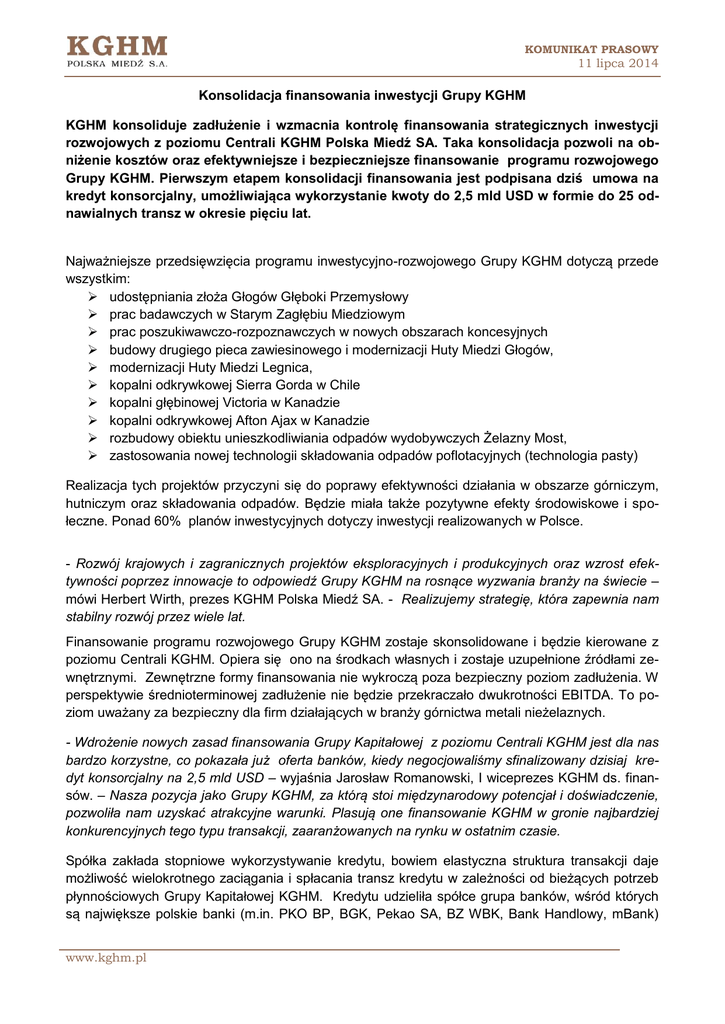 KOMUNIKAT PRASOWY 11 lipca 2014 Konsolidacja finansowania inwestycji Grupy KGHM KGHM konsoliduje zadłużenie i wzmacnia kontrolę finansowania strategicznych inwestycji rozwojowych z poziomu Centrali KGHM Polska Miedź SA. Taka konsolidacja pozwoli na obniżenie kosztów oraz efektywniejsze i bezpieczniejsze finansowanie programu rozwojowego Grupy KGHM. Pierwszym etapem konsolidacji finansowania jest podpisana dziś umowa na kredyt konsorcjalny, umożliwiająca wykorzystanie kwoty do 2,5 mld USD w formie do 25 odnawialnych transz w okresie pięciu lat. Najważniejsze przedsięwzięcia programu inwestycyjno-rozwojowego Grupy KGHM dotyczą przede wszystkim: udostępniania złoża Głogów Głęboki Przemysłowy prac badawczych w Starym Zagłębiu Miedziowym prac poszukiwawczo-rozpoznawczych w nowych obszarach koncesyjnych budowy drugiego pieca zawiesinowego i modernizacji Huty Miedzi Głogów, modernizacji Huty Miedzi Legnica, kopalni odkrywkowej Sierra Gorda w Chile kopalni głębinowej Victoria w Kanadzie kopalni odkrywkowej Afton Ajax w Kanadzie rozbudowy obiektu unieszkodliwiania odpadów wydobywczych Żelazny Most, zastosowania nowej technologii składowania odpadów poflotacyjnych (technologia pasty) Realizacja tych projektów przyczyni się do poprawy efektywności działania w obszarze górniczym, hutniczym oraz składowania odpadów. Będzie miała także pozytywne efekty środowiskowe i społeczne. Ponad 60% planów inwestycyjnych dotyczy inwestycji realizowanych w Polsce. - Rozwój krajowych i zagranicznych projektów eksploracyjnych i produkcyjnych oraz wzrost efektywności poprzez innowacje to odpowiedź Grupy KGHM na rosnące wyzwania branży na świecie – mówi Herbert Wirth, prezes KGHM Polska Miedź SA. - Realizujemy strategię, która zapewnia nam stabilny rozwój przez wiele lat. Finansowanie programu rozwojowego Grupy KGHM zostaje skonsolidowane i będzie kierowane z poziomu Centrali KGHM. Opiera się ono na środkach własnych i zostaje uzupełnione źródłami zewnętrznymi. Zewnętrzne formy finansowania nie wykroczą poza bezpieczny poziom zadłużenia. W perspektywie średnioterminowej zadłużenie nie będzie przekraczało dwukrotności EBITDA. To poziom uważany za bezpieczny dla firm działających w branży górnictwa metali nieżelaznych. - Wdrożenie nowych zasad finansowania Grupy Kapitałowej z poziomu Centrali KGHM jest dla nas bardzo korzystne, co pokazała już oferta banków, kiedy negocjowaliśmy sfinalizowany dzisiaj kredyt konsorcjalny na 2,5 mld USD – wyjaśnia Jarosław Romanowski, I wiceprezes KGHM ds. finansów. – Nasza pozycja jako Grupy KGHM, za którą stoi międzynarodowy potencjał i doświadczenie, pozwoliła nam uzyskać atrakcyjne warunki. Plasują one finansowanie KGHM w gronie najbardziej konkurencyjnych tego typu transakcji, zaaranżowanych na rynku w ostatnim czasie. Spółka zakłada stopniowe wykorzystywanie kredytu, bowiem elastyczna struktura transakcji daje możliwość wielokrotnego zaciągania i spłacania transz kredytu w zależności od bieżących potrzeb płynnościowych Grupy Kapitałowej KGHM. Kredytu udzieliła spółce grupa banków, wśród których są największe polskie banki (m.in. PKO BP, BGK, Pekao SA, BZ WBK, Bank Handlowy, mBank) www.kghm.pl KOMUNIKAT PRASOWY 11 lipca 2014 oraz banki z Europy, Kanady, USA i Japonii, współpracujące dotychczas z KGHM. Udostępniony kredyt zostanie przeznaczony na wymienione wcześniej inwestycje Grupy KGHM oraz refinansowanie zadłużenia KGHM International. Operacja refinansowania (700 mln USD) przyniesie w perspektywie pięciu lat istotne oszczędności w kosztach obsługi finasowania oraz pozwoli na zwolnienie zabezpieczeń ustanowionych na majątku spółki KGHM International i wyeliminowanie restrykcyjnych zobowiązań finansowych i niefinansowych ograniczających jej rozwój. KGHM jest w tej chwili w trakcie negocjacji pożyczki z Europejskiego Banku Inwestycyjnego. EBI to międzynarodowa, niekomercyjna instytucja Unii Europejskiej, która finansuje projekty przyczyniające się do rozwoju regionalnego, przyjazne dla środowiska i promujące innowacyjne rozwiązania oraz poprawiające bezpieczeństwo i warunki pracy. Departament Komunikacji KGHM Polska Miedź S.A. www.kghm.pl