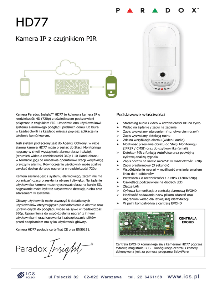 HD77 Kamera IP z czujnikiem PIR Kamera Paradox Insight™ HD77 to kolorowa kamera IP o rozdzielczość HD (720p) z oświetlaczem podczerwieni połączona z czujnikiem PIR. Umożliwia ona użytkownikowi systemu alarmowego podgląd i podsłuch domu lub biura w każdej chwili i z każdego miejsca poprzez aplikację na telefonie komórkowym. Jeśli system podłączony jest do Agencji Ochrony, w razie alarmu kamera HD77 może przesłać do Stacji Monitoringu nagrany w chwili wystąpienia alarmu obraz i dźwięk (strumień wideo o rozdzielczości 360p i 10 klatek obrazu w formacie jpg) co umożliwia operatorowi stacji weryfikację przyczyny alarmu. Równocześnie użytkownik może zdalnie uzyskać dostęp do tego nagrania w rozdzielczości 720p. Kamera zasilana jest z systemu alarmowego, zatem nie ma ograniczeń czasu przesyłania obrazu i dźwięku. Na żądanie użytkownika kamera może rejestrować obraz na karcie SD, nagrywanie może być też aktywowane detekcją ruchu oraz zdarzeniem w systemie. Główny użytkownik może utworzyć 8 dodatkowych użytkowników otrzymujących powiadomienie o alarmie oraz uprawnionych do podglądu wideo na żywo w rozdzielczości 360p. Uprawnienia do współdzielenia nagrań z innymi użytkownikami oraz kasowania i zabezpieczania plików przed nadpisaniem ma tylko użytkownik główny. Podstawowe właściwości Streaming audio i video w rozdzielczości HD na żywo Wideo na żądanie / zapis na żądanie Zapis wyzwalany zdarzeniem (np. otwarciem drzwi) Zapis wyzwalany detekcją ruchu Zdalna weryfikacja alarmu (wideo i audio) Możliwość przesłania obrazu do Stacji Monitoringu (IPRS7 / CMSI) oraz do użytkownika (email) Detektor PIR z funkcją AutoPulse oraz podwójną cyfrową analizą sygnału Zapis obrazu na karcie microSD w rozdzielczości 720p Zapis prealarmowy (3 sekundy) Współdzielenie nagrań – możliwość wysłania emailem linku do 4 odbiorców Przetwornik o rozdzielczości 1.4 MPix (1280x720p) Oświetlacz podczerwieni na diodach LED Złącze LAN Cyfrowa komunikacja z centralą alarmową EVOHD Możliwość nadawania nazw plikom zdarzeń oraz nagraniom wideo dla łatwiejszej identyfikacji W pełni kompatybilna z centralą EVOHD CENTRALA EVOHD Kamera HD77 posiada certyfikat CE oraz EN50131. Centrala EVOHD komunikuje się z kamerami HD77 poprzez cyfrową magistralę BUS – konfiguracja centrali i kamery dokonywana jest za pomocą programu BabyWare Pole detekcji – widok z góry Pole detekcji – widok z boku: Aplikacja mobilna Paradox Insight Dane techniczne: Rozdzielczość Strumień wideo Audio Detekcja ruchu Pole detekcji Kąt widzenia kamery Wysokość instalacji Opcje instalacji Przetwornik Zasilanie Pobór prądu Wymiary Temperatura pracy 1280 x 720 – możliwość rozpoznania osoby z odległości 4m w warunkach oświetlenia i w ciemności 360p H.264 10kl/s 16 bit/16kHz, 32Kb/s, mono 0,2m/s ÷ 2,5m/s 12 x 12m / 110° 62,7°(V) x 91,4°(H) 2,1 ÷ 2,7m Na ścianie lub w narożniku (uchwyt) 1,4MPix, CMOS 11,2 ÷ 16V DC 330mA 150 x 75 x 50mm -10°C ÷ +40°C Centrala alarmowa Program Instalatora Emulator odbiornika IP/GPRS Program użytkownika Kompatybilność: EVOHD BabyWare IPRS-7 NEware Aplikacja Paradox Insight umożliwia użytkownikowi natychmiastowy dostęp do kamer HD77 zainstalowanych w różnych lokalizacjach (dom, firma). Za pomocą aplikacji użytkownik może: V1.11 V2.8 V4.0 V4.3 Oglądać obraz z kamer na żywo bez ograniczeń Zarządzać systemem alarmowym (uzbrajać/rozbrajać) Pobierać nagrania na żądanie, nagrania wymuszone detekcją ruchu oraz zdarzeniem w celu ich obejrzenia lub zapisania na urządzeniu przenośnym Odbierać powiadomienie o alarmach Spowodować wysłanie powiadomienia o alarmie do Agencji Ochrony (przycisk Panic w aplikacji) Wejść do logu zdarzeń systemu Aplikacja jest kompatybilna z systemem iOS V6.0 lub wyższym, w przygotowaniu wersja na system Android.