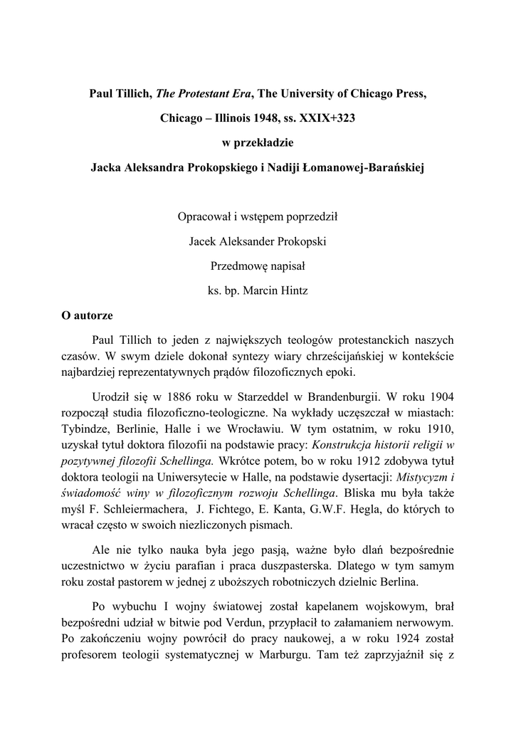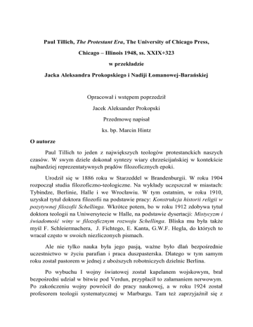 Paul Tillich, The Protestant Era, The University of Chicago Press, Chicago – Illinois 1948, ss. XXIX+323 w przekładzie Jacka Aleksandra Prokopskiego i Nadiji Łomanowej-Barańskiej Opracował i wstępem poprzedził Jacek Aleksander Prokopski Przedmowę napisał ks. bp. Marcin Hintz O autorze Paul Tillich to jeden z największych teologów protestanckich naszych czasów. W swym dziele dokonał syntezy wiary chrześcijańskiej w kontekście najbardziej reprezentatywnych prądów filozoficznych epoki. Urodził się w 1886 roku w Starzeddel w Brandenburgii. W roku 1904 rozpoczął studia filozoficzno-teologiczne. Na wykłady uczęszczał w miastach: Tybindze, Berlinie, Halle i we Wrocławiu. W tym ostatnim, w roku 1910, uzyskał tytuł doktora filozofii na podstawie pracy: Konstrukcja historii religii w pozytywnej filozofii Schellinga. Wkrótce potem, bo w roku 1912 zdobywa tytuł doktora teologii na Uniwersytecie w Halle, na podstawie dysertacji: Mistycyzm i świadomość winy w filozoficznym rozwoju Schellinga. Bliska mu była także myśl F. Schleiermachera, J. Fichtego, E. Kanta, G.W.F. Hegla, do których to wracał często w swoich niezliczonych pismach. Ale nie tylko nauka była jego pasją, ważne było dlań bezpośrednie uczestnictwo w życiu parafian i praca duszpasterska. Dlatego w tym samym roku został pastorem w jednej z uboższych robotniczych dzielnic Berlina. Po wybuchu I wojny światowej został kapelanem wojskowym, brał bezpośredni udział w bitwie pod Verdun, przypłacił to załamaniem nerwowym. Po zakończeniu wojny powrócił do pracy naukowej, a w roku 1924 został profesorem teologii systematycznej w Marburgu. Tam też zaprzyjaźnił się z Rudolfem Otto i poznał Rudolfa Bultmana i Martina Heideggera. W rok później został mianowany profesorem filozofii i studiów religijnych na Politechnice w Dreźnie. W roku 1929 przeniósł się do Frankfurtu nad Menem, tam objął katedrę po Maksie Schelerze i nawiązał owocną współpracę z Maksem Horkheimerem i Theodorem W. Adornem. W tym czasie przyłączył się również do Socjaldemokratycznej Partii Niemiec. W roku 1933 kiedy Adolf Hitler został mianowany Kanclerzem Rzeszy, Tillich został pozbawiony katedry. Bezpośrednią przyczyną zawieszenia go w czynnościach profesorskich była publikacja anty nazistowskiego tekstu pt. Socjalistyczne rozstrzygnięcie oraz zajęcie pozytywnego stanowiska w sprawie żydowskich studentów. Wkrótce potem, bo w maju 1933 tekst zostaje publicznie spalony we Frankfurcie. W listopadzie za namową i z pomocą Reinholda Niebuhra, Tillich wraz z rodziną emigruje do USA, gdzie zostaje profesorem Union Theological Seminar i Columbia University w Nowym Jorku. W roku 1948 publikuje Erę Protestancką, która rewolucjonizowała myślenie teologiczno-filozoficzno-społeczne. Wytężona praca badawcza i powszechne uznanie sprawia, że w roku 1955 otrzymuje profesurę na Uniwersytecie Harwarda w Cambridge. Podróżuje po Stanach Zjednoczonych z serią wykładów o tematyce teologiczno-filozoficzno-etycznej. W roku 1962 przenosi się do Chicago, gdzie na wydziale teologicznym tamtejszego uniwersytetu – Divinity School, obejmuje katedrę teologii. Dzięki profesorowi teologii Johnowi Nuveenowi, który prowadzi seminarium z historii religii wspólnie z Mircea Eliadem, uznanym badaczem religii, Tillich nawiązuje z nim naukowe relacje. Rok 1963 to podróż do Izraela i spotkanie z Martinem Buberem, żydowskim egzystencjalistą. Dwa lata później w roku 1965 Tillich umiera w szpitalu na atak serca. Rok później prochy Tillicha zostają ponownie złożone w Parku Paula Tillicha w mieście New Harmony w stanie Indiana, w hrabstwie Posey. Era Protestancka to książka, która składa się z pięciu części i osiemnastu rozdziałów. Wstępu Autora: s. IX – XXIX, spisu treści, s. XXXI, tekstu: 3 – 269, posłowia J.L. Adamsa, s. 273 – 316 i indeksu osób, s. 319 – 323. Spis Treści Słowo wstępne autora Część I: Religia i historia Rozdział 1: Filozofia i przeznaczenie Rozdział 2: Historyczne i niehistoryczne interpretacje historii Rozdział 3. Kairos Część II: Religia i kultura Rozdział 4: Religia i kultura świecka Rozdział 5: Realizm i wiara Rozdział 6: Filozofia i teologia Rozdział 7: Natura i sakrament Część III: Religia i etyka Rozdział 8: Idea a osobowość idealna Rozdział 9: Ponad moralne sumienie Rozdział 10: Etyka w zmieniającym się świecie Rozdział 11: Zasada protestantyzmu a sytuacja proletariacka Część IV: Protestantyzm Rozdział 12: Słowo religii Rozdział 13: Przesłanie protestantyzmu a człowiek współczesny Rozdział 14: Formująca siła protestantyzmu Rozdział 15: Koniec ery protestantyzmu? Część V: Obecny kryzys Rozdział 16: Klęski naszych czasów Rozdział 17: Marksizm i socjalizm chrześcijański Rozdział 18: Problemy duchowe powojennej Europy Posłowie Jamesa Luthra Adamsa: Tillicha koncepcja ery protestantyzmu O książce W słowie wstępnym Paul Tillich zwraca uwagę na fakt utraty dokładnie opracowanego narzędzia, jakim był rodzimy język niemiecki oraz nowe doświadczenia w cywilizacji amerykańskiej. Wspomina dramatyczne wydarzenia w Niemczech za czasów nazizmu, mówi o klęsce świata, w którym niegdyś żył i pracował przez czterdzieści siedem lat. W rozdziale pierwszym części pierwszej rozprawia się z problemem filozofii i przeznaczenia. Powiada, że historia filozofii ukazuje, że byt ludzki i świata ma swoje przeznaczenie. Wreszcie, że każda skończona rzecz, istota, posiada wewnętrzny imperatyw bycia, inaczej mówiąc, zdolność do przeznaczenia. W rozdziale drugim filozof dotyka problemu historycznych i niehistorycznych interpretacji historii. Omawia dwa typy historii: pierwszy, według którego historia jest interpretowana przez naturę i drugi, według którego historia jest interpretowana przez siebie samą. W rozdziale trzecim autor wzywa do obudzenia świadomości historycznej, czasów, ludzi,