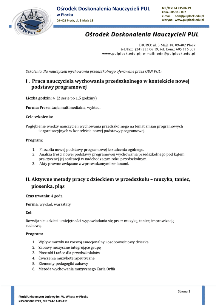 Ośrodek Doskonalenia Nauczycieli PUL w Płocku 09-402 Płock, ul. 3 Maja 18 tel./fax: 24 235 06 19 kom. 605 116 007 e-mail: [email protected] witryna: www.pulplock.edu.pl Ośrodek D oskonale nia Nauczy cie li PUL BIURO: ul. 3 Maja 18, 09-402 Płock tel./fax: (24) 235 06 19, tel. kom.: 605 116 007 w w w.p u lp l ock . ed u .p l; e - ma il : od n @p u lp loc k. ed u .p l Szkolenia dla nauczycieli wychowania przedszkolnego oferowane przez ODN PUL: I . Praca nauczyciela wychowania przedszkolnego w kontekście nowej podstawy programowej Liczba godzin: 4 (2 sesje po 1,5 godziny) Forma: Prezentacja multimedialna, wykład. Cele szkolenia: Pogłębienie wiedzy nauczycieli wychowania przedszkolnego na temat zmian programowych i organizacyjnych w kontekście nowej podstawy programowej. Program: 1. 2. Filozofia nowej podstawy programowej kształcenia ogólnego. Analiza treści nowej podstawy programowej wychowania przedszkolnego pod kątem praktycznej jej realizacji w nadchodzącym roku przedszkolnym. 3. Akty prawne związane z wprowadzonymi zmianami. II. Aktywne metody pracy z dzieckiem w przedszkolu – muzyka, taniec, piosenka, pląs Czas trwania: 4 godz. Forma: wykład, warsztaty Cel: Rozwijanie u dzieci umiejętności wypowiadania się przez muzykę, taniec, improwizację ruchową. Program: 1. 2. 3. 4. 5. 6. Wpływ muzyki na rozwój emocjonalny i osobowościowy dziecka Zabawy muzyczne integrujące grupę Piosenki i tańce dla przedszkolaków Ćwiczenia muzykoterapeutyczne Elementy pedagogiki zabawy Metoda wychowania muzycznego Carla Orffa Strona 1 Płocki Uniwersytet Ludowy im. W. Witosa w Płocku KRS 0000061729, NIP 774-11-83-411 Ośrodek Doskonalenia Nauczycieli PUL w Płocku 09-402 Płock, ul. 3 Maja 18 tel./fax: 24 235 06 19 kom. 605 116 007 e-mail: [email protected] witryna: www.pulplock.edu.pl III. Nowe i nie nowe techniki plastyczne w przedszkolu Czas trwania: 4 godz. Forma: wykład, warsztaty Cel: Wspieranie rozwoju emocjonalnego, kreatywności i twórczości dzieci poprzez działania plastyczne. Program: 1. Wpływ plastyki na rozwój wzorów i potrzeb estetycznych dziecka 2. Wypowiadanie się w różnych formach plastycznych: Kolografia – odbitki ze „szmacianej matrycy” Monotypia – odbitki z matrycy z pleksi 3-7 mm, gruba tektura, (dziury) Stemplowanie – nietypowe materiały, które posłużą nam za stemple Frottage – to technika odciskania faktury z dowolnych przedmiotów, Collage – łączenie różnych technik plastycznych (naklejanie gazet, zdjęć, szmatek, wydzieranie, malowanie, rysowanie) Rysowanie węglem – do rysowania węglem najlepsze są papiery o powierzchniach nieco szorstkich (pakowe, szare lub białe, można też rysować na gazecie. Malowanie akwarelą – nazwa techniki (aqua po łacinie znaczy woda) wskazuje, że woda jest jednym z głównych jej składników. Jest to trudna technika, ale można ją już stosować w przedszkolu. Malowanie gąbką – szablon dekoracyjny Malowanie na folii ogrodniczej – zasady jak przy malowaniu na szkle. Wydzieranka kolorowa – formy wydarte z kolorowego papieru różnego gatunki Rysunek lawowany – uzupełniony podmalowany rozwodnionym tuszem czarny sepia, kolorowy. Rysunek patykiem tuszem na białym papierze 3. Profesjonalne przygotowanie dzieci do udziału w konkursach plastycznych IV. Ćwiczenia i zabawy relaksacyjne w przedszkolu Czas trwania: 4 godz. Forma: wykład, warsztaty Cel: kształtowanie u dzieci odporności emocjonalnej Strona 2 Płocki Uniwersytet Ludowy im. W. Witosa w Płocku KRS 0000061729, NIP 774-11-83-411 Ośrodek Doskonalenia Nauczycieli PUL w Płocku 09-402 Płock, ul. 3 Maja 18 tel./fax: 24 235 06 19 kom. 605 116 007 e-mail: [email protected] witryna: www.pulplock.edu.pl Program: 1. Znaczenie relaksacji dla prawidłowego funkcjonowania i rozwoju psychofizycznego dziecka 2. Nauka prawidłowego oddychania – przykłady ćwiczeń 3. Rozwój koordynacji, motoryki i równowagi 4. Zabawy na odprężenie i koncentrację 5. Relaks poprzez gimnastykę 6. Baśnie relaksacyjne V. Nowoczesne metody pracy w wychowaniu przedszkolnym Czas trwania: 4 godz. Forma: wykład, warsztaty Cel: Zapoznanie nauczycieli z nowoczesnymi metodami wychowania przedszkolnego Program: 1. Metoda Marii Montessori alternatywą dla tradycyjnego wychowania i nauczania dzieci – poznanie założeń, celów, form pracy, pokaz pomocy i praktycznych ćwiczeń. 2. Bajkoterapia jako metoda pomocy dziecku w okresie przedszkolnym – rola baśni w rozwoju psychicznych dziecka, wpływ na rozwój wyobraźni, samodzielne układanie baśni, interpretacja poprzez teatrzyk kukiełkowy. 3. Innowacja pedagogiczna „Przedszkole bez zabawek”. VI. Awans zawodowy nauczycieli przedszkoli (4 godz.) 1. Awans zawodowy nauczyciela stażysty na stopień nauczyciela kontraktowego • • • • Awans zawodowy nauczyciela w świetle prawa Plan rozwoju zawodowego nauczyciela stażysty Sporządzenie sprawozdania za okres stażu Prezentacja dorobku zawodowego nauczyciela stażysty 2. Awans zawodowy na stopień nauczyciela mianowanego • • • Awans zawodowy nauczyciela w świetle prawa Plan rozwoju zawodowego nauczyciela kontraktowego Sporządzenie sprawozdania za okres stażu Strona 3 Płocki Uniwersytet Ludowy im. W. Witosa w Płocku KRS 0000061729, NIP 774-11-83-411 Ośrodek Doskonalenia Nauczycieli PUL w Płocku 09-402 Płock, ul. 3 Maja 18 • tel./fax: 24 235 06 19 kom. 605 116 007 e-mail: [email protected] witryna: www.pulplock.edu.pl Prezentacja dorobku zawodowego nauczyciela kontraktowego 3. Awans zawodowy na stopień nauczyciela dyplomowanego • • Plan rozwoju zawodowego nauczyciela mianowanego Dokumentowanie dorobku • Zasady przeprowadzania rozmowy z komisją kwalifikacyjną Strona 4 Płocki Uniwersytet Ludowy im. W. Witosa w Płocku KRS 0000061729, NIP 774-11-83-411