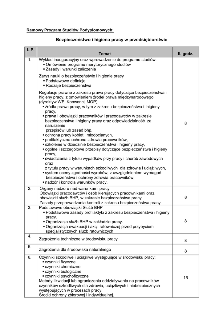 Ramowy Program Studiów Podyplomowych: Bezpieczeństwo i higiena pracy w przedsiębiorstwie L.P. 1. Temat Wykład inauguracyjny oraz wprowadzenie do programu studiów. Omówienie programu merytorycznego studiów Zasady i warunki zaliczenia Il. godz. Zarys nauki o bezpieczeństwie i higienie pracy Podstawowe definicje Rodzaje bezpieczeństwa Regulacje prawne z zakresu prawa pracy dotyczące bezpieczeństwa i higieny pracy, z omówieniem źródeł prawa międzynarodowego (dyrektyw WE, Konwencji MOP): źródła prawa pracy, w tym z zakresu bezpieczeństwa i higieny pracy, prawa i obowiązki pracowników i pracodawców w zakresie bezpieczeństwa i higieny pracy oraz odpowiedzialność za naruszenie przepisów lub zasad bhp, ochrona pracy kobiet i młodocianych, profilaktyczna ochrona zdrowia pracowników, szkolenie w dziedzinie bezpieczeństwa i higieny pracy, ogólne i szczegółowe przepisy dotyczące bezpieczeństwa i higieny pracy, świadczenia z tytułu wypadków przy pracy i chorób zawodowych oraz z tytułu pracy w warunkach szkodliwych dla zdrowia i uciąŜliwych, system oceny zgodności wyrobów, z uwzględnieniem wymagań bezpieczeństwa i ochrony zdrowia pracowników, nadzór i kontrola warunków pracy. 2. 3. 4. 5. 6. Organy nadzoru nad warunkami pracy Obowiązki pracodawców i osób kierujących pracownikami oraz obowiązki słuŜb BHP, w zakresie bezpieczeństwa pracy. Zasady przeprowadzania kontroli z zakresu bezpieczeństwa pracy. Podstawowe obowiązki SłuŜb BHP Podstawowe zasady profilaktyki z zakresu bezpieczeństwa i higieny pracy. Organizacja słuŜb BHP w zakładzie pracy. Organizacja ewakuacji i akcji ratowniczej przed przybyciem specjalistycznych słuŜb ratowniczych. 8 8 8 ZagroŜenia techniczne w środowisku pracy 8 ZagroŜenia dla środowiska naturalnego 8 Czynniki szkodliwe i uciąŜliwe występujące w środowisku pracy: czynniki fizyczne czynniki chemiczne czynniki biologiczne czynniki psychofizyczne Metody likwidacji lub ograniczenia oddziaływania na pracowników czynników szkodliwych dla zdrowia, uciąŜliwych i niebezpiecznych występujących w procesach pracy. Środki ochrony zbiorowej i indywidualnej. 16 7. 8. 9. 10. 11. 12. 13. 14. 15. Ustalanie przyczyn i okoliczności wypadków przy pracy. Orzecznictwo w zakresie wypadków przy pracy. Metody oceny stanu bezpieczeństwa. Statystyki wypadków i chorób zawodowych Analiza zdarzeń niebezpiecznych. Zarządzanie w sytuacjach kryzysowych oraz zapobieganie i likwidacja zagroŜeń w zakładach przemysłowych. ZagroŜenia wybuchowe i poŜarowe, ochrona przeciw poŜarowa w zakładach pracy. Zarządzanie ryzykiem: Wprowadzenie do zarządzania ryzykiem Niezawodność techniczna, niezawodność ludzka Ekonomiczny i humanitarny aspekt ryzyka Metody identyfikacji, analizy i oceny zagroŜeń oraz oceny ryzyka zawodowego Wymagania bezpieczeństwa i higieny pracy dla budynków i pomieszczeń pracy oraz wymagania dla pomieszczeń i urządzeń higieniczno-sanitarnych. Nowoczesne rozwiązania techniczno-organizacyjne wpływające na poprawę bezpieczeństwa i higieny pracy, w tym: urządzenia wentylacyjno-klimatyzacyjne, urządzenia zabezpieczające, środki ochrony indywidualnej. Wymagania norm w zakresie systemu zarządzania bezpieczeństwem. Zarys historyczny, przegląd prac i działań Prace PKN-276 Normy serii 18000 Bezpieczeństwo pracy w zakładach przemysłowych ze szczególnym uwzględnieniem tematyki bezpieczeństwa przeciwwybuchowego: Przepisy Ex Atmosfery wybuchowe /strefy Ocena ryzyka zagroŜenia przed wybuchem Dokument zabezpieczenia przed wybuchem Koszty bezpieczeństwa - metody szacowania strat, analiza kosztkorzyść. Fizjologia pracy i ergonomia. Wprowadzenie do tematu ergonomii Fizjologia pracy Wydatek energetyczny w pracy Inne elementy układu człowiek-maszyna Czynnik ludzki w zarządzaniu bezpieczeństwem Stres i metody jego redukcji Metody komunikowania się Percepcja zagroŜeń i ocena ryzyka Kultura bezpieczeństwa Motywacja – podstawy teoretyczne, w odniesieniu do poziomu bezpieczeństwa zachowań Podstawowe dokumenty w zakładach pracy związane z zatrudnieniem pracownika: Akta osobowe Instrukcje Oceny ryzyka zawodowego 8 8 8 8 8 8 8 8 8 16. 17. 18. Podstawy Higieny Przemysłowej – choroby zawodowe i ich profilaktyka. Ratownictwo, w tym: Organizacja systemu ratownictwa w Polsce i na świecie Katastrofy i wypadki masowe Zasady postępowania w razie wypadku oraz zasady udzielania pomocy przedmedycznej Szkolenie dydaktyczne dla wykładowców i organizatorów szkoleń z zakresu BHP Psychologiczne podstawy nauczania Pedagogika Dydaktyka BHP Prowadzenie zajęć – warsztaty Technologia informacyjna Sylwetka nowoczesnego managera BHP Sylwetka skutecznego managera Elementy skutecznego zarządzania tematyką BHP w przedsiębiorstwie. Organizacja i metody szkolenia w zakresie bezpieczeństwa i higieny pracy oraz popularyzacja problematyki bhp. razem: 8 24 8 168