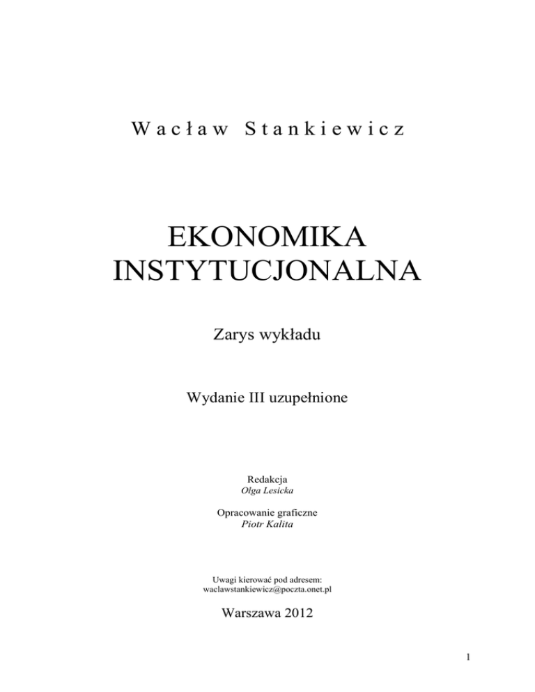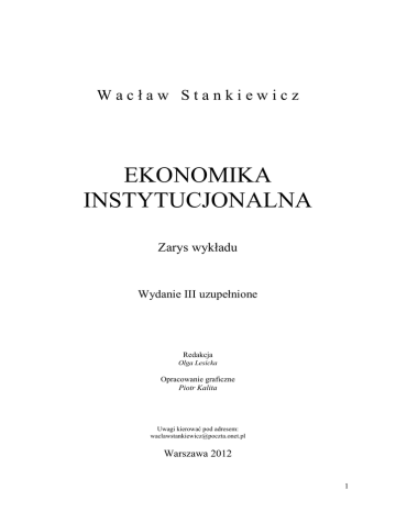 Wacław Stankiewicz EKONOMIKA INSTYTUCJONALNA Zarys wykładu Wydanie III uzupełnione Redakcja Olga Lesicka Opracowanie graficzne Piotr Kalita Uwagi kierować pod adresem: [email protected] Warszawa 2012 1 Spis treści WSTĘP 1. ............................................................................................................................... 5 PRZEDMIOT I KRÓTKIE DZIEJE ............................................................................... 7 1.1. U źródeł ekonomiki instytucjonalnej ............................................................................... 7 1.2. Dorobek „starej” ekonomiki instytucjonalnej ................................................................. 10 1.3. Na uboczu wielkich zwrotów w powszechnej myśli ekonomicznej ............................... 18 1.4. Odrodzenie i próba integracji ………………………………………………………….. 21 2. NOWA EKONOMIKA INSTYTUCJONALNA ........................................................... 25 2.1. Coase – prekursor czy mistrz? ...................................................................................... 28 2.2. North – nie tylko kliometria ........................................................................................... 31 2.3. Williamson – teoria kosztów transakcyjnych ................................................................ 34 2.4. Elinor Ostrom – zarządzanie wspólnotowe ……………………………..…………… 36 2.5. Hodgson – dużo o ekonomice ewolucyjnej ................................................................... 38. 2.6. Perspektywy rozwoju – wiele niewiadomych ………………………………................ 41 3. ZAGADNIENIA METODOLOGICZNE ...................................................................... 45 3.1. Koncepcje i teoria instytucji .......................................................................................... 45 3.2. Instytucja a organizacja ……………………………………………………………..… 54 3.3. Formalizm, indywidualizm i holizm ............................................................................. 56 3.4. Teoria instytucjonalnej matrycy .................................................................................... 60 4. EKONOMICZNA TEORIA PRAW WŁASNOŚCI .................................................... 65 4.1. Instytucja własności ..................................................................................................... 65 4.2. Systemy praw własności .............................................................................................. 67 4.2.1. Wolny dostęp do zasobów i system własności wspólnej ......................................... 68 4.2.2. System własności grupowej i prywatnej ................................................................. 71 4.2.3. Własność państwowa .............................................................................................. 76 4.2.4. Uwagi o prawie własności intelektualnej ............................................................... 78 4.3. Teoremat Coase`a ........................................................................................................ 79 5. RYNEK – UJĘCIE INSTYTUCJONALNE ………………………………………… 82 5.1. Narodziny i rozwój rynku ........................................................................................... 82 5.2. Rynek i plan ................................................................................................................. 87 5.3. W gąszczu struktur instytucjonalnych ......................................................................... 90 5.3.1. Wyzwania okresu ekspansji wymiany rynkowej ……………………………………. 91 5.3.2. Sieci w architekturze współczesnego rynku ……………………………………….. 95 6. INSTYTUCJONALNA TEORIA KONTRAKTÓW ................................................. 99 6.1. O instytucji kontraktów .............................................................................................. 99 6.2. Główne rodzaje i klasyfikacja kontraktów ................................................................. 105 6.3. Kontrakt kompletny – uwagi uzupełniające ………………………………………… 113 2 7. PROBLEMY KONTRAKTÓW NIEKOMPLETNYCH ………………..…………… 117 7.1.Teoria i praktyka kontraktów niekompletnych ……………………………………… 117 7.2.Ciągłe poszukiwanie – presja praktyki ……………………………………………… 123 7.3.Kontrakty relacyjne …………………………………………………………………. 128 8. TEORIA KOSZTÓW TRANSAKCYJNYCH ............................................................. 135 8.1. Pojęcie i typy transakcji .............................................................................................. 135 8.2. Koncepcja kosztów transakcyjnych ............................................................................ 141 8.2.1.Podstawy ogólnej teorii kosztów transakcyjnych ………………………..…….……142 8.2.2.Powiązania i klasyfikacja …………………………………………………............. 148 8.3. Zapotrzebowanie na rachunek kosztów transakcyjnych …………………………… 154 9. PRZEDSIĘBIORSTWO JAKO INSTYTUCJA I ORGANIZACJA ............................ 160 9.1.Narodziny i rozwój instytucjonalnej teorii przedsiębiorstwa ...................................... 160 9.2. Koncepcja układu: pryncypał-agent .......................................................................... 165 9.3.Wielkie korporacje ...................................................................................................... 172 10. EKONOMIKA INSTYTUCJONALNA O ROLI PAŃSTWA ................................ 179 10.1. Powstanie i ewolucja państwa jako instytucji