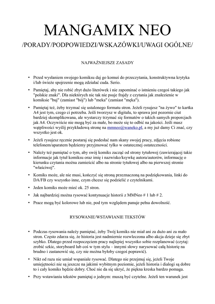 MANGAMIX NEO /PORADY/PODPOWIEDZI/WSKAZÓWKI/UWAGI OGÓLNE/ NAJWAŻNIEJSZE ZASADY • Przed wysłaniem swojego komiksu daj go komuś do przeczytania, konstruktywna krytyka i/lub świeże spojrzenie mogą zdziałać cuda. Serio. • Pamiętaj, aby nie robić zbyt dużo literówek i nie zapominać o istnieniu czegoś takiego jak "polskie znaki". Dla niektórych nic tak nie psuje frajdy z czytania jak znalezienie w komiksie "buj" (zamiast "bój") lub "meka" (zamiast "męka"). • Pamiętaj też, żeby trzymać się ustalonego formatu stron. Jeżeli rysujesz "na żywo" to kartka A4 jest tym, czego ci potrzeba. Jeśli tworzysz w digitalu, to sprawa jest pozornie ciut bardziej skomplikowana, ale wystarczy trzymać się formatów o takich samych proporcjach jak A4. Oczywiście nie mogą być za małe, bo może się to odbić na jakości. Jeśli masz wątpliwości wyślij przykładową stronę na [email protected], a my już damy Ci znać, czy wszystko jest ok. • Jeżeli rysujesz ręcznie postaraj się podesłać nam skany swojej pracy, zdjęcia robione telefonem/aparatem będziemy przyjmować tylko w ostatecznej ostateczności. • Należy też pamiętać o tym, aby swój komiks zacząć od strony tytułowej (zawierającej takie informacje jak tytuł komiksu oraz imię i nazwisko/ksywkę autora/autorów, informację o kierunku czytania można zamieścić albo na stronie tytułowej albo na pierwszej stronie "właściwej". • Komiks może, ale nie musi, kończyć się stroną przeznaczoną na podziękowania, linki do DA/FB czy wszystko inne, czym chcesz się podzielić z czytelnikami. • Jeden komiks może mieć ok. 25 stron. • Jak najbardziej można rysować kontynuacje historii z MMNeo # 1 lub # 2. • Prace mogą być kolorowe lub nie, pod tym względem panuje pełna dowolność. RYSOWANIE/WSTAWIANIE TEKSTÓW • Podczas rysowania należy pamiętać, żeby Twój komiks nie miał ani za dużo ani za mało stron. Często zdarza się, że historia jest nadmiernie rozwleczona albo akcja dzieje się zbyt szybko. Dlatego przed rozpoczęciem pracy najlepiej wszystko sobie rozplanować (czytaj: zrobić szkic, storyboard lub coś w tym stylu – innymi słowy narysować całą historię na brudno i zastanowić się, czy nie można byłoby czegoś poprawić). • Nikt od razu nie umiał wspaniale rysować. Dlatego nie przejmuj się, jeżeli Twoje umiejętności nie są jeszcze na jakimś wybitnym poziomie, jeżeli historia i dialogi są dobre to i cały komiks będzie dobry. Choć nie da się ukryć, że piękna kreska bardzo pomaga. • Przy wstawianiu tekstów pamiętaj o jednym: muszą być czytelne. Jeżeli ten warunek jest spełniony, to nie ma znaczenia, czy piszesz je ręcznie lub wstawiasz komputerowo... Choć te komputerowe są zazwyczaj czytelniejsze i łatwiejsze w ewentualnej przeróbce. Ale której metody nie zastosujesz nie ma wytłumaczenia dla brakujących polskich znaków i nagminnych literówek. • Postaraj się, aby twoja historia nie wymagała trzykrotnego przeczytania zanim czytelnik zrozumie "co tu się właściwie dzieje". Niech bohaterowie się od siebie w jakiś sposób różnią. Nie wciskaj 135 tysięcy dymków na jedną stronę (no chyba, że ma to jakieś uzasadnienie fabularne). • Co prawda przerysowywanie kadrów i postaci z mang jest zakazane, ale jak najbardziej można wzorować swój styl na tytułach, które się przeczytało. Praktycznie każdy tak zaczynał, choć z czasem naprawdę warto wykształcić swój własny styl. • Co do wstawiania tekstów do dymków: warto pamiętać, aby teksty były wyśrodkowane (a nie latały po całym dymku bez ładu i składu), można też zastosować kilka różnych rodzajów czcionek (np. jedną do dialogów, jedną do narracji, kolejną do krzyku i tak dalej) FABUŁA • Pamiętaj, że nic cię nie ogranicza, jeśli chodzi o historię nad którą będziesz pracować. No może poza tym, że nie możesz w niej używać postaci z mang. Dlatego też musicie powiedzieć "pa pa" doujinom z Naruto czy z Kuroshitsuji. • Postaraj się, aby dialogi brzmiały jak najnaturalniej. Jeżeli masz wątpliwości poproś kogoś, aby przeczytał to co stworzyłeś i posłuchaj jego ewentualnych uwag. • Staraj się nie przesadzać z przekleństwami. Nie da się ukryć, że czasami są potrzebne, ale bez przesady, emocje można okazywać również na inne sposoby. • Jeżeli dasz komuś do przeczytania swój komiks i usłyszysz "ale o co w tym chodzi", to najpewniej znak, że musisz jeszcze trochę popracować nad przejrzystością swojej historii. Może kilka słów wprowadzenia, dodanie narracji, przerobienie dialogów lub przedstawienie postaci załatwi sprawę? KILKA SŁÓW NA KONIEC • Jeżeli masz jakieś pytania to pisz na [email protected], ewentualnie zajrzyj na fanpage https://www.facebook.com/mangamixneo lub pisz komentarze na stronie www.waneko.pl • Jeśli nie rysujesz komputerowo i korzystasz z np. Promarkerów to zapraszamy na stronę naszego sklepu internetowego: http://sklepwaneko.pl/401-Przybory-do-rysowania
