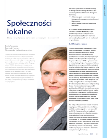 w Strategii Zrównoważonego Rozwoju i Odpowiedzialnego Biznesu GK dwa cele strategiczne, którymi są: Społeczności lokalne Dialog i współpraca z partnerami społecznymi i biznesowymi • efektywna, oparta o partnerskie zasady i dialog współpraca z partnerami społecznymi i biznesowymi; • spójna, rzetelna i efektywna komunikacja i marketing. W ich ramach przewidzieliśmy do realizacji 14 celów i 40 działań. Kontynuacja części przedsięwzięć nastąpi w kolejnych latach. W tym rozdziale znajdą Państwo informacje o tym, co dotychczas udało nam się zrealizować w tym obszarze. Emilia Tomalska Rzecznik Prasowy Mazowiecka Spółka Gazownictwa 8.1 Wyzwania i szanse Tradycja zaangażowania społecznego GK PGNiG sięga czasów Ignacego Łukasiewicza, pioniera górnictwa naftowego w Polsce i na świecie. Czujemy się zobowiązani do wspierania projektów Łukasiewicz nie tylko odnosił sukcesy jako służących rozwiązywaniu ważnych problemów przedsiębiorca i innowator, ale też pomagał innym społecznych w Polsce. Jednym z działań w tym za- zakładać firmy. Był organizatorem pierwszego kresie jest porozumienie Spółki z Fundacją Czynnej kongresu naftowego w 1877, w tym samym roku Filantropii Satori przy realizacji projektu „Magazyn w Gorlicach założył Krajowe Towarzystwo Naftowe. uliczny WSPAK". Sprzedawcami magazynu są Jego działania stanowiły cenne źródło inspiracji dla osoby wykluczone - trwale bezrobotni, bezdomni innych przedsiębiorców. Możemy powiedzieć, że był oraz niepełnosprawni. Inicjatywa pomaga ludziom prekursorem odpowiedzialności społecznej, zakładał znajdującym się w trudnej sytuacji życiowej i budował szkoły, zatrudniał nauczycieli, popierał odzyskać poczucie własnej wartości i w godny szkolnictwo nie tylko podstawowe i branżowe, ale sposób zarabiać pieniądze. Kolporterzy magazynu też np. z jego inicjatywy powstała szkoła koronkar- „WSPAK” regularnie pojawiają się w siedzibie na- ska dla dziewcząt. Wspierał chłopskich synów podej- szej firmy, a nasi pracownicy z chęcią uczestniczą mujących studia. Leczył za darmo chłopów ze swej w tym projekcie. okolicy. Szczególnie dbał o swoich pracowników. W Bóbrce zorganizował pierwszą w Galicji tzw. kasę bracką. Przynależność do niej i wpłacanie 3% podatku od zarobków były obowiązkiem, w zamian robotnicy otrzymywali bezpłatne leczenie, wypłatę chorobowego, a w przypadku inwalidztwa prawo do dożywotniej renty, zapomogi itp. świadczenia znacznie wyprzedzające tamte czasy. Był także filantropem i za tę działalność papież Pius IX nadał mu tytuł szambelana papieskiego. Ten wstęp pokazuje nie tylko historię wydobycia ropy i gazu w Polsce, do której się odwołujemy, ale także wartości ciągle żywe w codzienności spółek GK. Przede wszystkim są to odpowiedzialność oraz partnerstwo. Na takich zasadach chcemy budować nasze relacje biznesowe i społeczne, doskonalić dialog, który prowadzimy z otoczeniem, by coraz lepiej rozumieć potrzeby i oczekiwania naszych interesariuszy: społeczności lokalnych, administracji, regulatora i poddostawców. Chcemy czerpać z naszej tradycji, a równocześnie wykorzystywać skuteczne i różnorodne narzędzia i kanały komunikacji. Raport Społeczny 2009 63 Społeczności lokalne Obszarowi Społeczności lokalne odpowiadają 8.2 Inwestycje w infrastrukturę, wypłaty odszkodowań Mamy świadomość, że nasz podstawowy produkt Budowanie zaufania w oparciu o współpracę – gaz – ma wyjątkowe znaczenie dla naszych z mediami to tylko jeden z elementów oddziały- klientów – odbiorców indywidualnych i przemy- wania społecznego GK. Dzięki wieloletnim, bliskim słowych, zapewniając nie tylko wygodę życia relacjom z otoczeniem lokalnym wiemy, że tylko Prace poszukiwawcze, wiertnicze, wydobywcze, codziennego, ale też pomyślne funkcjonowanie dzięki tej współpracy możemy się doskonalić. gazyfikacja – wszystkie oznaczają ingerencję wielu gałęzi przemysłu. Naszą misją jest zapew- Nie odrzucamy klasycznej filantropii, ale też w środowisko naturalne. Z drugiej strony, nasza nienie bezpiecznych i niezawodnych dostaw chcemy wykorzystywać inne możliwości współ- działalność przynosi też wiele pozytywnych energii, a działalność spółki ma znaczenie dla pracy, by działać bardziej skutecznie, odpowia- efektów w środowiskach lokalnych: dajemy pracę, bezpieczeństwa energetycznego kraju. Dlatego dając na realne potrzeby społeczności. Widzimy inwestujemy w infrastrukturę, a gazyfikacja gmin też szczególnie zależy nam na szerokiej informacji jednak, jak trudno jest sprostać oczekiwaniom przyspiesza ich rozwój. na temat naszych projektów inwestycyjnych, wszystkich społeczności lokalnych, wypracować dywersyfikacji dostaw, zakupów złóż. Zwłaszcza rozwiązania satysfakcjonujące tak szerokie i róż- Standardem w naszej pracy są działania poprze- podczas sytuacji kryzysowych, kiedy pojawiają się norodne grono naszych interesariuszy. Na temat dzające rozpoczęcie inwestycji dla mieszkańców wątpliwości, niepokój i pytania nt stanu dostaw narzędzi wykorzystywanych w tym procesie danego terenu. Są to spotkania, podczas których gazu czy jego jakości. Chcemy budować oparte na piszemy też w rozdziale 4.1. informujemy, w jakim celu prowadzona będzie zrozumieniu i zaufaniu relacje z mediami, dzięki dana inwestycja, w jaki sposób będzie realizowana którym docieramy do szerokiego grona naszych Podejmując działania z zakresu odpowiedzialnego (terminy prac staramy się zawsze dostosować do interesariuszy. O skali naszego zaangażowania biznesu i zrównoważonego rozwoju GK PGNiG, potrzeb i oczekiwań właścicieli gruntów), a także i determinacji w dotarciu z rzetelną informacją chcemy jeszcze szerzej i bardziej skutecznie infor- jakie korzyści przyniesie danej gminie i jej miesz- świadczyć mogą choćby statystyki ze stycznia m