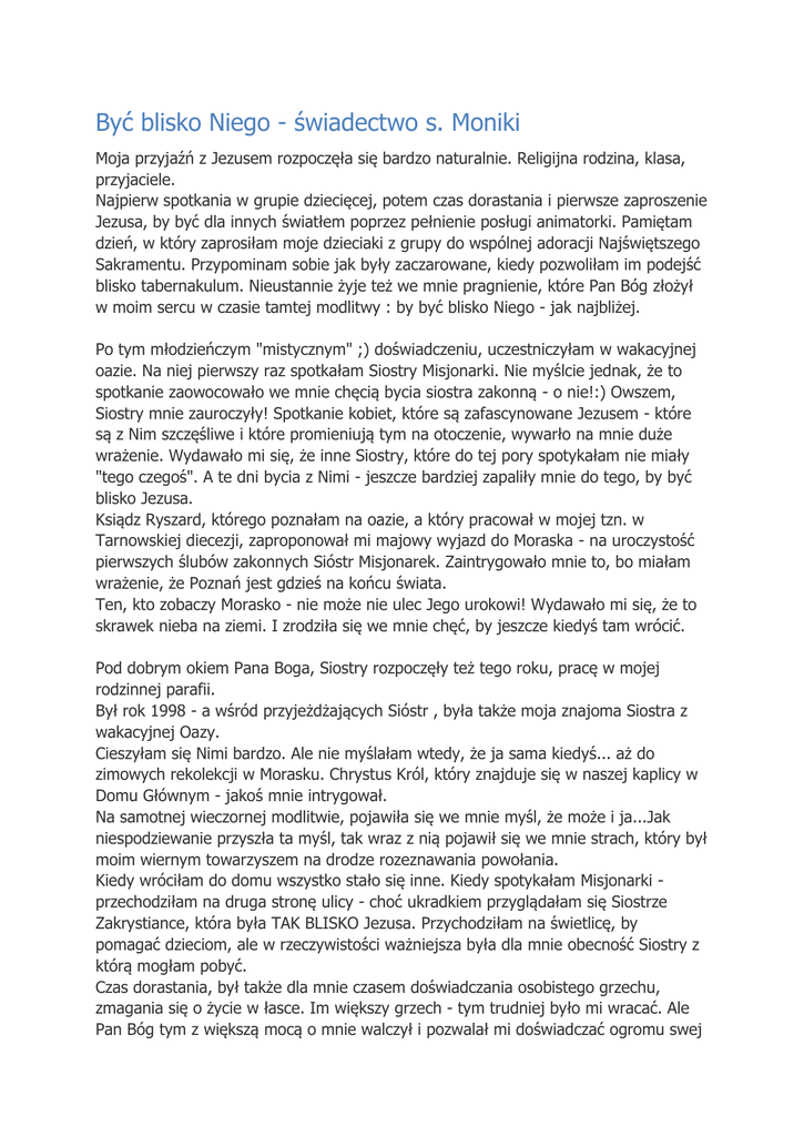 Być blisko Niego - świadectwo s. Moniki Moja przyjaźń z Jezusem rozpoczęła się bardzo naturalnie. Religijna rodzina, klasa, przyjaciele. Najpierw spotkania w grupie dziecięcej, potem czas dorastania i pierwsze zaproszenie Jezusa, by być dla innych światłem poprzez pełnienie posługi animatorki. Pamiętam dzień, w który zaprosiłam moje dzieciaki z grupy do wspólnej adoracji Najświętszego Sakramentu. Przypominam sobie jak były zaczarowane, kiedy pozwoliłam im podejść blisko tabernakulum. Nieustannie żyje też we mnie pragnienie, które Pan Bóg złożył w moim sercu w czasie tamtej modlitwy : by być blisko Niego - jak najbliżej. Po tym młodzieńczym "mistycznym" ;) doświadczeniu, uczestniczyłam w wakacyjnej oazie. Na niej pierwszy raz spotkałam Siostry Misjonarki. Nie myślcie jednak, że to spotkanie zaowocowało we mnie chęcią bycia siostra zakonną - o nie!:) Owszem, Siostry mnie zauroczyły! Spotkanie kobiet, które są zafascynowane Jezusem - które są z Nim szczęśliwe i które promieniują tym na otoczenie, wywarło na mnie duże wrażenie. Wydawało mi się, że inne Siostry, które do tej pory spotykałam nie miały "tego czegoś". A te dni bycia z Nimi - jeszcze bardziej zapaliły mnie do tego, by być blisko Jezusa. Ksiądz Ryszard, którego poznałam na oazie, a który pracował w mojej tzn. w Tarnowskiej diecezji, zaproponował mi majowy wyjazd do Moraska - na uroczystość pierwszych ślubów zakonnych Sióstr Misjonarek. Zaintrygowało mnie to, bo miałam wrażenie, że Poznań jest gdzieś na końcu świata. Ten, kto zobaczy Morasko - nie może nie ulec Jego urokowi! Wydawało mi się, że to skrawek nieba na ziemi. I zrodziła się we mnie chęć, by jeszcze kiedyś tam wrócić. Pod dobrym okiem Pana Boga, Siostry rozpoczęły też tego roku, pracę w mojej rodzinnej parafii. Był rok 1998 - a wśród przyjeżdżających Sióstr , była także moja znajoma Siostra z wakacyjnej Oazy. Cieszyłam się Nimi bardzo. Ale nie myślałam wtedy, że ja sama kiedyś... aż do zimowych rekolekcji w Morasku. Chrystus Król, który znajduje się w naszej kaplicy w Domu Głównym - jakoś mnie intrygował. Na samotnej wieczornej modlitwie, pojawiła się we mnie myśl, że może i ja...Jak niespodziewanie przyszła ta myśl, tak wraz z nią pojawił się we mnie strach, który był moim wiernym towarzyszem na drodze rozeznawania powołania. Kiedy wróciłam do domu wszystko stało się inne. Kiedy spotykałam Misjonarki przechodziłam na druga stronę ulicy - choć ukradkiem przyglądałam się Siostrze Zakrystiance, która była TAK BLISKO Jezusa. Przychodziłam na świetlicę, by pomagać dzieciom, ale w rzeczywistości ważniejsza była dla mnie obecność Siostry z którą mogłam pobyć. Czas dorastania, był także dla mnie czasem doświadczania osobistego grzechu, zmagania się o życie w łasce. Im większy grzech - tym trudniej było mi wracać. Ale Pan Bóg tym z większą mocą o mnie walczył i pozwalał mi doświadczać ogromu swej bezwarunkowej Miłości. Chciałam żyć tak zwyczajnie - jak wszyscy inni. Zawierałam znajomości, zakochiwałam się, przeżywałam chwile szczęścia i rozczarowań. Nie brakowało kłopotów w domu, szkole - po prostu - zwyczajne życie nastolatki. W sercu jednak ciągle miałam to pragnienie, by BYĆ BLISKO Niego i by inni też tę bliskość mogli przeżyć; chciałam pomóc ludziom otwierać się na doświadczenie Jego Miłości. Sama już nie wiedziałam, czym jest we mnie to pragnienie... Raz chciałam być misjonarką, innym razem zjadał mnie strach, obawy. Nie wyobrażałam sobie, jak ja miałabym opuścić kiedyś Ojczyznę, posługiwać się obcym językiem. Nigdy przecież nie czułam się poliglotką... Wydawało mi się, że mam ku temu za mało naturalnych predyspozycji. I wtedy rozglądałam się za innymi wspólnotami, w których mogłabym BYĆ BLISKO JEZUSA i głosić Pana Boga poprzez teatr, pantomimę - w tym czułam się tak dobrze. Nadeszła klasa maturalna, zwiększyła się intensywność mojej modlitwy. Potrzebowałam częściej być na Eucharystii, słuchać JEGO SŁOWA, trwać w ciszy. Początkiem kwietnia, tuż przed sama maturą potrzebny był opiekun do dzieci - na czas trwającego kursu ewangelizacyjnego. Pojechałam do Ciężkowic wbrew wszystkim, którzy uznali to za wariactwo. Bo przecież egzaminy właściwie już za kilkanaście dni. Właśnie tam w Ciężkowicach, w bliskości Jezusa Eucharystycznego wypowiedziałam Panu Bogu swoje pierwsze fiat na Jego plan. Oddawał Mu swoje obawy, powierzając się Jego rękom, Jego Miłości, która wiernie dźwigała mnie z upadków i której dawał mi doświadczać. Miałam głębokie przekonanie, że jeśli mam iść drogą życia konsekrowanego, to tylko w zgromadzeniu Sióstr Misjonarek Chrystusa Króla - mojej pierwszej Miłości. Jezus dał mi odwagę by podjąć ryzyko, jeszcze głębszego rozeznawania Jego woli. Czasem trzeba po prostu zaryzykować i pójść za głosem, który delikatnie rozbrzmiewa w sercu... Czytania Jego pragnień uczę się każdego dnia. Moje kroczenie za Nim bogate jest w chwile kiedy wypowiadam za uczniami "Panie jak dobrze, że tu jesteśmy", kiedy moja głowa spoczywa na Jego piersi ale nie brakuje też chwil w których krzyczę: "Panie, czy Cię to nie obchodzi, że giniemy !? " - Jezus zawsze ucisza burze mojego życia. To On mnie prowadzi a ja uczę się Mu coraz mocniej ufać. Im bardziej Mu zawierzam, tym piękniejsze i szczęśliwsze staje się moje życie. On jest moją Drogą, Prawdą i Życiem. A Jego Miłość nie odstąpi ode mnie. S. Monika misjonarka Chrystusa Króla