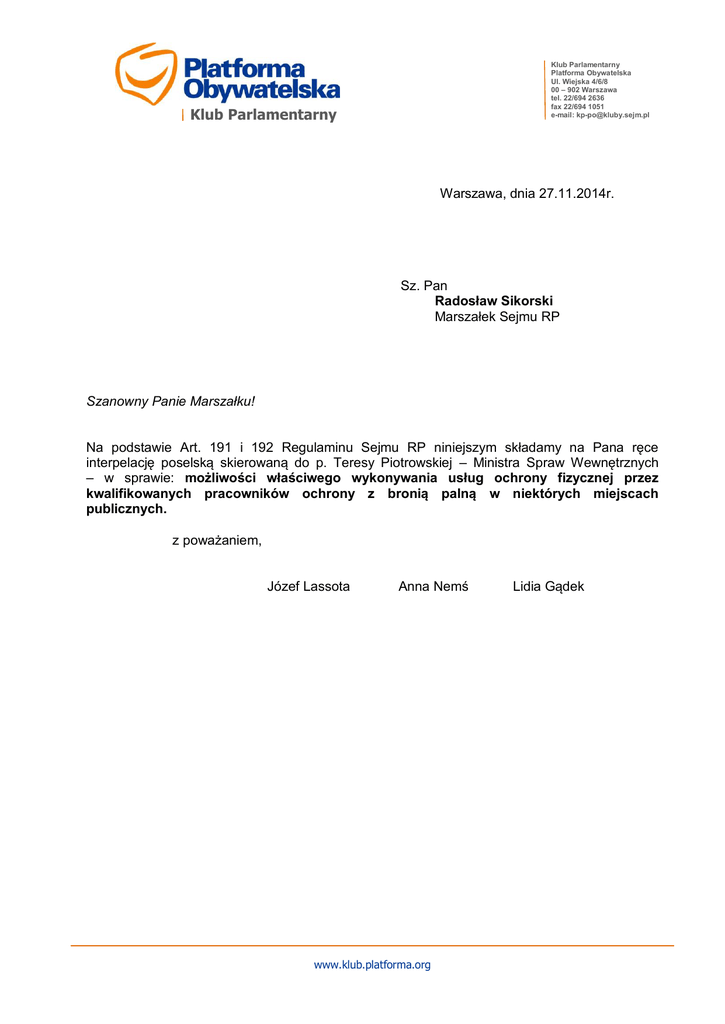 Klub Parlamentarny Platforma Obywatelska Ul. Wiejska 4/6/8 00 – 902 Warszawa tel. 22/694 2636 fax 22/694 1051 e-mail: [email protected] Klub Parlamentarny Warszawa, dnia 27.11.2014r. Sz. Pan Radosław Sikorski Marszałek Sejmu RP Szanowny Panie Marszałku! Na podstawie Art. 191 i 192 Regulaminu Sejmu RP niniejszym składamy na Pana ręce interpelację poselską skierowaną do p. Teresy Piotrowskiej – Ministra Spraw Wewnętrznych – w sprawie: możliwości właściwego wykonywania usług ochrony fizycznej przez kwalifikowanych pracowników ochrony z bronią palną w niektórych miejscach publicznych. z poważaniem, Józef Lassota Anna Nemś www.klub.platforma.org Lidia Gądek Klub Parlamentarny Platforma Obywatelska Ul. Wiejska 4/6/8 00 – 902 Warszawa tel. 22/694 2636 fax 22/694 1051 e-mail: [email protected] Klub Parlamentarny Warszawa, dnia 27.11.2014r Józef Lassota Anna Nemś Lidia Gądek Klub Parlamentarny Platforma Obywatelska Sz. Pani Teresa Piotrowska Minister Spraw Wewnętrznych INTERPELACJA w sprawie: możliwości właściwego wykonywania usług ochrony fizycznej przez kwalifikowanych pracowników ochrony z bronią palną w niektórych miejscach publicznych. Szanowna Pani Minister Stosowana obecnie praktyka w muzeach, a także w niektórych miejscach publicznych jak sądy czy banki, w których Kwalifikowany Pracownik Ochrony z bronią palną może się znaleźć z osobą czy osobami chronionymi, lub mieniem powierzonym jego ochronie, powoduje, że nie jest on wpuszczany na teren tej instytucji. Pracownikowi ochrony fizycznej, działającemu na podstawie zlecenia ochrony osób, przez to, że nie jest wpuszczany na teren muzeum, uniemożliwia się mu wykonanie zadania, a firmie należyte wykonanie umowy zlecenia. W takich sytuacjach osoby objęte ochroną na podstawie umowy cywilnoprawnej najczęściej rezygnują ze zwiedzania muzeum. Bardzo często, choć nie tylko, chodzi tu o całe wycieczki zagraniczne, najczęściej obywateli państwa Izrael. Rodzi to określone negatywne skutki emocjonalne, niewykonanie planu wycieczek, roszczenia wobec firm ochrony. Dotyczy to najczęściej osób z Izraela, w tym wycieczek do Polski młodzieży z Izraela. Oficjalnym dokumentem regulującym działania strony polskiej i strony izraelskiej w zakresie przyjazdów edukacyjnych młodzieży izraelskiej do Polski jest Wspólna Deklaracja Ministerstwa Spraw Zagranicznych Rzeczypospolitej Polskiej i Ministerstwa Spraw Zagranicznych Państwa Izrael w sprawie przyjazdów edukacyjnych izraelskiej młodzieży do Polski, podpisana dnia 11 września 2006 r. Choć dokument ogólnie stwierdza, że strona polska ponosi koszty związane z zapewnieniem bezpieczeństwa grupom młodzieży izraelskiej przebywającym w Polsce w ramach programów edukacyjnych oraz, że za kwestie te odpowiedzialne jest Ministerstwo Spraw Wewnętrznych, to przyjazdy te z reguły wiążą się z zawieraniem dodatkowych umów cywilnych na ochronę komercyjną. Pracownicy ochrony muzeów, zakazując wstępu na teren muzeów pracownikom ochrony z bronią powodują prawie bez wyjątku konsternację, uniemożliwianie realizacji programów wyjazdów do Polski (miejsca zagłady), niezadowolenie i opinie o istnieniu bałaganu, niespójności i niekonsekwencji działań różnych podmiotów w Polsce. Powstają negatywne opinie. Przepisy ustawy z dnia 24 maja 2013 r. o środkach przymusu bezpośredniego i broni palnej (Dz. U. z 2013 r. poz. 628), w Art. 2 ust. 1 pkt. 20, stwierdzają, że uprawnionymi do używania lub wykorzystywania środków przymusu bezpośredniego i broni palnej są - pracownicy ochrony, uprawnieni do użycia lub wykorzystania środków przymusu bezpośredniego lub broni palnej na podstawie przepisów ustawy z dnia 22 sierpnia 1997 r. o ochronie osób i mienia (Dz. U. z 2005 r. Nr 145, poz. 1221, z późn. zm.). Uprawnionymi pracownikami ochrony wykonującymi bezpośrednio czynności związane z ochroną osób, zgodnie ze wskazaną wyżej ustawą o ochronie..., są pracownicy ochrony wpisani na listę kwalifikowanych pracowników www.klub.platforma.org Klub Parlamentarny Klub Parlamentarny Platforma Obywatelska Ul. Wiejska 4/6/8 00 – 902 Warszawa tel. 22/694 2636 fax 22/694 1051 e-mail: [email protected] ochrony (Art. 26 ust. 1 pkt 3). Ich uprawnienia w zakresie użycia i wykorzystania broni palnej określa Art. 36 ust. 1 pkt 5 tej ustawy. Niektóre szczegółowe zasady wykonywania ochrony osób z bronią reguluje ustawa z dnia 22 sierpnia 1997 r. o ochronie osób i mienia. Dotyczy to zasad noszenia broni palnej, a mianowicie, Art. 40, ustala zasadę noszenia broni palnej tylko wtedy, gdy pracownik ochrony występuje w umundurowaniu lub ubiorze używanym przez specjalistyczną uzbrojoną formację ochronną (sufo), dopuszczając wyjątek wtedy gdy pracownik ochrony wykonuje zadania ochrony osób w miejscu publicznym. W przepisie Art. 41 ustala sie dodatkowo zakaz noszenia broni palnej, a mianowicie pracownik ochrony nie może nosić przy sobie broni palnej, jeżeli wykonuje bezpośrednio zadania w zakresie utrzymania bezpieczeństwa i porządku publicznego podczas trwania masowych imprez publicznych (do których odnosi się osobna ustawa). Przy czym słowo „bezpośrednio” ma tu określone znaczenie, bardzo istotne w tym przypadku. Art. 41 również w tym wypadku nie odnosi się do pracowników SUFO którzy nie wykonują bezpośrednio zadań w zakresie utrzymania bezpieczeństwa i porządku publicznego podczas trwania imprez masowych…. Przykładem może być wezwana grupa interwencyjna aby np. odtransportować osoby ujęte, nie bierze ona udziału w zabezpieczeniu imprezy masowej i co do zasady jest wyposażona w broń palną bojową, tak samo jak ochrona osób która zabezpiecza osobę lub kilka osób w trakcie takiego wydarzenia i niema ona nic wspólnego z bezpośrednim zabezpieczeniem imprezy. Zgodnie z systemowymi rozwiązaniami ustawy z dnia 24 maja 2013 r. o środkach przymusu bezpośredniego i broni pa