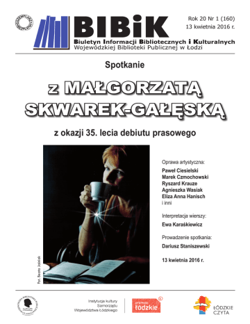 Rok 20 Nr 1 (160) 13 kwietnia 2016 r. Spotkanie Małgorzatą skwarek-gałęską z z okazji 35. lecia debiutu prasowego Oprawa artystyczna: Paweł Ciesielski Marek Czmochowski Ryszard Krauze Agnieszka Wasiak Eliza Anna Hanisch i inni Interpretacja wierszy: Ewa Karaśkiewicz Prowadzenie spotkania: Fot. Beata Jaśniak Dariusz Staniszewski 13 kwietnia 2016 r. BIBiK 1 (160) / 2016 BIOGRAM MAŁGORZATA SKWAREK-GAŁĘSKA Jest łodzianką od paru pokoleń. Z wykształcenia bibliotekarka. Pracuje jako kierownik filii bibliotecznej. Prowadzi dwa Dyskusyjne Kluby Książki. Organizuje spotkania poetyckie w ramach wymyślonych przez siebie projektów: Katamaran Literacki i Stolik Poetycki. Współpracuje ze Stowarzyszeniem „Obszary Kultury”, Fundacją „Surei No Mon”, Klubem Yakumo-goto oraz ze szkołami, przedszkolami, bibliotekami, domami kultury i grupami literackimi. Od 2015 roku pełni funkcję prezesa Oddziału Łódzkiego ZLP. Odznaczona odznaką honorową „Zasłużony dla Kultury Polskiej”. Otrzymała również Certyfikat Lider SpołecznoOświatowy przyznawany przez Łódzkie Centrum Doskonalenia Nauczycieli i Kształcenia Praktycznego. Fot. Beata Jaśniak BIBLIOGRAFIA W wyborze i opracowaniu Małgorzaty Skwarek-Gałęskiej Bibliografia obejmuje lata 1980-2016, ale jest niepełna, ponieważ większość wycinków prasowych będących w posiadaniu poetki, nie została opisana wcale, lub została opisana nieprawidłowo. Bibliografia została podzielona na trzy części: I. Wydawnictwa samodzielne II. Wydawnictwa zbiorowe III. Czasopisma W obrębie poszczególnych części zachowano układ chronologiczny. I. Wydawnictwa samodzielne: 1. Ośrodek Sztuki Młodych Łódzkiego Domu Kultury zaprasza na wieczór autorski / Małgorzata Skwarek. - Łódź: Ośrodek Sztuki Młodych, 1981. - [6] s. ; 18 cm. - Z cyklu: spotkania z młodą poezją. - Składanka zawiera: zdjęcia, życiorys, 8 wierszy. 2. Świat smakuje lepiej w całości / Małgorzata T. Skwarek. - Bydgoszcz: „Arkona”, 1992. - 32 s. ; 21 cm Utwory z tego zbiorku były prezentowane na antenie TVP w programie I, w październiku 1992 roku. 3. Biała róża - to senne marzenie / Małgorzata T. Skwarek; rys. Sebastian Grzybowski; okładka Artur Gromek. - Łódź: Klub Garnizonowy, 1992. - 128 s. ; 10 x 7 cm Książeczka podzielona jest na pięć części. 4. Dom na gruzach bajki / Małgorzata Tatiana Skwarek. - Łódź: Oficyna Bibliofilów, 1995. - 36, [4] s. ; 21 cm. - ISBN 83-86058-51-X 2 bibik.wbp.lodz.pl BIBiK 1 (160) / 2016 BIOGRAM Tomik prezentowany na antenie Radia Łódź w 1996 roku w audycji Poezja nocą. 5. Zza zakrętu / Małgorzata T. Skwarek-Gałęska. - Łódź: Oficyna Bibliofilów, 2006. - 39, [1] s.; 21 cm. - ISBN 8387522-80-5 Wiersze były prezentowane w Radio Łódź a także na spotkaniach W Klubie Nauczyciela i w Rondzie. 6. Mosty bez poręczy / Małgorzata T. Skwarek-Gałęska. Łódź: Oficyna Bibliofilów, 2007. - 37, [3] s.; 21 cm. - ISBN 83-87522-87-2 Wiersze były prezentowane w Domu Kultury (Siedlecka 1) dnia 3.03.2008 r., w Filii nr 9 MBP Łódź-Polesie w maju i w Śródmiejskim Forum Kultury dnia 3.06.2008 a także nagrane prze telewizję kablową RET-SAT. 7. ...i... / Małgorzata Skwarek-Gałęska; red. Dorota Grzegorczyk. - Łódź: Bałucki Ośrodek Kultury RONDO, 2008. - 26, [2] s., 21 cm Zeszyt wydany z okazji wieczoru poezji w Rondzie dnia 18 października 2008 r. 8. Rozsypanka / Małgorzata Skwarek-Gałęska. - Łódź: Rondo, 2009 9. Opowieści o mieszkańcu biblioteki czyli Bibliocik-Kłopocik / Małgorzata Skwarek-Gałęska; rys. Dominika Gałęska; red. Dorota Grzegorczyk. - Łódź: „Rondo”, 2010 10. ...i... / Małgorzata T. Skwarek-Gałęska; [okł. i grafiki: Halina Nawrocka; foto na okł. Beata Jaśniak]. - Łódź: „Astra”, 2011. - ISBN 978-83-63158-03-3 11. Być / Małgorzata Skwarek-Gałęska; Fot na okł. Beata Jaśniak; red. Dorota Grzegorczyk. - Łódź, 2011. - ISBN 978-83-61579-15-1 12. BALET nice / Małgorzata T. Skwarek-Gałęska; rys. Dominika Anna Gałęska. - Łódź: „Exall”, 2013. - ISBN 97883- 61997-39-9 13. Etiuda / Małgorzata T. Skwarek-Gałęska; rys. Dominika Anna Gałęska. - Łódź: „Exall”, 2013. - ISBN 978-83-6199740-5 14. Szable i róże / Małgorzata Skwarek-Gałęska; red. Dorota Grzegorczyk. - Łódź, 2013. - ISBN 978-83-61579 15. Wiersze codzienne / Małgorzata Skwarek-Gałęska; fot na okł. Beata Jaśniak; red. Dorota Grzegorczyk. - Łódź: „Rondo”, 2014. - ISBN 978-83-61579-40 16. Wachlarz / Małgorzata T. Skwarek-Gałęska; rys. Dominika Anna Gałęska. - Łódź: „Exall”, 2015. - ISBN 97883-61997-54-2 17. Szkice na jednym skrzydle / Małgorzata SkwarekGałęska; projekt okł. Dominika Anna Gałęska; red. Dorota Grzegorczyk. - Łódź: „Rondo”, 2016 II. Wydawnictwa zbiorowe: 1. Czas pracy / Małgorzata Skwarek // In : I tylko czasem bibik.wbp.lodz.pl 3 BIOGRAM BIBiK 1 (160) / 2016 piszę wiersz ... / Red. Edward Kolbus. - Łódź: Wydaw. Łódzkie, 1983. - S. 25. - Opis wg okładki. ISBN 83-2180421-7 Wiersz zdobył I nagrodę oraz nagrodę publiczności w turnieju o Laur Czernika w 1980 r. Brakuje jednego wersu, który pojawia się w innych publikacjach: „dla innego czasu”. 2. Ślimak / Małgorzata Tatiana Skwarek // In : Poezja, prezentacje 87 /Centrum Kultury Młodych, 1987. - S. 28. - Opis wg okładki 3. Ziarenko piasku; Jakie oczy ma komar; Ufność / Małgorzata T. Skwarek // In : Jak Ikar / Wybór, wstęp i oprac. Wiesław Krzysztoszek. - Bydgoszcz: Zarząd Polityczny Pomorskiego Okręgu Wojskowego, 1988. S. 25-28 4. Wydłużają się ... / Małgorzata Tatiana Skwarek / In : Almanach jednego wiersza grupy Centauro /oprac. Maria i Henryk Zasławscy. - Łódź: „Centauro”, 1991. - S. 31 5. Kaleką mnie uczyniłeś /Małgorzata Tatiana Skwarek // In: Almanach wierszy o miłości / Zebranie wierszy, oprac. i red. Henryk Zasławski; Wybór wierszy Rada Redakcyjna. - Łódź: Klub Literacki „Centauro”, 1992.