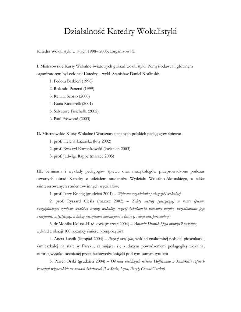 Działalność Katedry Wokalistyki Katedra Wokalistyki w latach 1998– 2005, zorganizowała: I. Mistrzowskie Kursy Wokalne światowych gwiazd wokalistyki. Pomysłodawcą i głównym organizatorem był członek Katedry – wykł. Stanisław Daniel Kotlinski: 1. Fedora Barbieri (1998) 2. Rolando Panerai (1999) 3. Renata Scotto (2000) 4. Katia Ricciarelli (2001) 5. Salvatore Fisichella (2002) 6. Paul Esswood (2003) II. Mistrzowskie Kursy Wokalne i Warsztaty uznanych polskich pedagogów śpiewu: 1. prof. Helena Łazarska (luty 2002) 2. prof. Ryszard Karczykowski (kwiecien 2003) 3. prof. Jadwiga Rappé (marzec 2005) III. Seminaria i wykłady pedagogów śpiewu oraz muzykologów przeprowadzone podczas otwartych obrad Katedry z udziałem studentów Wydziału Wokalno-Aktorskiego, a także zainteresowanych studentów innych wydziałów: 1. prof. Jerzy Knetig (grudzień 2001) – Wybrane zagadnienia pedagogiki wokalnej 2. prof. Ryszard Cieśla (marzec 2002) – Zalety metody synergicznej w nauce śpiewu, uwzględniającej zarówno właściwy trening wokalny, rozwój świadomości wokalnej ucznia, kształtowanie jego wrażliwości artystycznej, a także umiejętność nawiązania właściwej relacji interpersonalnej 3. dr Monika Kolasa-Hladiková (marzec 2004) – Antonin Dvorák i jego twórczość wokalna, wykład z okazji 100 rocznicy śmierci kompozytora 4. Aneta Łastik (listopad 2004) – Poznaj swój głos, wykład znakomitej polskiej piosenkarki, zamieszkałej na stałe w Paryżu, zajmującej się z dużym powodzeniem pedagogiką wokalną, autorką wysoko ocenianej przez fachowców książki pod tym samym tytułem 5. Paweł Orski (grudzień 2004) – Odcienie osobliwych miłości Hoffmanna w kontekście czterech koncepcji reżyserskich na scenach światowych (La Scala, Lyon, Paryż, Covent Garden) 6. Michał Sikora (październik 2005) - Rosyjska liryka wokalna w dokonaniach artystycznych Galiny Wiszniewskiej IV. Występy studentów w Sali Mieszczańskiej Ratusza Staromiejskiego w Gdańsku. Maja one na celu umożliwiane młodym śpiewakom cennych praktyk estradowych – nabieranie doświadczeń artystycznych, kontaktu z publicznością, opanowywanie tremy. Zorganizowano 103 koncerty, które zyskały sobie szerokie grono sympatyków i na stałe wpisały się w kalendarz życia muzycznego Gdańska. Organizacja koncertów zajmuje się z dużym powodzeniem pracownik katedry dr Aleksandra Kucharska-Szefler. V. Osiągnięcia naukowe pracowników Katedry. Członkowie Katedry są często zapraszani do recenzowania i promowania przewodów doktorskich a także recenzowania przewodów habilitacyjnych i oceny dorobku pedagogicznoartystycznego w postępowaniach o nadanie tytułu profesora sztuki muzycznej. W okresie 2000 – 2005 funkcje promotorów i recenzentów sprawowali: prof. Brygida Skiba - 3 promocje przewodów doktorskich - 5 recenzji przewodów kwalifikacyjnych I stopnia - 1 recenzja przewodu kwalifikacyjnego II stopnia - 2 recenzje w postępowaniu o nadanie tytułu naukowego profesora sztuki muzycznej prof. Piotr Kusiewicz - 3 promocje przewodów kwalifikacyjnych I stopnia - 3 promocje przewodów doktorskich - 2 recenzje przewodów kwalifikacyjnych I stopnia - 1 przewód doktorski - 7 recenzji przewodów kwalifikacyjnych II stopnia - 9 recenzji przewodów habilitacyjnych - 4 recenzje w postępowaniu o nadanie tytułu naukowego profesora sztuki muzycznej - 5 ekspertyz habilitacji dokonanych na zlecenie Centralnej Komisji ds. Przewodów i Stopni Naukowych Ponadto prof. Piotr Kusiewicz bierze udział w pracach Państwowej Komisji Akredytacyjnej. prof. Ryszard Minkiewicz - 2 promocja przewodu kwalifikacyjnego I stopnia - 1 recenzja przewodu kwalifikacyjnego I stopnia - 1 recenzja przewodu doktorskiego - 1 recenzja przewodu habilitacyjnego VI. Kursy mistrzowskie, wydawnictwa naukowe: Kierownik Katedry, prof. Piotr Kusiewicz był zaproszony do poprowadzenia warsztatów wokalnych w Szkole Muzycznej II stopnia w Zamościu (grudzień 2001). W lutym 2003 prowadził kurs dla śpiewaków podczas XXI Zimowego Kursu Wokalnego w Dusznikach Zdroju. Na Wydziałach Wokalno-Aktorskich Akademii Muzycznych w Poznaniu (luty – marzec 2005) i w Łodzi (październik, grudzień 2005) prowadził kurs interpretacji wokalnej muzyki barokowej. Prof. Bożena Harasimowicz prowadziła kurs wokalny w Tallinie (sierpień 2005). Od 2002 roku wykł. Stanisław Daniel Kotlinski jest organizatorem i dyrektorem artystycznym corocznych Międzynarodowych Mistrzowskich Kursów Wokalnych Fondazione Romualdo Del Bianco we Florencji, we współpracy z Państwowym Konserwatorium Muzycznym im. L. Cherubiniego. Kursy prowadzą wybitni artyści i pedagodzy jak Rolando Panerai i Paul Esswood. Publikacje Artykuły w pismach muzycznych: Prof. Piotr Kusiewicz: Pierwsza rocznica pożegnania Maestry koloratury – Halina Mickiewiczówna, Król Roger zdobył japońską publiczność, Poradnik Muzyczny, numer 2, 2002 Prof. Piotr Kusiewicz: Urszula Mitrega – fenomen czasu minionego, Muzyka 21, nr 12, grudzień 2004 Praca w zeszytach naukowych: Prof. Piotr Kusiewicz: Istota właściwego pojmowania znaczenia arii da capo w muzycznym wykształceniu śpiewaka - Praca Zbiorowa Nr 19 IMPROWIZACJA W MUZYCE BAROKU, Akademia Muzyczna im. Feliksa Nowowiejskiego w Bydgoszczy, 2005 VII. Jury konkursów wokalnych: Prof. Piotr Kusiewicz był członkiem jury: 1. Konkursu Polskiej Pieśni Artystycznej w Warszawie /2001/ 2. Międzynarodowego Konkursu Wokalnego im. Ady Sari w Nowym Sączu /2003/ 3. III Konkursu Wokalnego im. Karola Kurpińskiego we Włoszakowicach /2002, 2005/ Wykł. Stanisław Daniel Kotliński był członkiem jury: 1. Hariclea Darclée International Vocal Competition – Braila, Rumunia (2001, 2003, 2005) 2. Mondial Chinese International Voice Competition – Taipei, Taiwan (2003) 3. II i III Międzynarodowego Konkursu Wokalnego Giovanni Martinelli - Aureliano Pertile – Montagnana Padova, Italia (2004, 2005) 4. XXXV i XXXVI Międzynarodowego K