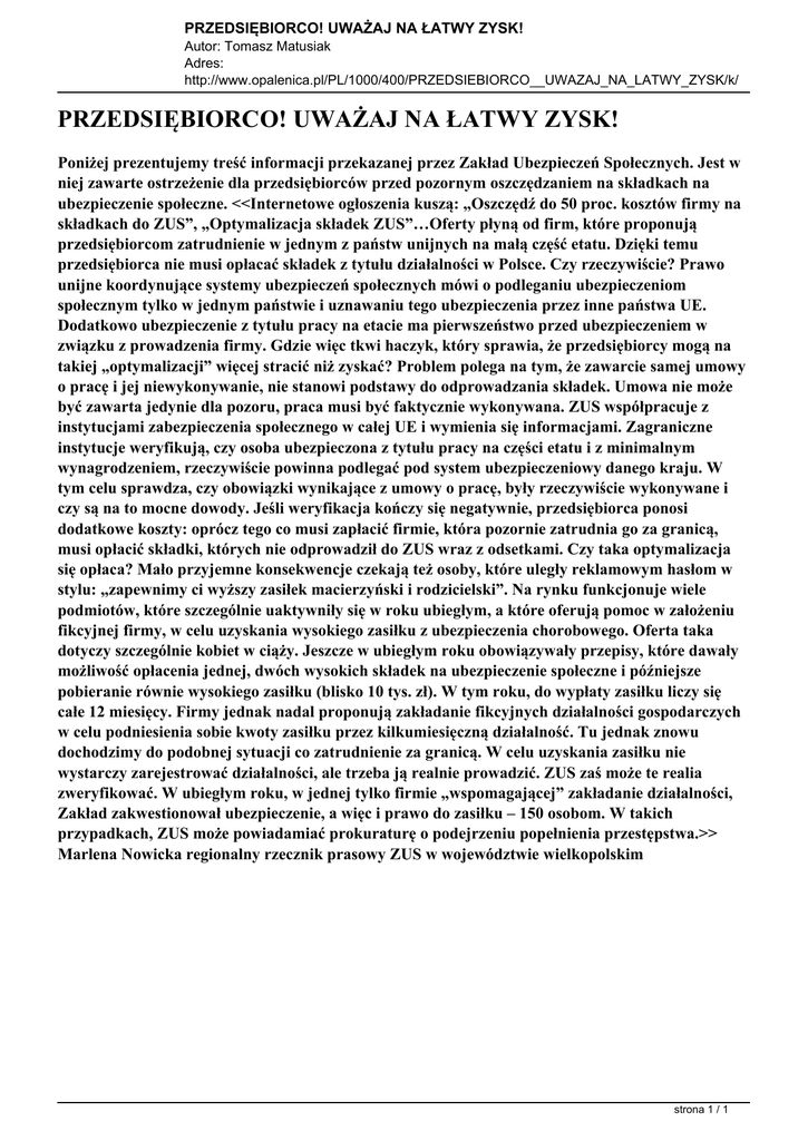 PRZEDSIĘBIORCO! UWAŻAJ NA ŁATWY ZYSK! Autor: Tomasz Matusiak Adres: http://www.opalenica.pl/PL/1000/400/PRZEDSIEBIORCO__UWAZAJ_NA_LATWY_ZYSK/k/ PRZEDSIĘBIORCO! UWAŻAJ NA ŁATWY ZYSK! Poniżej prezentujemy treść informacji przekazanej przez Zakład Ubezpieczeń Społecznych. Jest w niej zawarte ostrzeżenie dla przedsiębiorców przed pozornym oszczędzaniem na składkach na ubezpieczenie społeczne. <<Internetowe ogłoszenia kuszą: „Oszczędź do 50 proc. kosztów firmy na składkach do ZUS”, „Optymalizacja składek ZUS”…Oferty płyną od firm, które proponują przedsiębiorcom zatrudnienie w jednym z państw unijnych na małą część etatu. Dzięki temu przedsiębiorca nie musi opłacać składek z tytułu działalności w Polsce. Czy rzeczywiście? Prawo unijne koordynujące systemy ubezpieczeń społecznych mówi o podleganiu ubezpieczeniom społecznym tylko w jednym państwie i uznawaniu tego ubezpieczenia przez inne państwa UE. Dodatkowo ubezpieczenie z tytułu pracy na etacie ma pierwszeństwo przed ubezpieczeniem w związku z prowadzenia firmy. Gdzie więc tkwi haczyk, który sprawia, że przedsiębiorcy mogą na takiej „optymalizacji” więcej stracić niż zyskać? Problem polega na tym, że zawarcie samej umowy o pracę i jej niewykonywanie, nie stanowi podstawy do odprowadzania składek. Umowa nie może być zawarta jedynie dla pozoru, praca musi być faktycznie wykonywana. ZUS współpracuje z instytucjami zabezpieczenia społecznego w całej UE i wymienia się informacjami. Zagraniczne instytucje weryfikują, czy osoba ubezpieczona z tytułu pracy na części etatu i z minimalnym wynagrodzeniem, rzeczywiście powinna podlegać pod system ubezpieczeniowy danego kraju. W tym celu sprawdza, czy obowiązki wynikające z umowy o pracę, były rzeczywiście wykonywane i czy są na to mocne dowody. Jeśli weryfikacja kończy się negatywnie, przedsiębiorca ponosi dodatkowe koszty: oprócz tego co musi zapłacić firmie, która pozornie zatrudnia go za granicą, musi opłacić składki, których nie odprowadził do ZUS wraz z odsetkami. Czy taka optymalizacja się opłaca? Mało przyjemne konsekwencje czekają też osoby, które uległy reklamowym hasłom w stylu: „zapewnimy ci wyższy zasiłek macierzyński i rodzicielski”. Na rynku funkcjonuje wiele podmiotów, które szczególnie uaktywniły się w roku ubiegłym, a które oferują pomoc w założeniu fikcyjnej firmy, w celu uzyskania wysokiego zasiłku z ubezpieczenia chorobowego. Oferta taka dotyczy szczególnie kobiet w ciąży. Jeszcze w ubiegłym roku obowiązywały przepisy, które dawały możliwość opłacenia jednej, dwóch wysokich składek na ubezpieczenie społeczne i późniejsze pobieranie równie wysokiego zasiłku (blisko 10 tys. zł). W tym roku, do wypłaty zasiłku liczy się całe 12 miesięcy. Firmy jednak nadal proponują zakładanie fikcyjnych działalności gospodarczych w celu podniesienia sobie kwoty zasiłku przez kilkumiesięczną działalność. Tu jednak znowu dochodzimy do podobnej sytuacji co zatrudnienie za granicą. W celu uzyskania zasiłku nie wystarczy zarejestrować działalności, ale trzeba ją realnie prowadzić. ZUS zaś może te realia zweryfikować. W ubiegłym roku, w jednej tylko firmie „wspomagającej” zakładanie działalności, Zakład zakwestionował ubezpieczenie, a więc i prawo do zasiłku – 150 osobom. W takich przypadkach, ZUS może powiadamiać prokuraturę o podejrzeniu popełnienia przestępstwa.>> Marlena Nowicka regionalny rzecznik prasowy ZUS w województwie wielkopolskim strona 1 / 1 Powered by TCPDF (www.tcpdf.org)