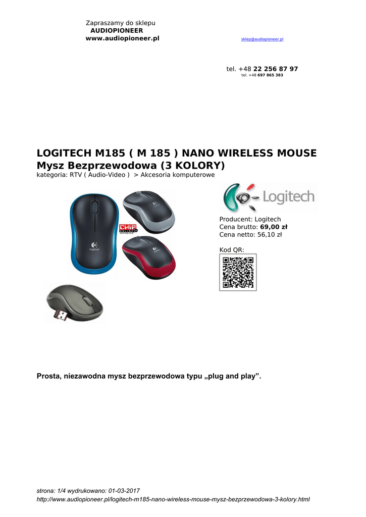 Zapraszamy do sklepu AUDIOPIONEER www.audiopioneer.pl [email protected] tel. +48 22 256 87 97 tel. +48 697 865 383 LOGITECH M185 ( M 185 ) NANO WIRELESS MOUSE Mysz Bezprzewodowa (3 KOLORY) kategoria: RTV ( Audio-Video ) > Akcesoria komputerowe Producent: Logitech Cena brutto: 69,00 zł Cena netto: 56,10 zł Kod QR: Prosta, niezawodna mysz bezprzewodowa typu „plug and play”. strona: 1/4 wydrukowano: 01-03-2017 http://www.audiopioneer.pl/logitech-m185-nano-wireless-mouse-mysz-bezprzewodowa-3-kolory.html Niezawodna ??czno?? bezprzewodowa Brak zak?óce? i opó?nie?. Malutki odbiornik bezprzewodowy zapewnia po??czenie, na które mo?na liczy?. Zasilanie przez ca?y rok 12-miesi?czna ?ywotno?? baterii sprawia, ?e nie trzeba ich cz?sto wymienia?.* strona: 2/4 wydrukowano: 01-03-2017 http://www.audiopioneer.pl/logitech-m185-nano-wireless-mouse-mysz-bezprzewodowa-3-kolory.html Nie do zdarcia Teraz mo?esz cieszy? si? wysok? jako?ci? i niezawodno?ci?, z jakich znana jest firma Logitech. Oprócz tego otrzymasz 3-letni?, ograniczon? gwarancj? na sprz?t. * ?ywotno?? baterii zale?y od intensywno?ci u?ytkowania i charakteru pracy z komputerem. W zestawie znajdziemy odbiornik USB - najmniejszy model na ?wiecie. Mysz jest równie znakomita do pracy przy d?ugich dokumentach, jak i do precyzyjnego przewijania ró?nych list, slajdów i arkuszy kalkulacyjnych.P?aska konstrukcja sprawia, ?e urz?dzenie z ?atwo?ci? mie?ci si? w torbie notebooka. Wspó?pracuje zarówno z komputerami Mac, Chrome OS™ jak i z komputerami z systemem Windows®. Jest tak ma?y, ?e wystarczy pod??czy? go do portu USB i zapomnie? o nim. Nie rzuca si? w oczy. Koniec zmartwie? z powodu zgubionych odbiorników. Zyskujesz wysok? jako?? i niezawodno??, które uczyni?y z firmy Logitech ?wiatowego lidera w dziedzinie myszy, oraz trzyletni?, ograniczon? gwarancj? na sprz?t. Brak oprogramowania, brak problemów — wystarczy pod??czy? nanoodbiornik i mo?na od razu zacz?? korzysta? z myszy. Mysz wspó?pracuje z systemami Windows, Mac, Chrome OS™ i Linux.Mo?esz mie? pewno??, ?e mysz b?dzie zawsze dzia?a? zgodnie z oczekiwaniami, niezale?nie od tego, jakiego komputera u?ywasz dzisiaj i jakiego b?dziesz u?ywa? w przysz?o?ci. K?opoty z bateriami znikn? na ca?y rok. Wy??cznik i inteligentny tryb u?pienia pomagaj? oszcz?dza? energi?. Korzystaj z niezawodno?ci porównywalnej do rozwi?za? przewodowych, ale bez kabli. Transmisja danych jest szybka; przebiega praktycznie bez opó?nie? i zak?óce?. Producent : Logitech Model : M185 Po??czenie z komputerem : bezprzewodowe Z??cza : USB Przeznaczenie : Do notebooków Typ myszy : optyczna Rozdzielczo?? pracy : 1000 dpi strona: 3/4 wydrukowano: 01-03-2017 http://www.audiopioneer.pl/logitech-m185-nano-wireless-mouse-mysz-bezprzewodowa-3-kolory.html Ilo?? klawiszy : 3 Ilo?? rolek : 1 Kolor myszy : czarny, czerwony, niebieski Sposób zasilania : 1 bateria AA Maksymalny czas pracy : 12mc Informacje dodatkowe : bezprzewodowa wolno?? ergonomiczny kszta?t zapakowana w blister Zawarto?? zestawu : Mysz Logitech M185 Mikro odbiornik 2.4 GHz Instrukcja obs?ugi bateria AA strona: 4/4 wydrukowano: 01-03-2017 http://www.audiopioneer.pl/logitech-m185-nano-wireless-mouse-mysz-bezprzewodowa-3-kolory.html