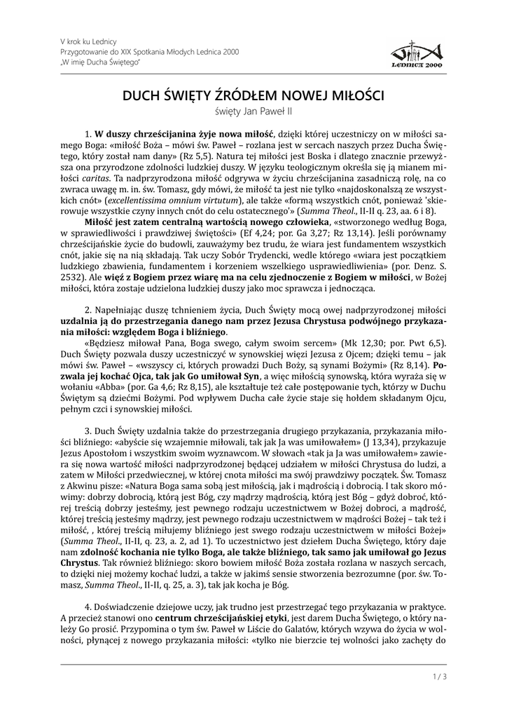V krok ku Lednicy Przygotowanie do XIX Spotkania Młodych Lednica 2000 „W imię Ducha Świętego” DUCH ŚWIĘTY ŹRÓDŁEM NOWEJ MIŁOŚCI święty Jan Paweł II 1. W duszy chrześcijanina żyje nowa miłość, dzięki której uczestniczy on w miłości samego Boga: «miłość Boża – mówi św. Paweł – rozlana jest w sercach naszych przez Ducha Świę tego, który został nam dany» (Rz 5,5). Natura tej miłości jest Boska i dlatego znacznie przewyż sza ona przyrodzone zdolności ludzkiej duszy. W języku teologicznym określa się ją mianem miłości caritas. Ta nadprzyrodzona miłość odgrywa w życiu chrześcijanina zasadniczą rolę, na co zwraca uwagę m. in. św. Tomasz, gdy mówi, że miłość ta jest nie tylko «najdoskonalszą ze wszystkich cnót» (excellentissima omnium virtutum), ale także «formą wszystkich cnót, ponieważ 'skierowuje wszystkie czyny innych cnót do celu ostatecznego'» (Summa Theol., II-II q. 23, aa. 6 i 8). Miłość jest zatem centralną wartością nowego człowieka, «stworzonego według Boga, w sprawiedliwości i prawdziwej świętości» (Ef 4,24; por. Ga 3,27; Rz 13,14). Jeśli porównamy chrześcijańskie życie do budowli, zauważymy bez trudu, że wiara jest fundamentem wszystkich cnót, jakie się na nią składają. Tak uczy Sobór Trydencki, wedle którego «wiara jest początkiem ludzkiego zbawienia, fundamentem i korzeniem wszelkiego usprawiedliwienia» (por. Denz. S. 2532). Ale więź z Bogiem przez wiarę ma na celu zjednoczenie z Bogiem w miłości, w Bożej miłości, która zostaje udzielona ludzkiej duszy jako moc sprawcza i jednocząca. 2. Napełniając duszę tchnieniem życia, Duch Święty mocą owej nadprzyrodzonej miłości uzdalnia ją do przestrzegania danego nam przez Jezusa Chrystusa podwójnego przykazania miłości: względem Boga i bliźniego. «Będziesz miłował Pana, Boga swego, całym swoim sercem» (Mk 12,30; por. Pwt 6,5). Duch Święty pozwala duszy uczestniczyć w synowskiej więzi Jezusa z Ojcem; dzięki temu – jak mówi św. Paweł – «wszyscy ci, których prowadzi Duch Boży, są synami Bożymi» (Rz 8,14). Pozwala jej kochać Ojca, tak jak Go umiłował Syn, a więc miłością synowską, która wyraża się w wołaniu «Abba» (por. Ga 4,6; Rz 8,15), ale kształtuje też całe postępowanie tych, którzy w Duchu Świętym są dziećmi Bożymi. Pod wpływem Ducha całe życie staje się hołdem składanym Ojcu, pełnym czci i synowskiej miłości. 3. Duch Święty uzdalnia także do przestrzegania drugiego przykazania, przykazania miłości bliźniego: «abyście się wzajemnie miłowali, tak jak Ja was umiłowałem» (J 13,34), przykazuje Jezus Apostołom i wszystkim swoim wyznawcom. W słowach «tak ja Ja was umiłowałem» zawiera się nowa wartość miłości nadprzyrodzonej będącej udziałem w miłości Chrystusa do ludzi, a zatem w Miłości przedwiecznej, w której cnota miłości ma swój prawdziwy początek. Św. Tomasz z Akwinu pisze: «Natura Boga sama sobą jest miłością, jak i mądrością i dobrocią. I tak skoro mó wimy: dobrzy dobrocią, którą jest Bóg, czy mądrzy mądrością, którą jest Bóg – gdyż dobroć, której treścią dobrzy jesteśmy, jest pewnego rodzaju uczestnictwem w Bożej dobroci, a mądrość, której treścią jesteśmy mądrzy, jest pewnego rodzaju uczestnictwem w mądrości Bożej – tak też i miłość, , której treścią miłujemy bliźniego jest swego rodzaju uczestnictwem w miłości Bożej» (Summa Theol., II-II, q. 23, a. 2, ad 1). To uczestnictwo jest dziełem Ducha Świętego, który daje nam zdolność kochania nie tylko Boga, ale także bliźniego, tak samo jak umiłował go Jezus Chrystus. Tak również bliźniego: skoro bowiem miłość Boża została rozlana w naszych sercach, to dzięki niej możemy kochać ludzi, a także w jakimś sensie stworzenia bezrozumne (por. św. Tomasz, Summa Theol., II-II, q. 25, a. 3), tak jak kocha je Bóg. 4. Doświadczenie dziejowe uczy, jak trudno jest przestrzegać tego przykazania w praktyce. A przecież stanowi ono centrum chrześcijańskiej etyki, jest darem Ducha Świętego, o który należy Go prosić. Przypomina o tym św. Paweł w Liście do Galatów, których wzywa do życia w wolności, płynącej z nowego przykazania miłości: «tylko nie bierzcie tej wolności jako zachęty do 1/3 V krok ku Lednicy Przygotowanie do XIX Spotkania Młodych Lednica 2000 „W imię Ducha Świętego” hołdowania ciału, wręcz przeciwnie, miłością ożywieni służcie sobie wzajemnie! Bo całe Prawo wypełnia się w tym jednym nakazie: Będziesz miłował bliźniego swego jak siebie samego» (Ga 5,13-14). Następnie przestrzega: «Oto, czego uczę: postępujcie według ducha, a nie spełnicie pożądania ciała» (Ga 5,16) i wskazuje na miłość (agape) jako na pierwszy owoc ducha (por. Ga 5,22). To Duch Święty zatem prowadzi nas drogą miłości i uczy przezwyciężać wszelkie przeszkody, które na niej stają. 5. W Pierwszym Liście do Koryntian św. Paweł poświęca dłuższy fragment wyliczeniu i opisowi cech miłości bliźniego. «Lecz wy starajcie się o większe dary» (1 Kor 12,31), wzywa, a następnie wygłasza pochwałę miłości, która przewyższa wszystkie inne nadzwyczajne dary udzielane przez Ducha Świętego i odgrywa fundamentalną rolę w życiu chrześcijanina. Można powiedzieć, że ów Hymn o miłości, wypływający z ust i serca Pawła, jest niejako hymnem na cześć Ducha Świętego, kształtującego postępowanie człowieka. Ukazuje on wymiar etyczny miłości, a jednocześnie jej konkretne przejawy: «Miłość cierpliwa jest, łaskawa jest. Miłość nie zazdrości, nie szuka poklasku, nie unosi się pychą; nie dopuszcza się bezwstydu, nie szuka swego, nie unosi się gniewem, nie pamięta złego; nie cieszy się z niesprawiedliwości, lecz współweseli się z prawdą. Wszystko znosi, wszystkiemu wierzy, we wszystkim pokłada nadzieję, wszystko przetrzyma»