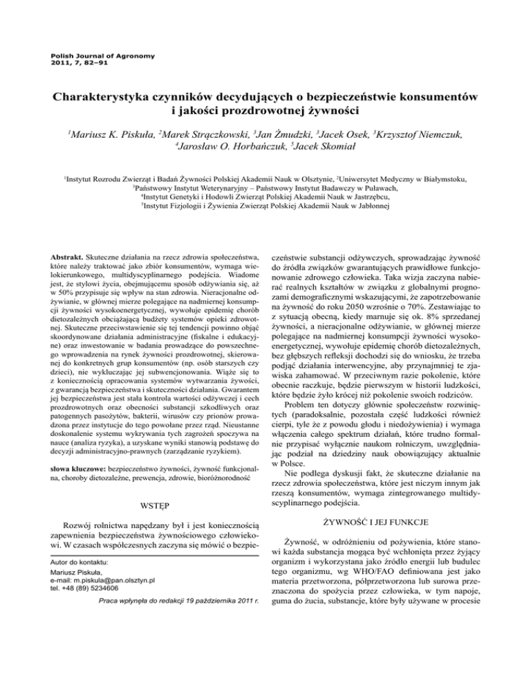 82 Polish Journal of Agronomy, No. 7, 2011 Polish Journal of Agronomy 2011, 7, 82–91 Charakterystyka czynników decydujących o bezpieczeństwie konsumentów i jakości prozdrowotnej żywności 1 1 Mariusz K. Piskuła, 2Marek Strączkowski, 3Jan Żmudzki, 3Jacek Osek, 3Krzysztof Niemczuk, 4 Jarosław O. Horbańczuk, 5Jacek Skomiał Instytut Rozrodu Zwierząt i Badań Żywności Polskiej Akademii Nauk w Olsztynie, 2Uniwersytet Medyczny w Białymstoku, 3 Państwowy Instytut Weterynaryjny – Państwowy Instytut Badawczy w Puławach, 4 Instytut Genetyki i Hodowli Zwierząt Polskiej Akademii Nauk w Jastrzębcu, 5 Instytut Fizjologii i Żywienia Zwierząt Polskiej Akademii Nauk w Jabłonnej Abstrakt. Skuteczne działania na rzecz zdrowia społeczeństwa, które należy traktować jako zbiór konsumentów, wymaga wielokierunkowego, multidyscyplinarnego podejścia. Wiadome jest, że stylowi życia, obejmującemu sposób odżywiania się, aż w 50% przypisuje się wpływ na stan zdrowia. Nieracjonalne odżywianie, w głównej mierze polegające na nadmiernej konsumpcji żywności wysokoenergetycznej, wywołuje epidemię chorób dietozależnych obciążającą budżety systemów opieki zdrowotnej. Skuteczne przeciwstawienie się tej tendencji powinno objąć skoordynowane działania administracyjne (fiskalne i edukacyjne) oraz inwestowanie w badania prowadzące do powszechnego wprowadzenia na rynek żywności prozdrowotnej, skierowanej do konkretnych grup konsumentów (np. osób starszych czy dzieci), nie wykluczając jej subwencjonowania. Wiąże się to z koniecznością opracowania systemów wytwarzania żywości, z gwarancją bezpieczeństwa i skuteczności działania. Gwarantem jej bezpieczeństwa jest stała kontrola wartości odżywczej i cech prozdrowotnych oraz obecności substancji szkodliwych oraz patogennych pasożytów, bakterii, wirusów czy prionów prowadzona przez instytucje do tego powołane przez rząd. Nieustanne doskonalenie systemu wykrywania tych zagrożeń spoczywa na nauce (analiza ryzyka), a uzyskane wyniki stanowią podstawę do decyzji administracyjno-prawnych (zarządzanie ryzykiem). słowa kluczowe: bezpieczeństwo żywności, żywność funkcjonalna, choroby dietozależne, prewencja, zdrowie, bioróżnorodność WSTĘP Rozwój rolnictwa napędzany był i jest koniecznością zapewnienia bezpieczeństwa żywnościowego człowiekowi. W czasach współczesnych zaczyna się mówić o bezpieAutor do kontaktu: Mariusz Piskuła, e-mail: [email protected] tel. +48 (89) 5234606 Praca wpłynęła do redakcji 19 października 2011 r. czeństwie substancji odżywczych, sprowadzając żywność do źródła związków gwarantujących prawidłowe funkcjonowanie zdrowego człowieka. Taka wizja zaczyna nabierać realnych kształtów w związku z globalnymi prognozami demograficznymi wskazującymi, że zapotrzebowanie na żywność do roku 2050 wzrośnie o 70%. Zestawiając to z sytuacją obecną, kiedy marnuje się ok. 8% sprzedanej żywności, a nieracjonalne odżywianie, w głównej mierze polegające na nadmiernej konsumpcji żywności wysokoenergetycznej, wywołuje epidemię chorób dietozależnych, bez głębszych refleksji dochodzi się do wniosku, że trzeba podjąć działania interwencyjne, aby przynajmniej te zjawiska zahamować. W przeciwnym razie pokolenie, które obecnie raczkuje, będzie pierwszym w historii ludzkości, które będzie żyło krócej niż pokolenie swoich rodziców. Problem ten dotyczy głównie społeczeństw rozwiniętych (paradoksalnie, pozostała część ludzkości również cierpi, tyle że z powodu głodu i niedożywienia) i wymaga włączenia całego spektrum działań, które trudno formalnie przypisać wyłącznie naukom rolniczym, uwzględniając podział na dziedziny nauk obowiązujący aktualnie w Polsce. Nie podlega dyskusji fakt, że skuteczne działanie na rzecz zdrowia społeczeństwa, które jest niczym innym jak rzeszą konsumentów, wymaga zintegrowanego multidyscyplinarnego podejścia. ŻYWNOŚĆ I JEJ FUNKCJE Żywność, w odróżnieniu od pożywienia, które stanowi każda substancja mogąca być wchłonięta przez żyjący organizm i wykorzystana jako źródło energii lub budulec tego organizmu, wg WHO/FAO definiowana jest jako materia przetworzona, półprzetworzona lub surowa przeznaczona do spożycia przez człowieka, w tym napoje, guma do żucia, substancje, które były używane w procesie M.K. Piskuła i in. – Bezpieczna żywność prozdrowotna produkcji (przetwórczym), w przygotowaniu lub obróbce żywności, ale z wyłączeniem kosmetyków, produktów tytoniowych oraz substancji stosowanych wyłącznie jako lekarstwa (FAO and WHO, 2001). Pojmowanie funkcji żywności zależne jest albo od etapu postępu cywilizacyjnego, na którym znajduje się konsument, albo od jego statusu ekonomicznego. Dlatego też nadal dla jednych jest ona środkiem zapewniającym przetrwanie, dla drugich środkiem w profilaktyce zdrowia mającym zapewnić komfort życia, a dla niektórych nawet środkiem mającym przynieść efekt kosmetyczny. W zależności od konsumentów, do których jest kierowana, lub ze względu na sposób wytworzenia i efekty, jakie ma powodować, pojawiło się dużo określeń żywności, np. wzbogacona, tradycyjna, osobista, ekologiczna, naturalna, prozdrowotna, wygodna, funkcjonalna, organiczna itd. Jakkolwiek jeszcze można by ją określać ze względu na mniej lub bardziej uzasadnione kryteria, musi ona spełniać podstawowe kryterium – być bezpieczna dla konsumenta. Ze względu na znaczenie problemu, zapewnienie bezpiecznej żywności jest jednym z podstawowych zadań służb państwowych, bez których w systemie wolnego przepływu towarów i usług zagrożenia wynikające z braku ścisłego nadzoru są niewyobrażalne. ZNACZENIE KONTROLI POZOSTAŁOŚCI CHEMICZNYCH I ZANIECZYSZCZEŃ MIKROBIOLOGICZNYCH ŻYWNOŚCI W STRATEGII BEZPIECZEŃSTWA KONSUMENTÓW Jednym z podstawowych działań zapewniających bezpie